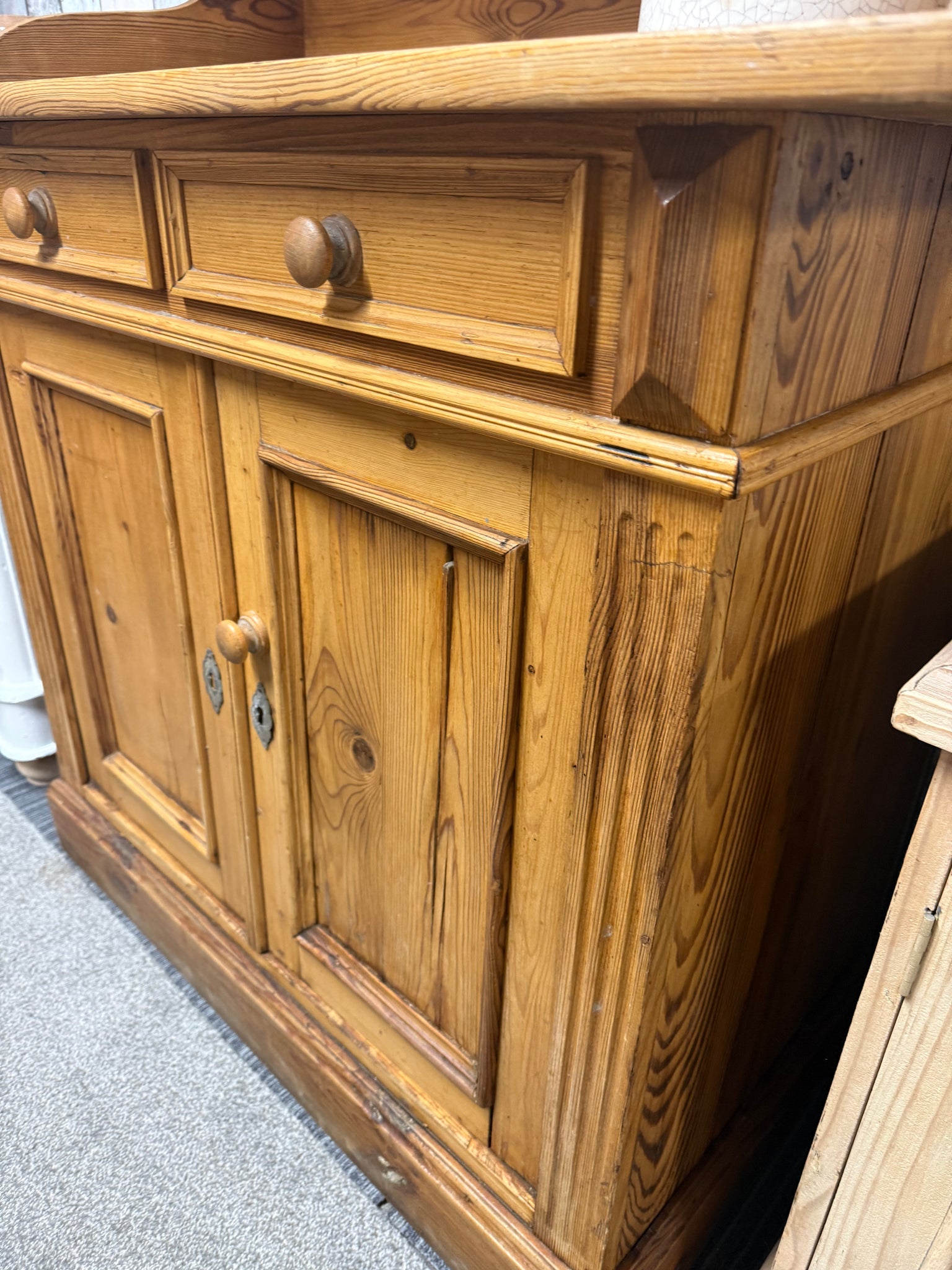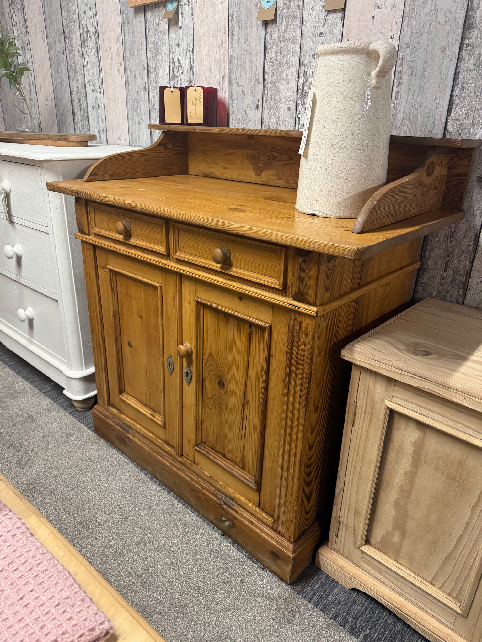 A charming vintage pine washstand that doubles as a sideboard, offering both character and practicality. Built to last, this piece shows its age with minor surface marks that add to its authentic appeal. The layout features two decorative faux drawers positioned above a spacious double cupboard, providing ample storage. Structurally solid and ready for everyday use, it's an ideal addition for those seeking genuine vintage furniture with genuine patina.