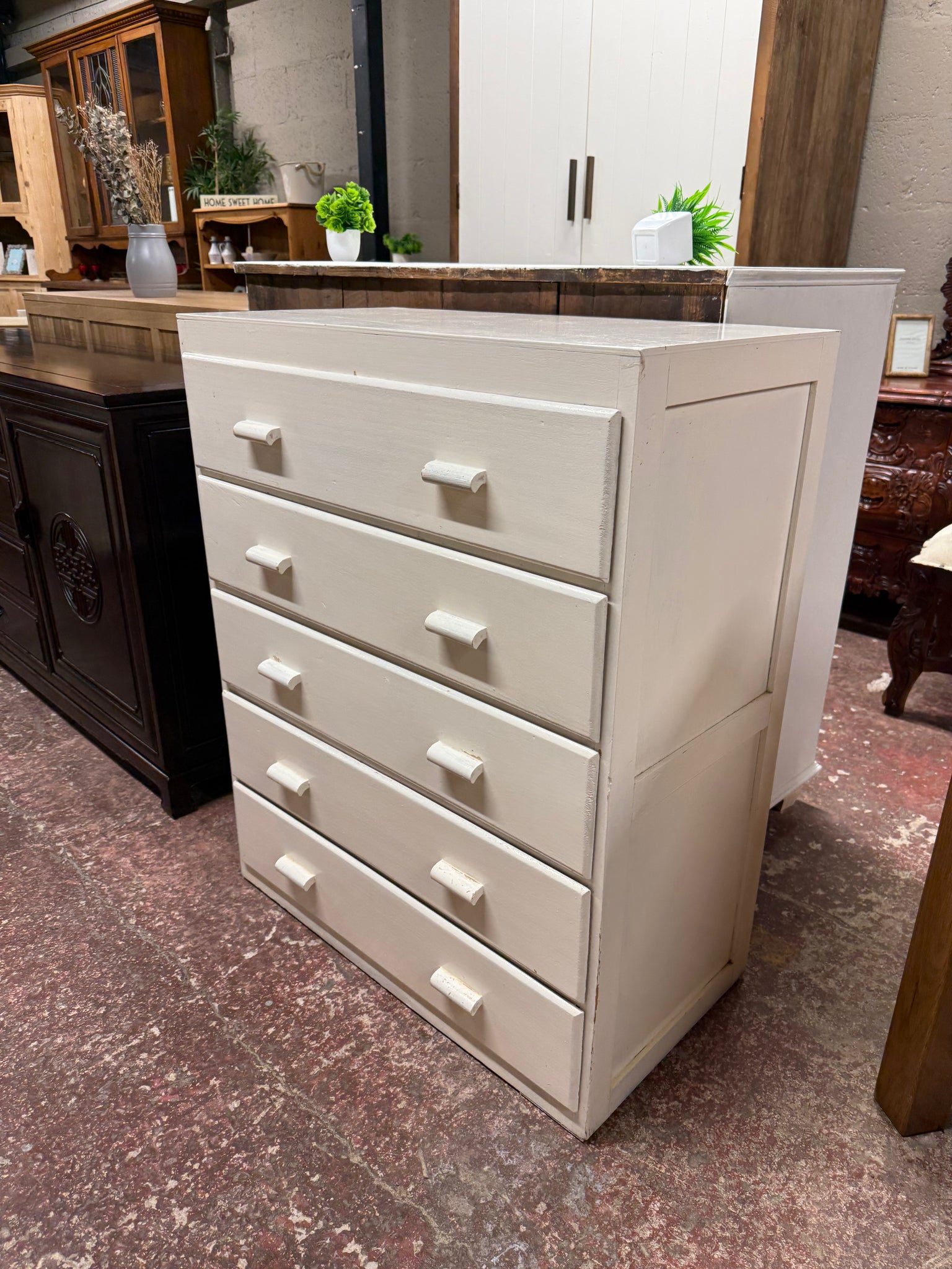 A practical storage solution featuring five spacious drawers, this chest combines functionality with reliable construction. Ideal for bedrooms, living spaces, or hallways, it offers ample room for clothing, linens, and household essentials.