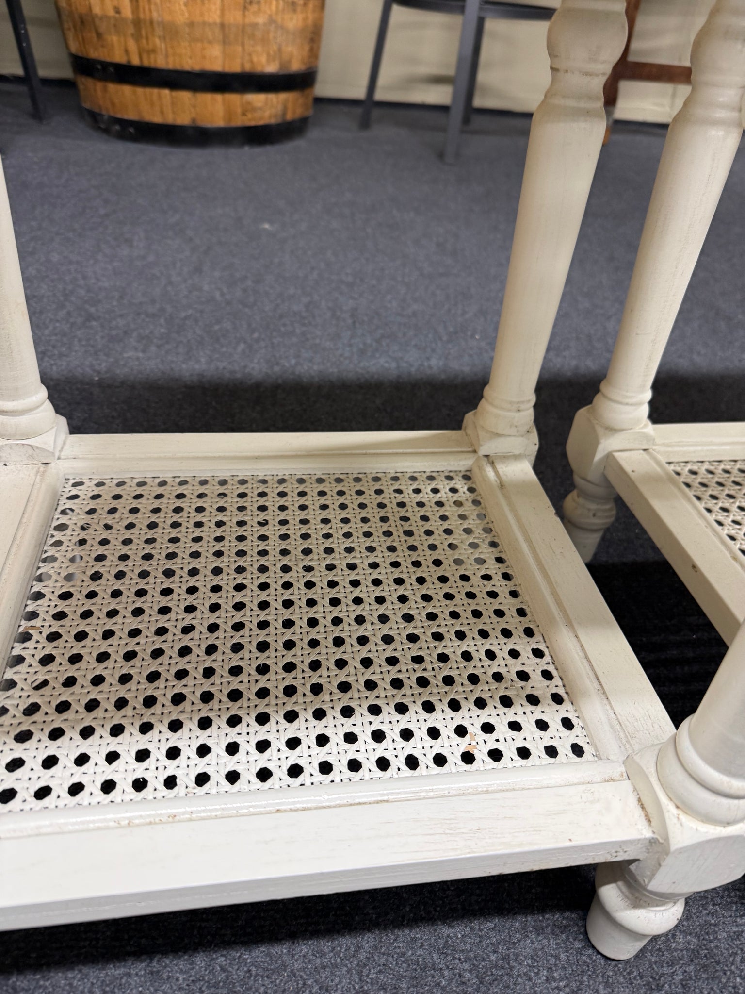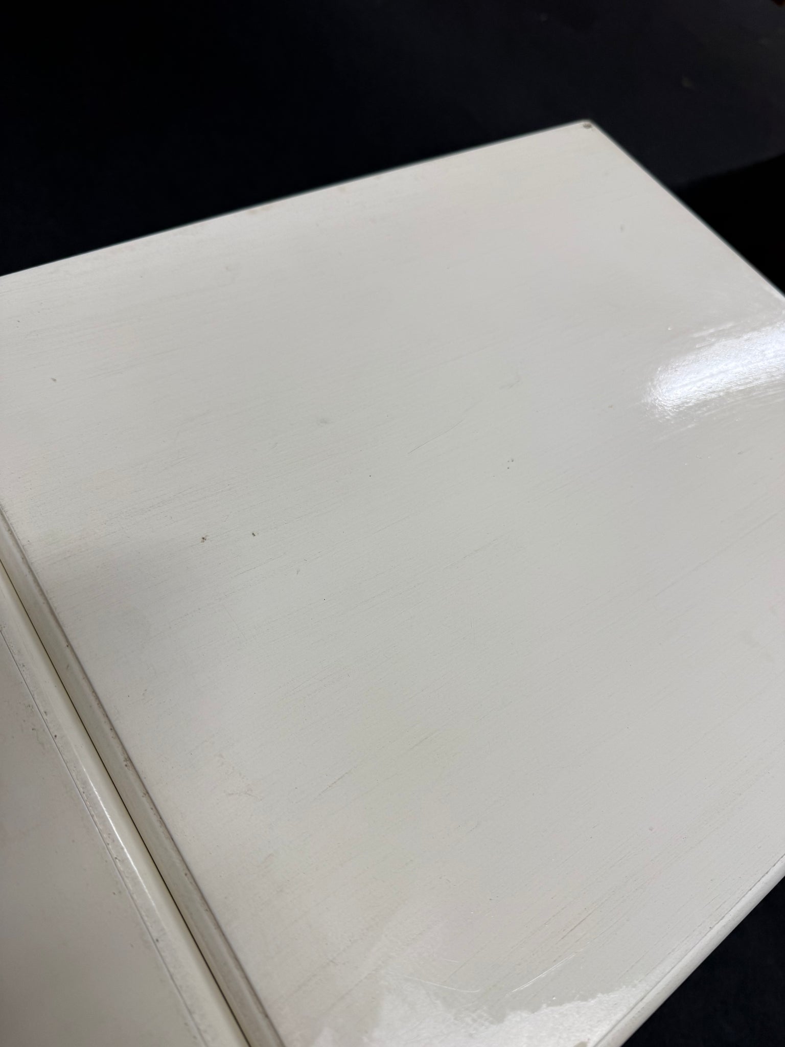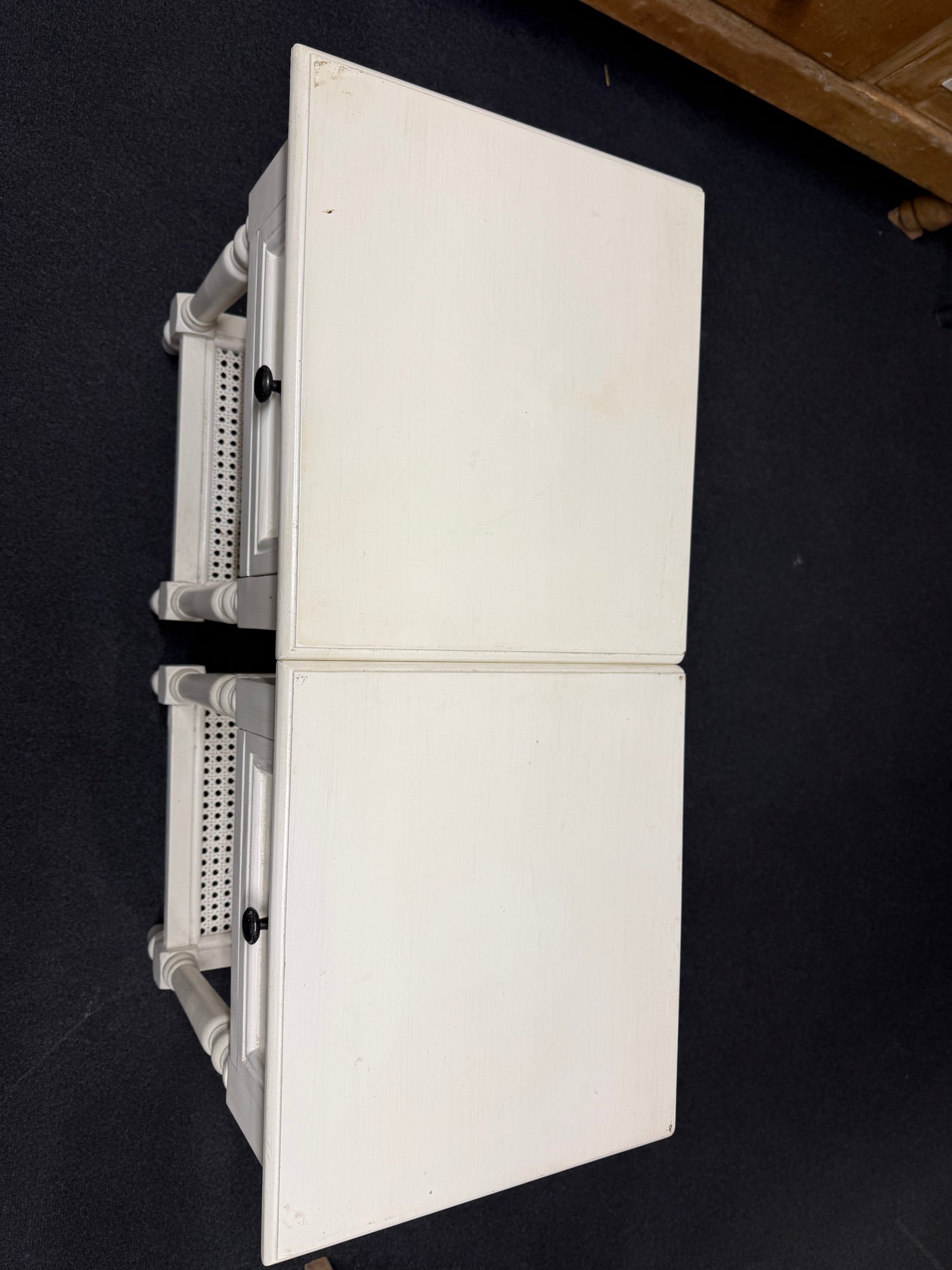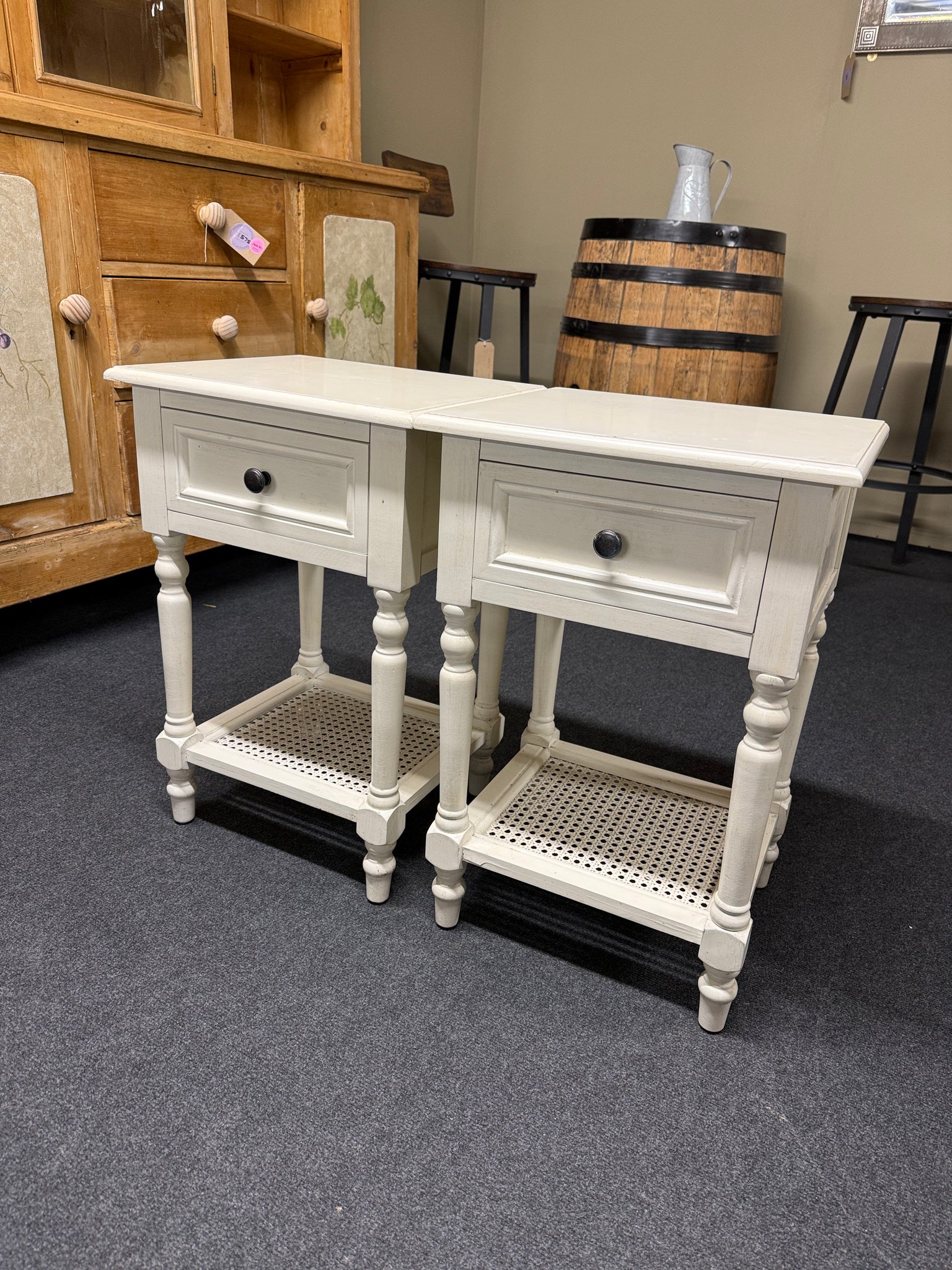 A charming pair of white French-style bedside tables, each featuring a practical drawer and lower shelf for convenient storage. These pieces showcase classic design elements and remain in solid working condition. Minor surface marks add to their authentic character, making them ideal for vintage-inspired or eclectic interiors.