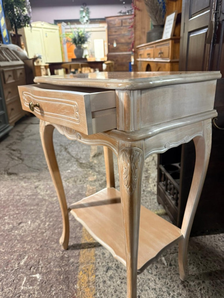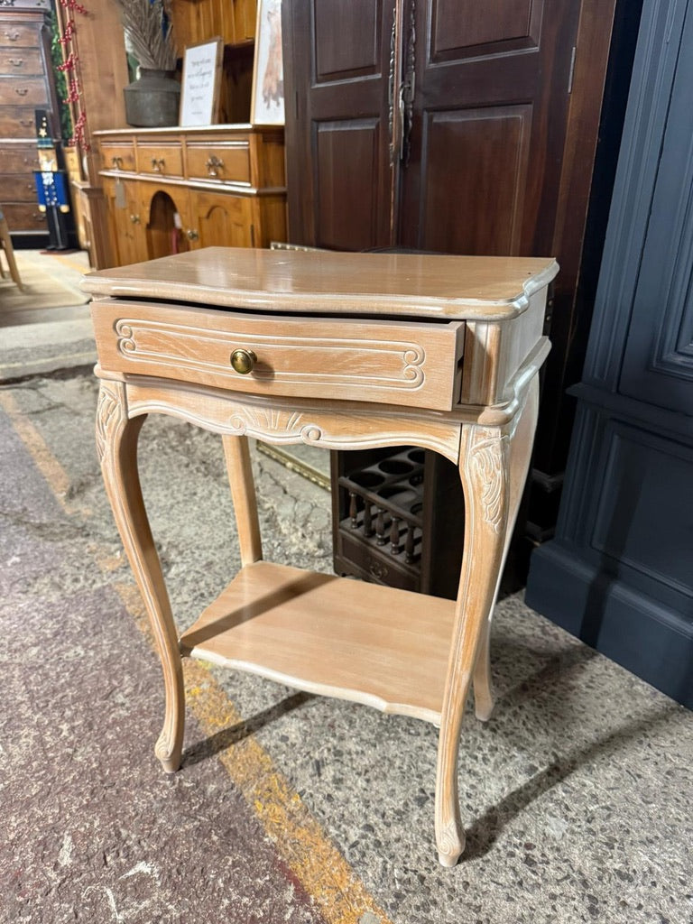 A charming limed side table that brings warmth and character to any bedroom or living space. Featuring a sturdy construction and thoughtful design, this piece offers practical storage with a convenient drawer and lower shelf—perfect for keeping essentials within easy reach. Its timeless finish and compact size make it an ideal companion for your bedside or as a stylish accent table.