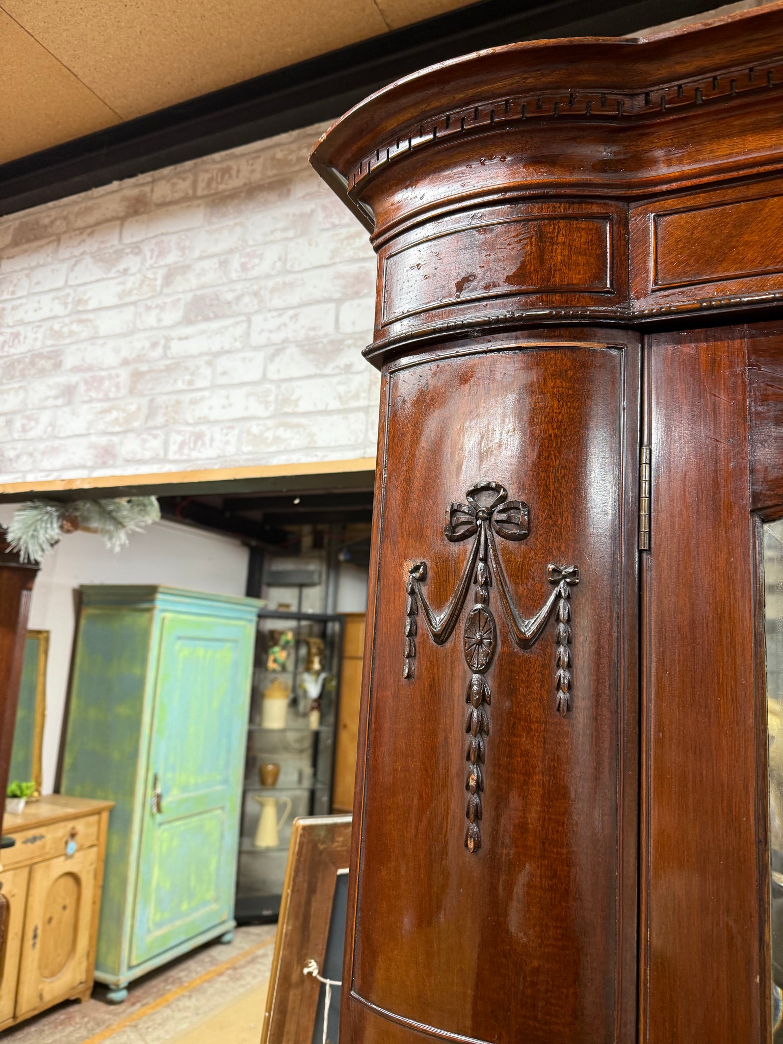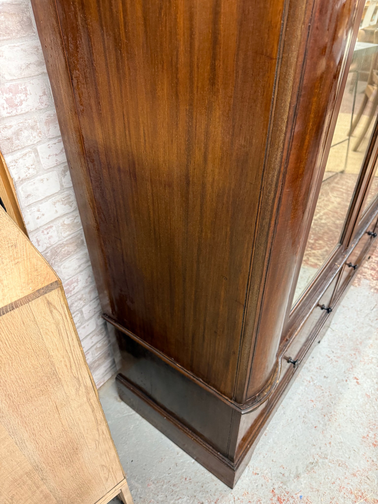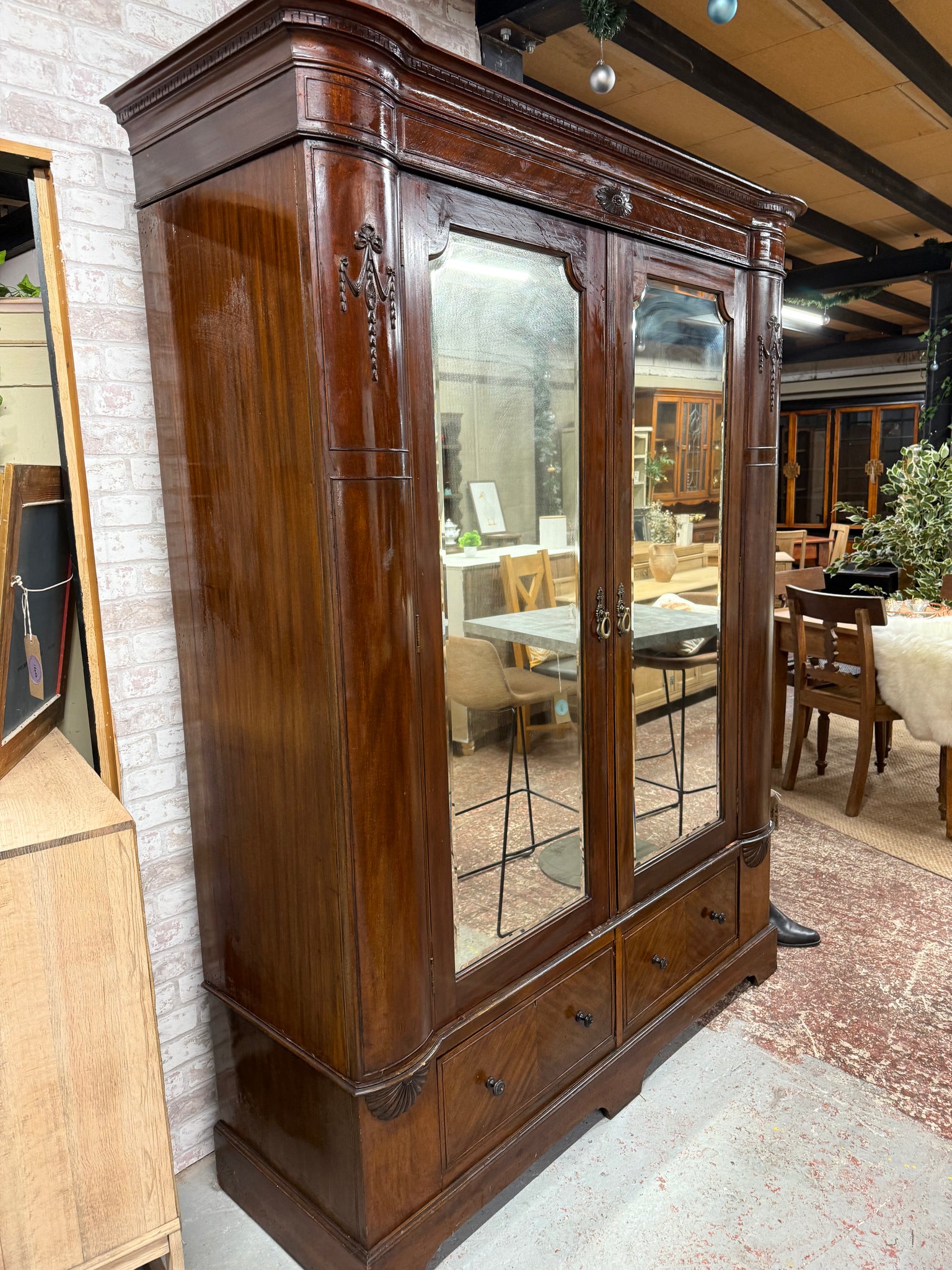A classic mahogany wardrobe built to last, featuring robust construction with minor cosmetic wear that speaks to its character. Inside, you'll find practical storage across four hanging rails, convenient hooks for accessories, and two dovetail-jointed drawers for folded items. Designed with practicality in mind, it disassembles into four sections for straightforward transport and installation.