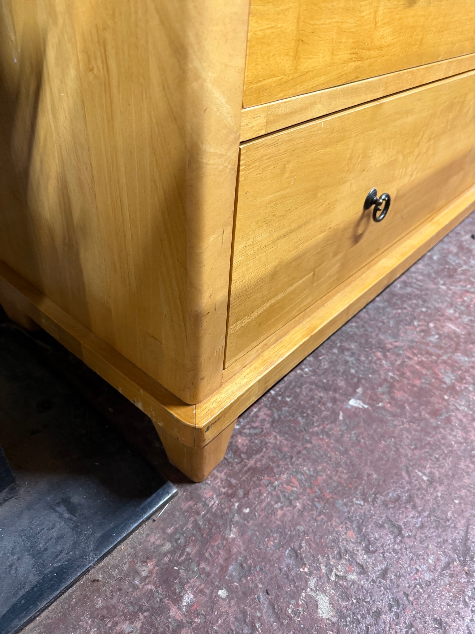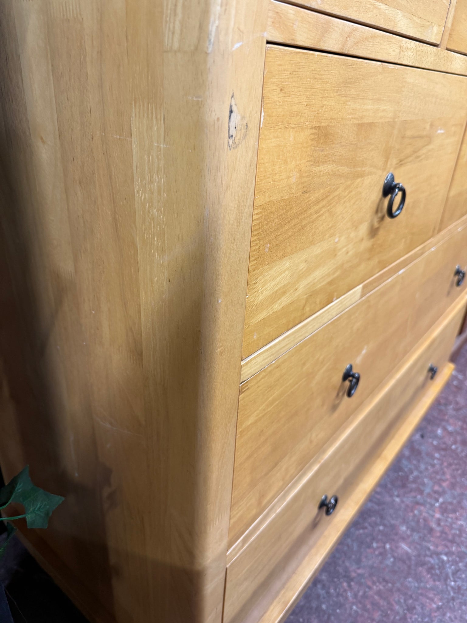Transform your space with this substantial oak chest of drawers—a versatile storage solution that adapts to your vision. Seven thoughtfully sized drawers, including three compact, two standard, and two large, provide flexible organisation for any room. The frame is robust and reliable, built to serve you well for years to come. There are a few surface marks. This piece is primed for personalisation, whether you envision a fresh coat of paint or a natural stain refresh.