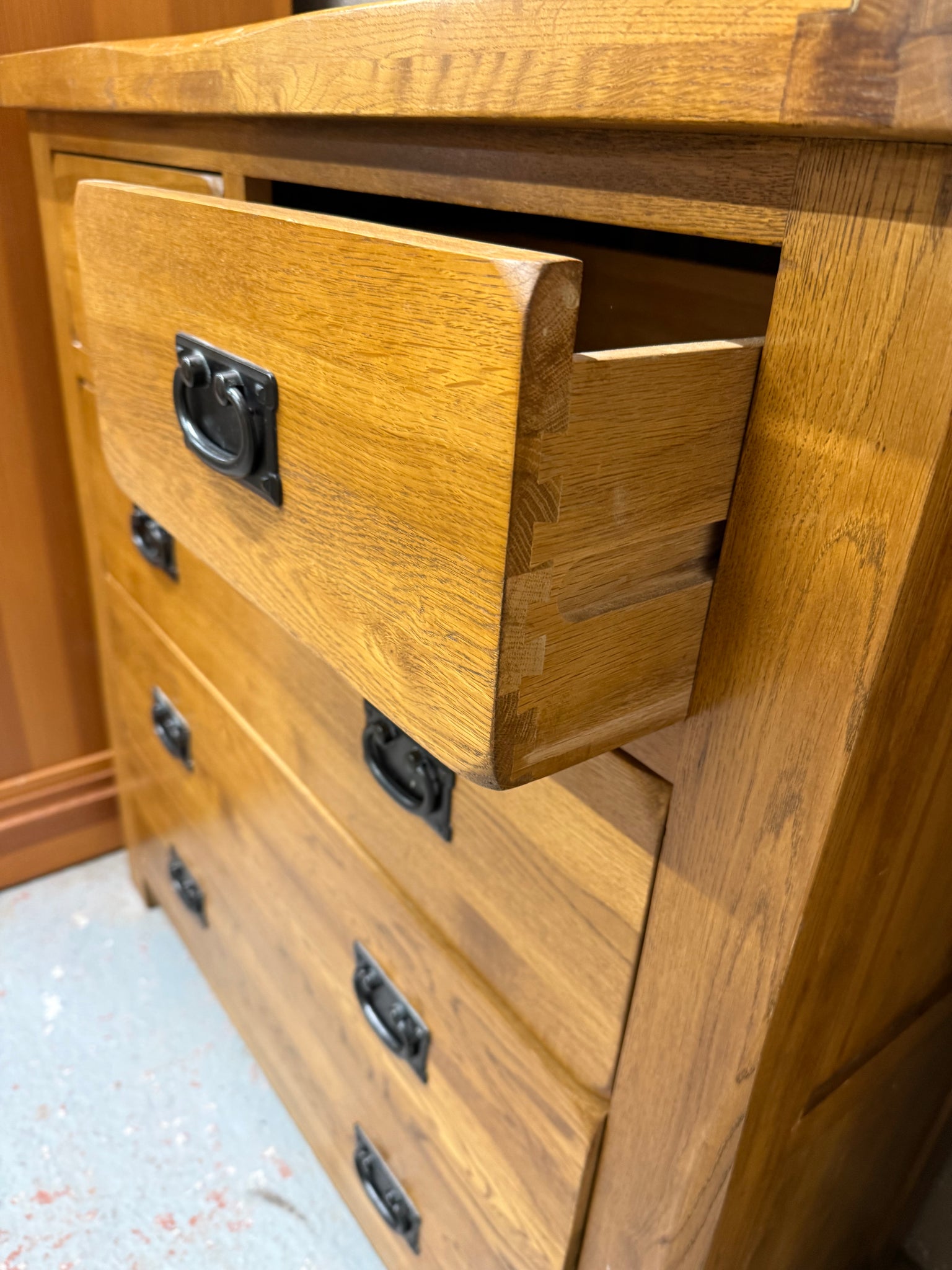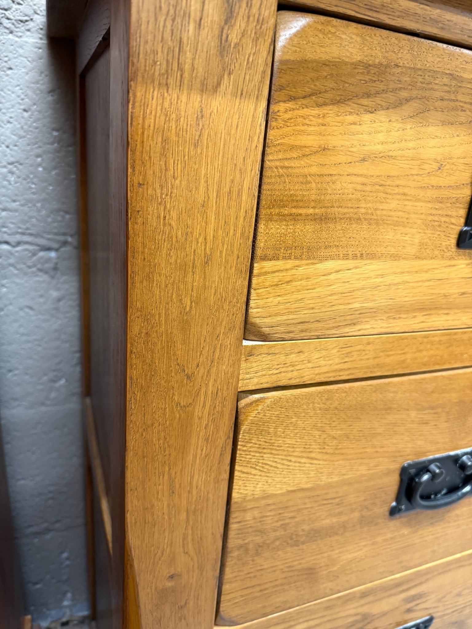 This beautiful oak chest of drawers from Oak Furniture Land is sturdy and in generally great shape. It shows some marks, mostly on the top, but these do not impact its functionality. The chest features two smaller dovetail-jointed drawers above three larger ones, combining style with practical storage.