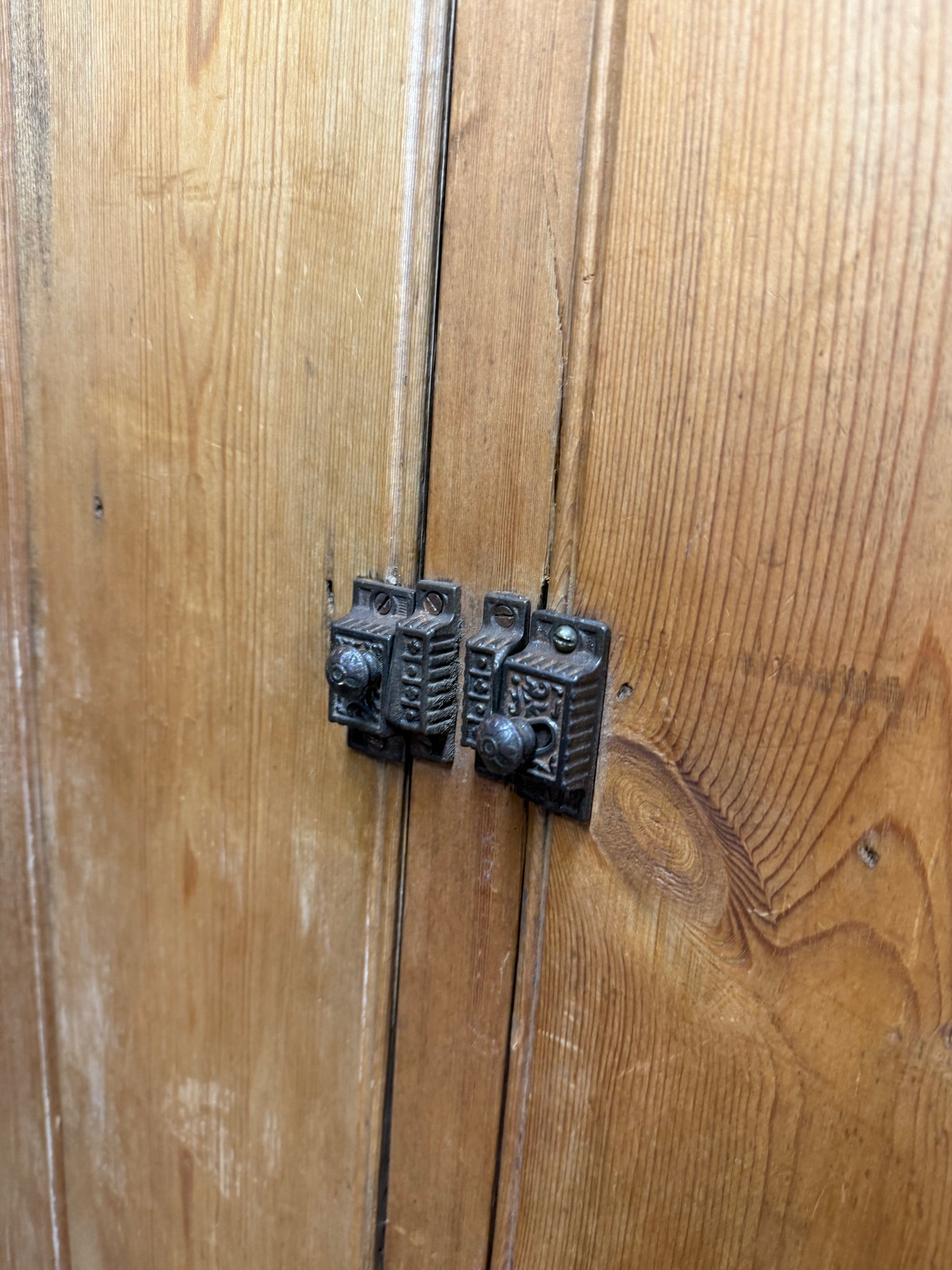 A beautiful vintage pine wardrobe that's built to last. Solid and dependable with character to spare, this piece bears the gentle marks of time that only enhance its appeal. Inside, you'll find a practical hanging rail, convenient hooks, and two spacious drawers—everything you need for organised storage. Perfect for adding authentic period charm to any bedroom.