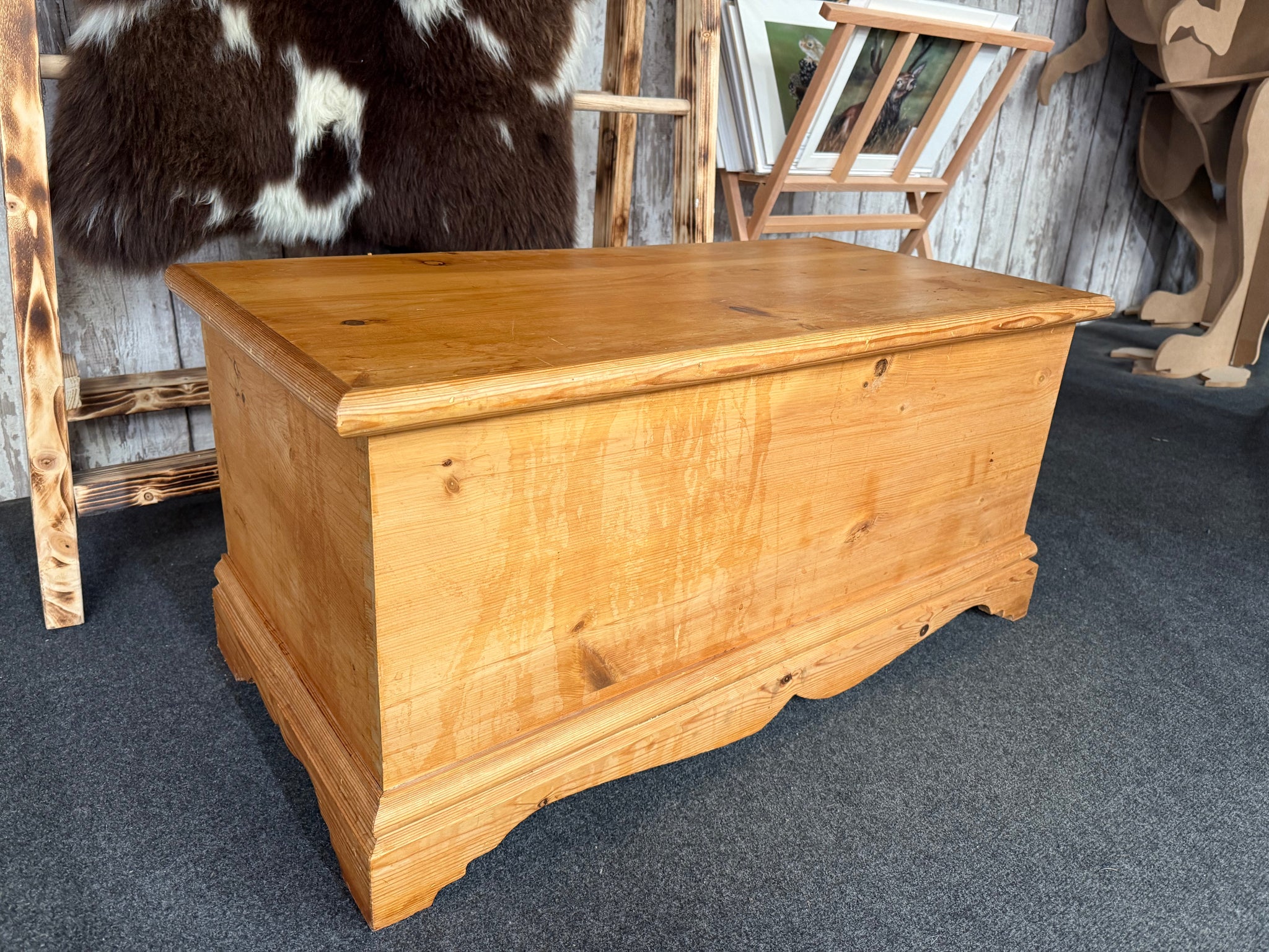 Built from solid pine, this blanket box combines reliable functionality with rustic charm. The weathered exterior reflects its history, though the frame remains structurally robust. A gentle sand could restore the finish to your preference. Perfect for tucking away blankets, children's toys, or off-season belongings, it delivers honest storage with timeless character.
