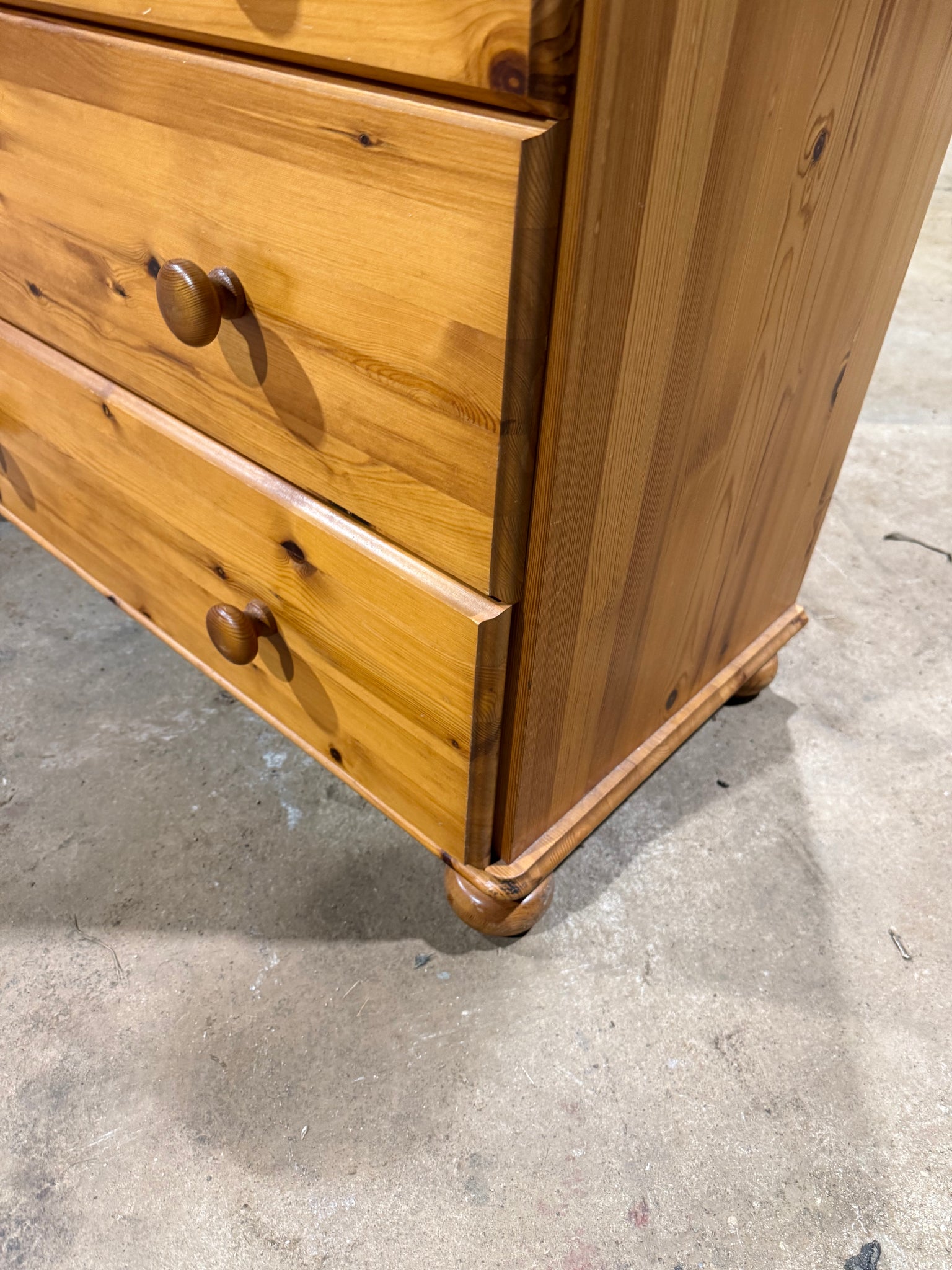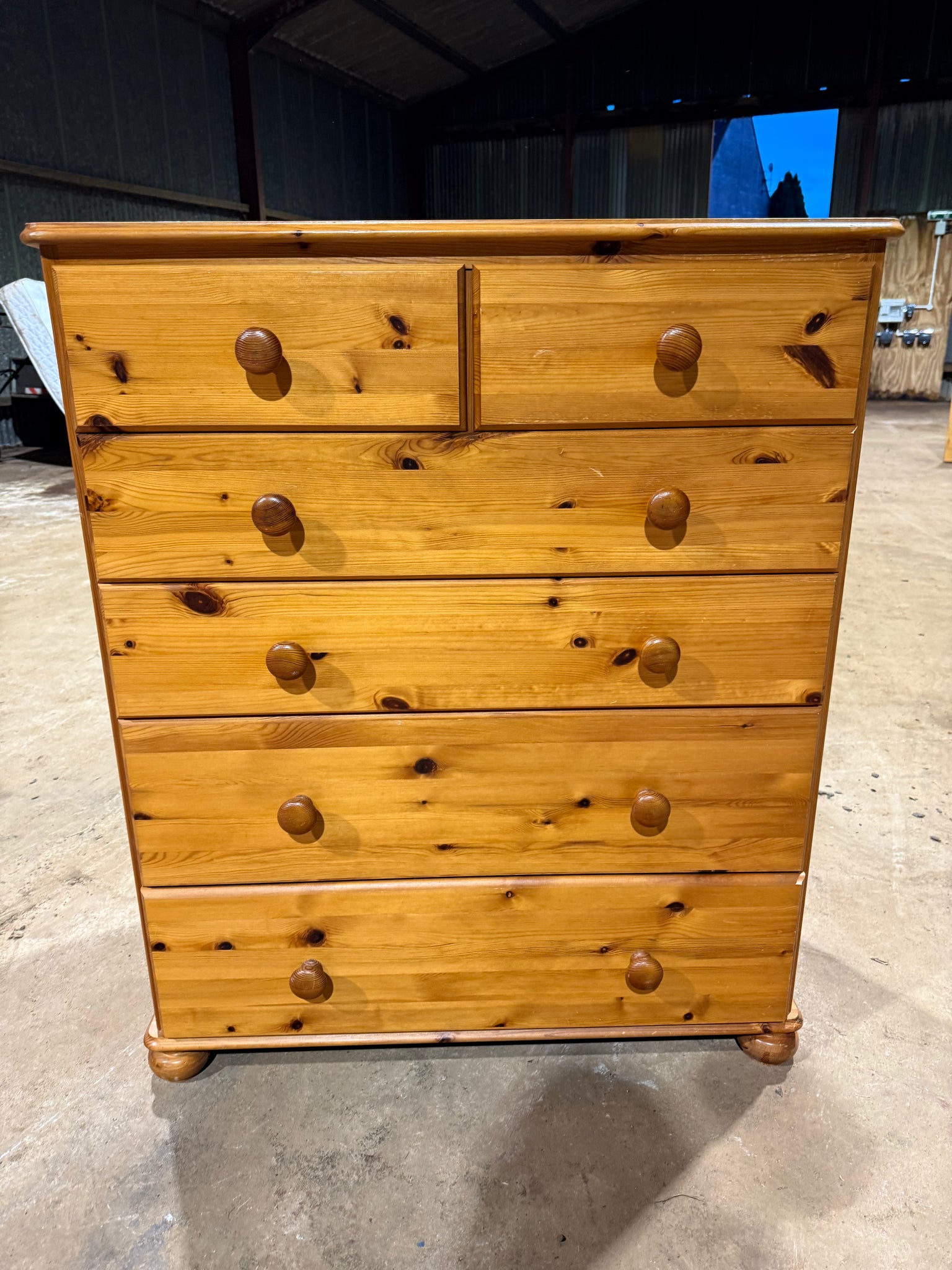 A well-maintained pine chest of drawers offering practical storage solutions. This pre-loved piece features two shallow drawers positioned above four spacious drawers, providing versatile organisation options. While showing natural signs of use with minor surface marks, the construction remains solid and fully functional. An honest, characterful addition to any bedroom or living space.