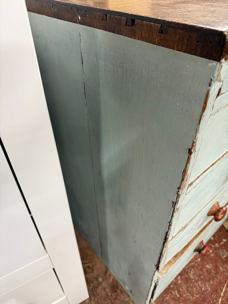 A characterful piece with genuine vintage appeal, this rustic oak chest combines practical storage with authentic period charm. The distressed finish and natural wear marks tell a story of years well-lived, whilst the solid construction ensures reliable everyday use. Five main drawers—two shallow and three deep—provide ample space, complemented by two concealed compartments at the top for treasured items. The blue-grey painted base contrasts beautifully with the warm oak surface. Minor imperfections, including surface marks, a crack on one drawer and some missing trim are present.