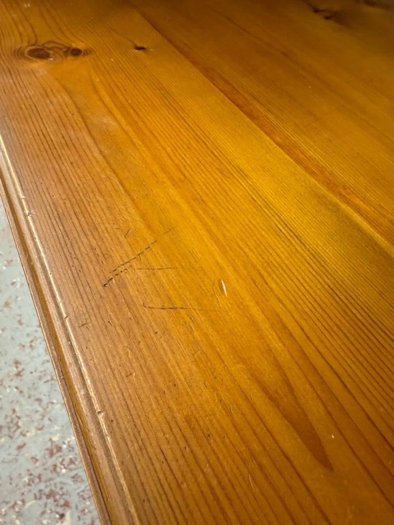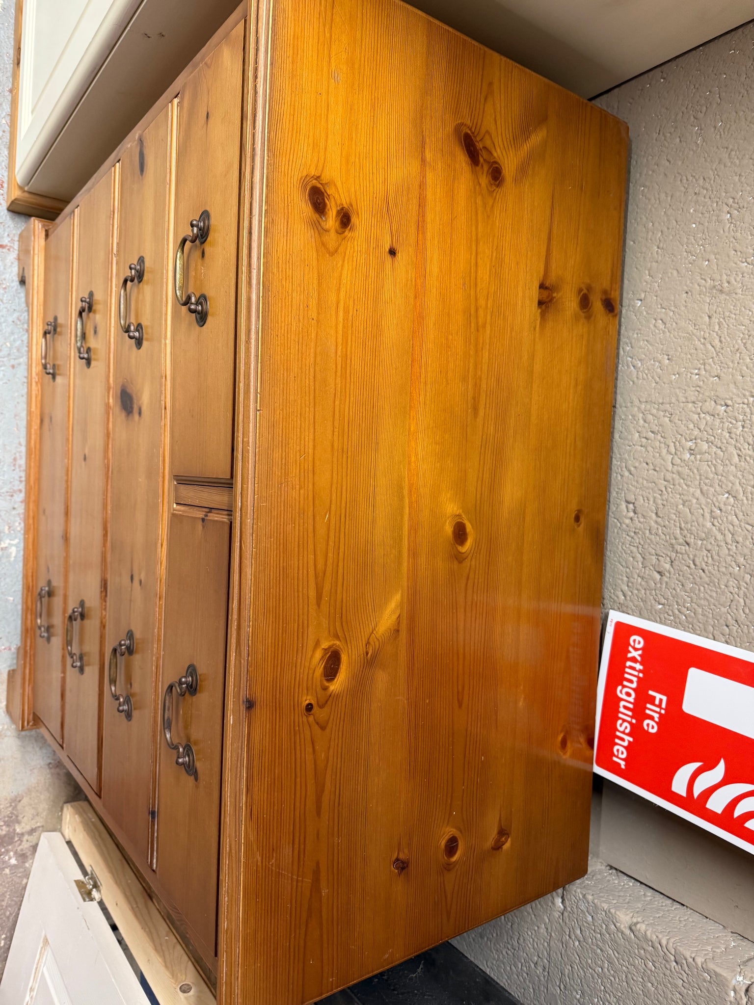 This beautiful solid pine chest of drawers is sturdy and in great overall shape. While it’s been used and shows a few minor marks, they don’t detract from its charm. Featuring two small dovetail-jointed drawers above three larger ones, it offers ample storage. Each drawer is adorned with elegant swan neck drop handles, adding a lovely touch to its timeless design.