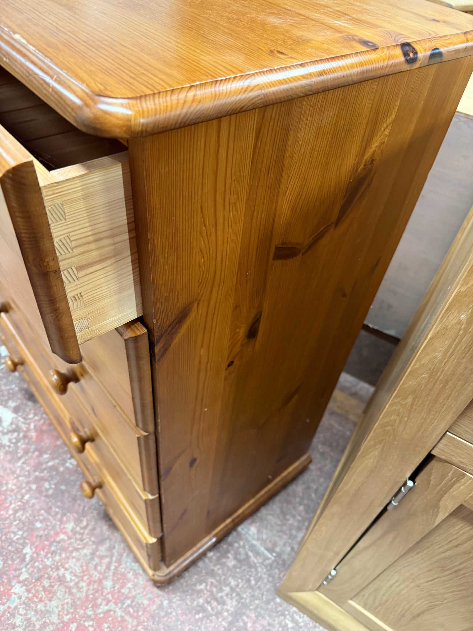 This sturdy solid pine chest of drawers is in great shape, showing just a few minor marks. It features five spacious drawers with dovetail joints, perfect for all your storage needs.