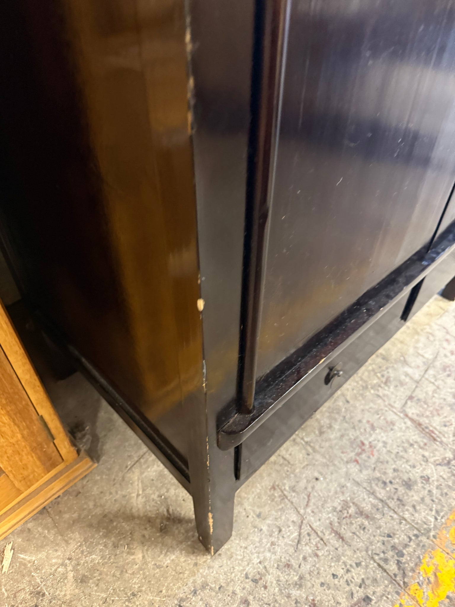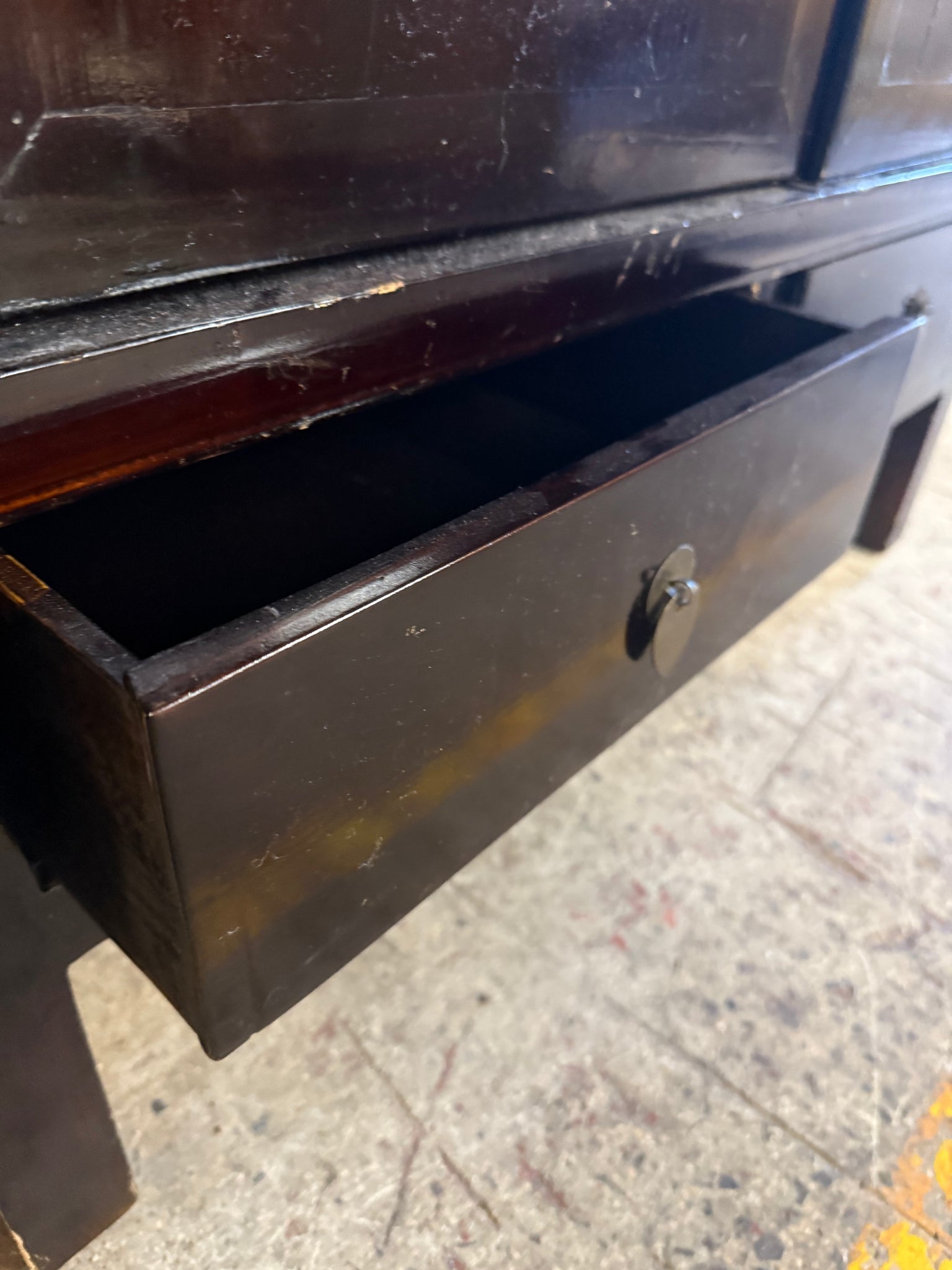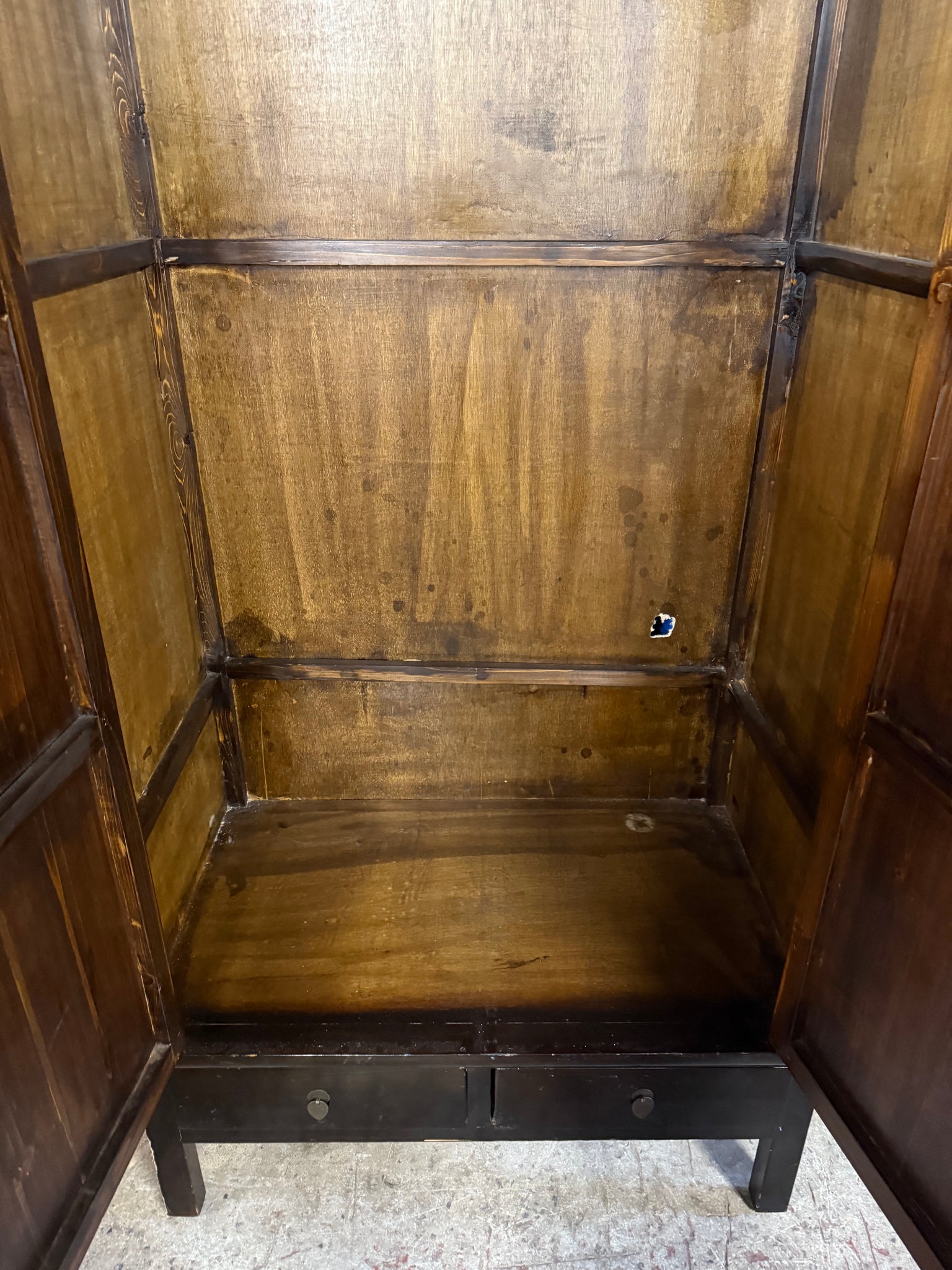 This beautiful chinese style wardrobe is structrually sound and generally well maintained. It shows some signs of use, including a few marks and a small hole on the back, but nothing too serious. Featuring one hanging rail and two drawers, it offers practical storage with charming character.