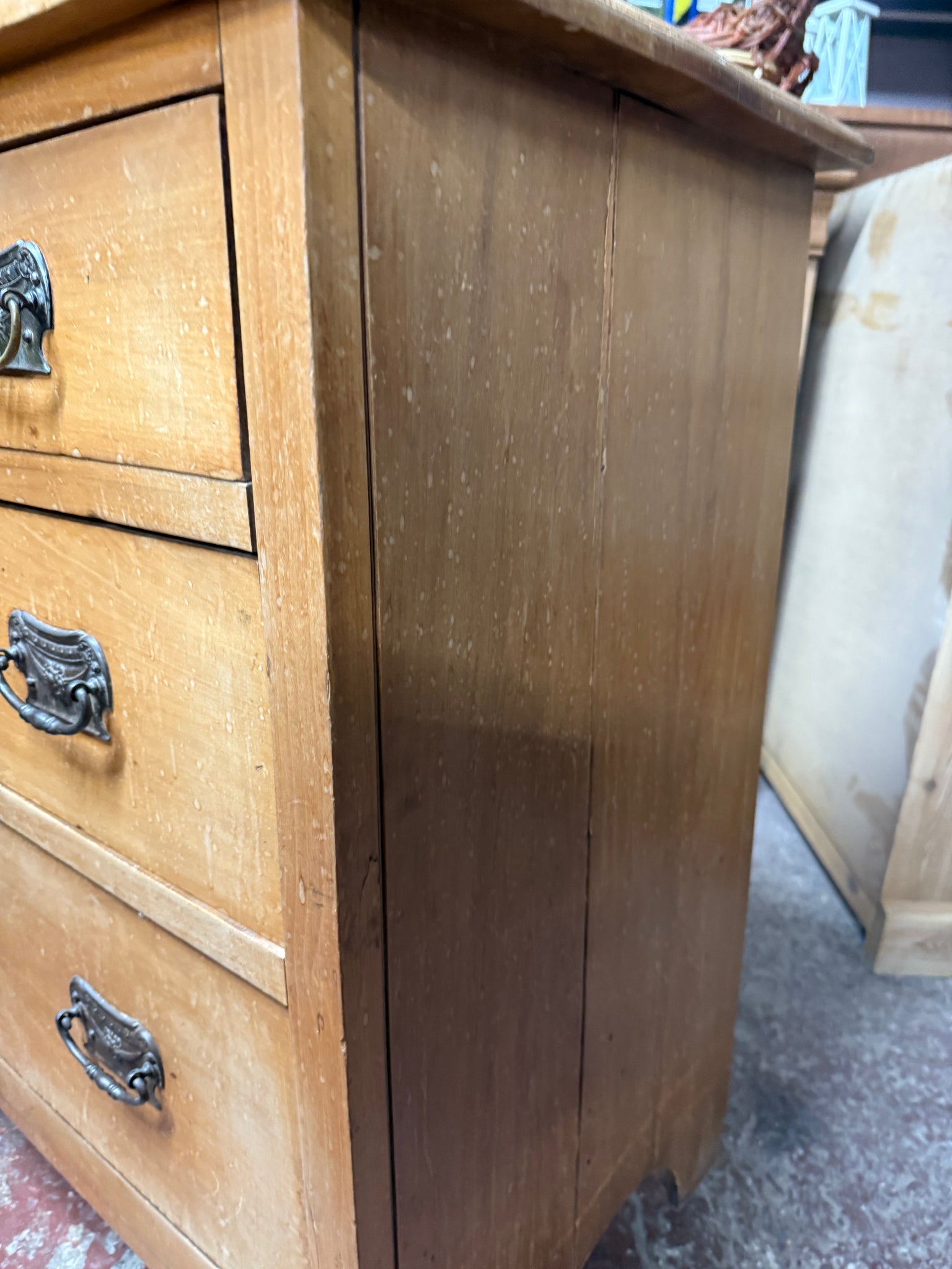 This beautiful Victorian satinwood chest of drawers is solidly built and generally well-preserved. While it shows some minor signs of use, the marks are'nt too bad. Previously, it featured a superstructure, which is why there are small holes on the top. It offers ample storage with three long drawers, each crafted with dovetail joints for durability.