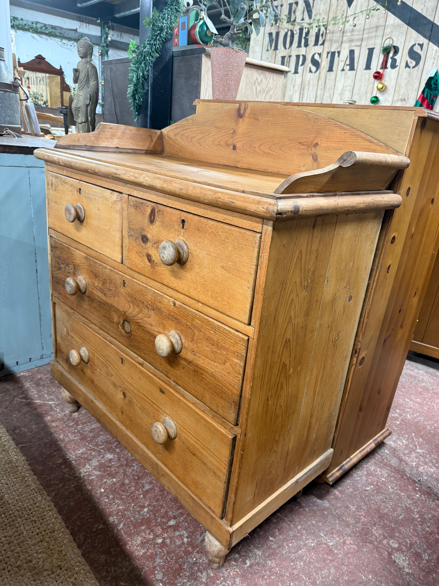 A well-preserved vintage pine chest of drawers with four generously proportioned drawers—two compact upper drawers and two larger lower ones—all featuring authentic dovetail joints. The piece remains structurally reliable and fully functional. Its weathered surface carries the natural patina of age; whilst some marks are permanent fixtures of its history, others will fade with careful polishing. An honest, characterful addition to period or eclectic interiors.