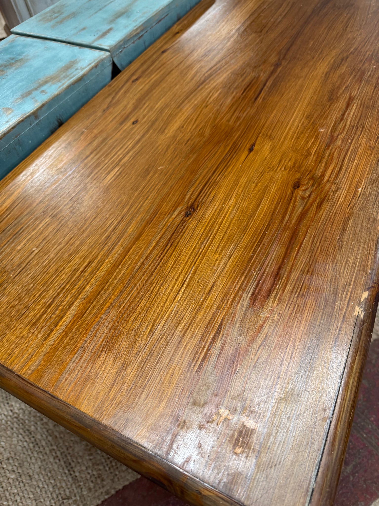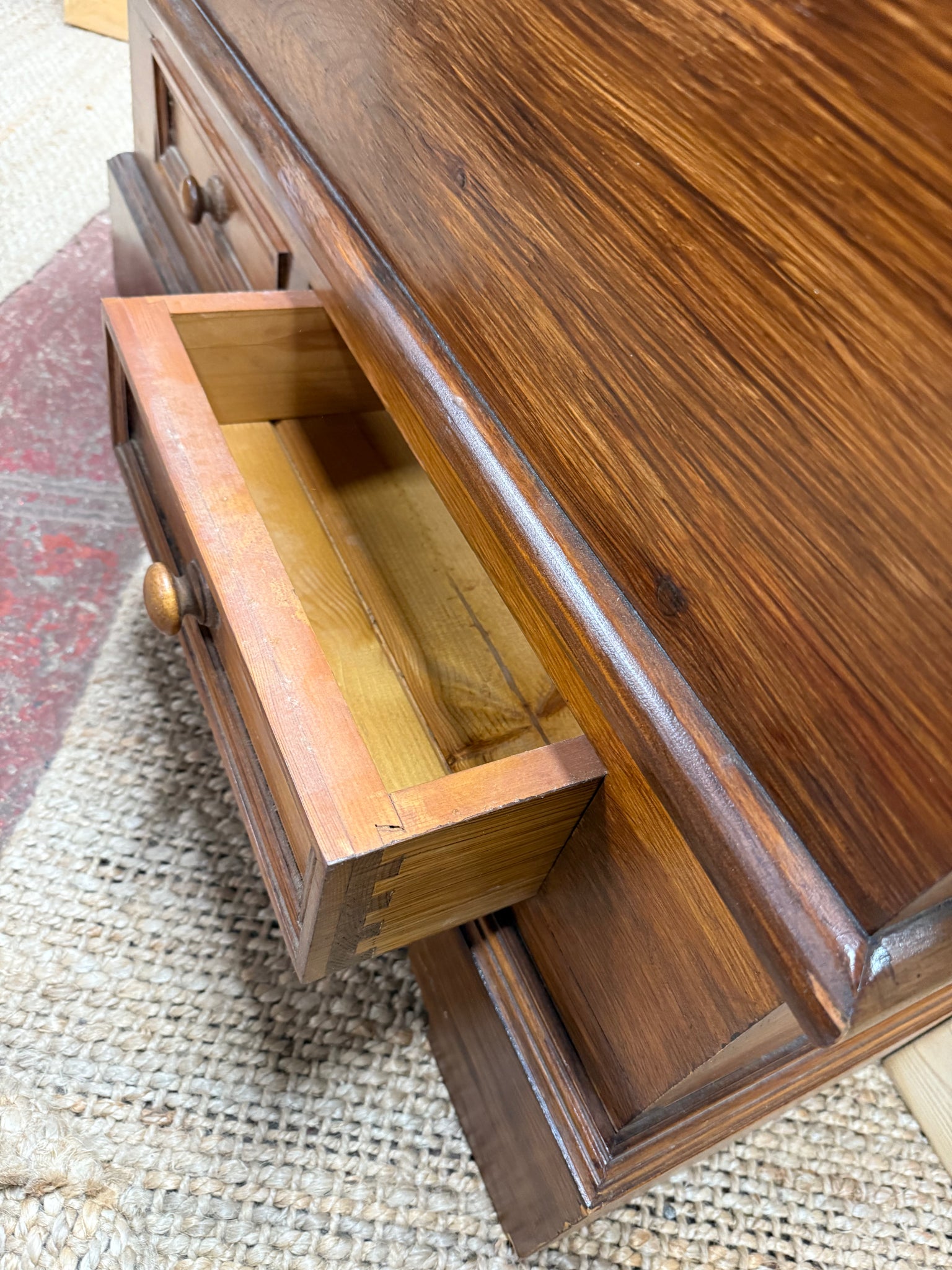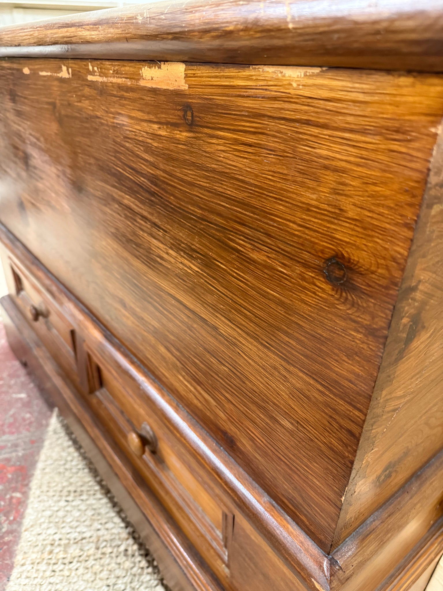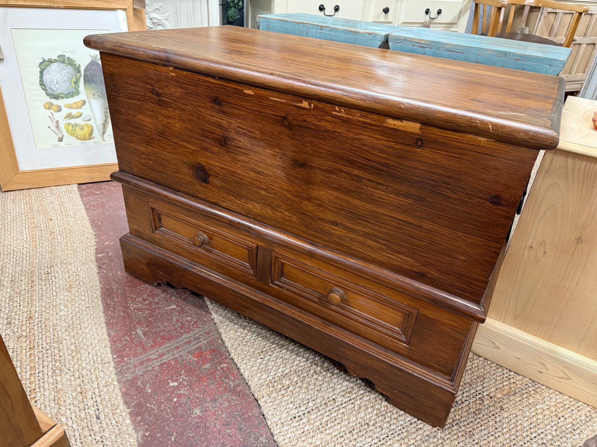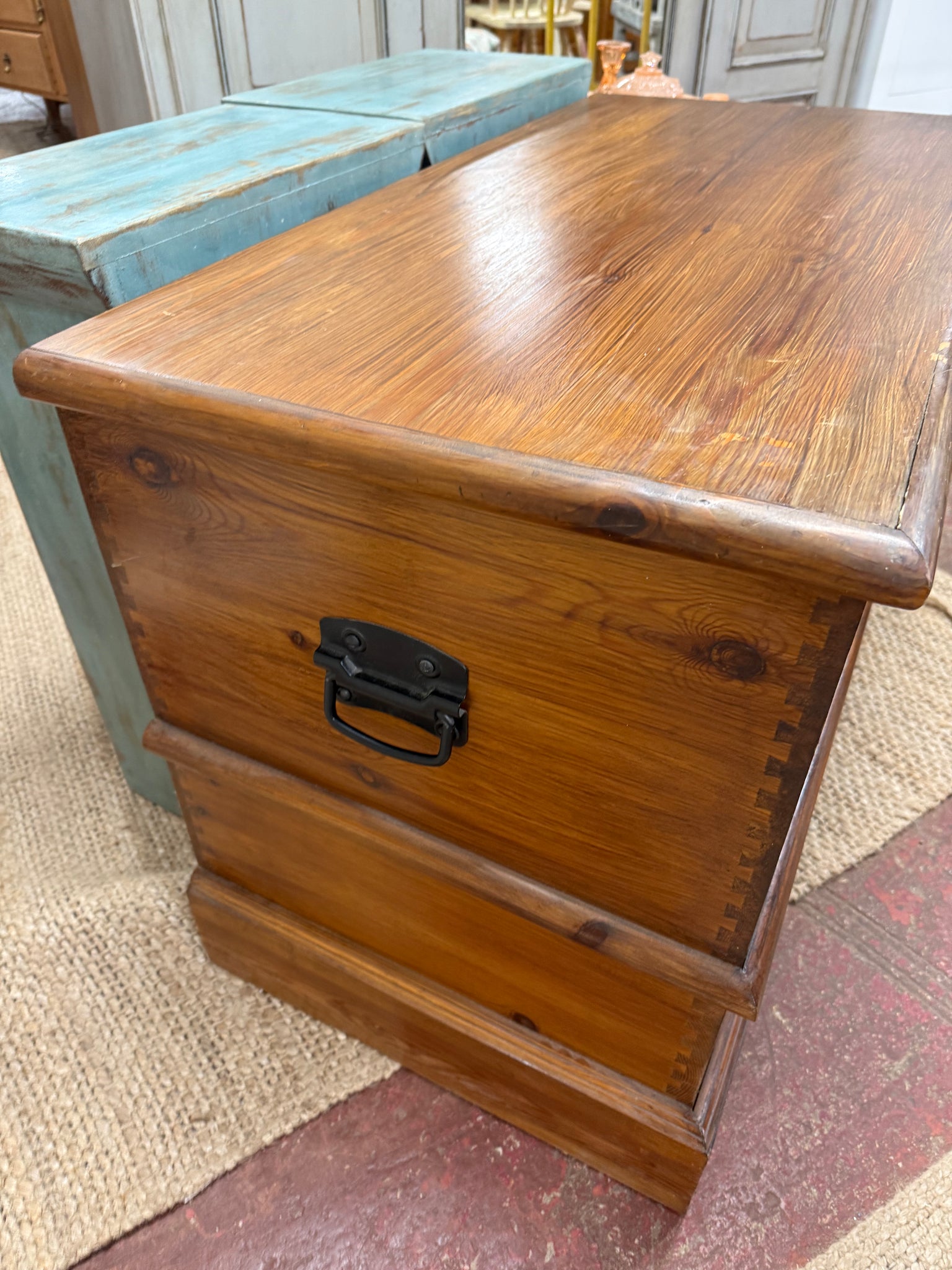 This beautiful solid pine blanket box is sturdy and in good overall shape. While it shows some minor marks, they are nothing significant. It provides plenty of storage with two dovetail jointed drawers and additional space beneath the lid. Plus, it features two handles on the sides for easy moving.