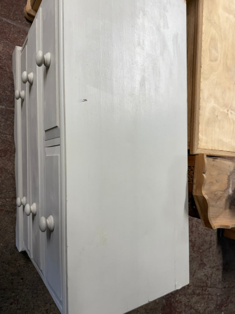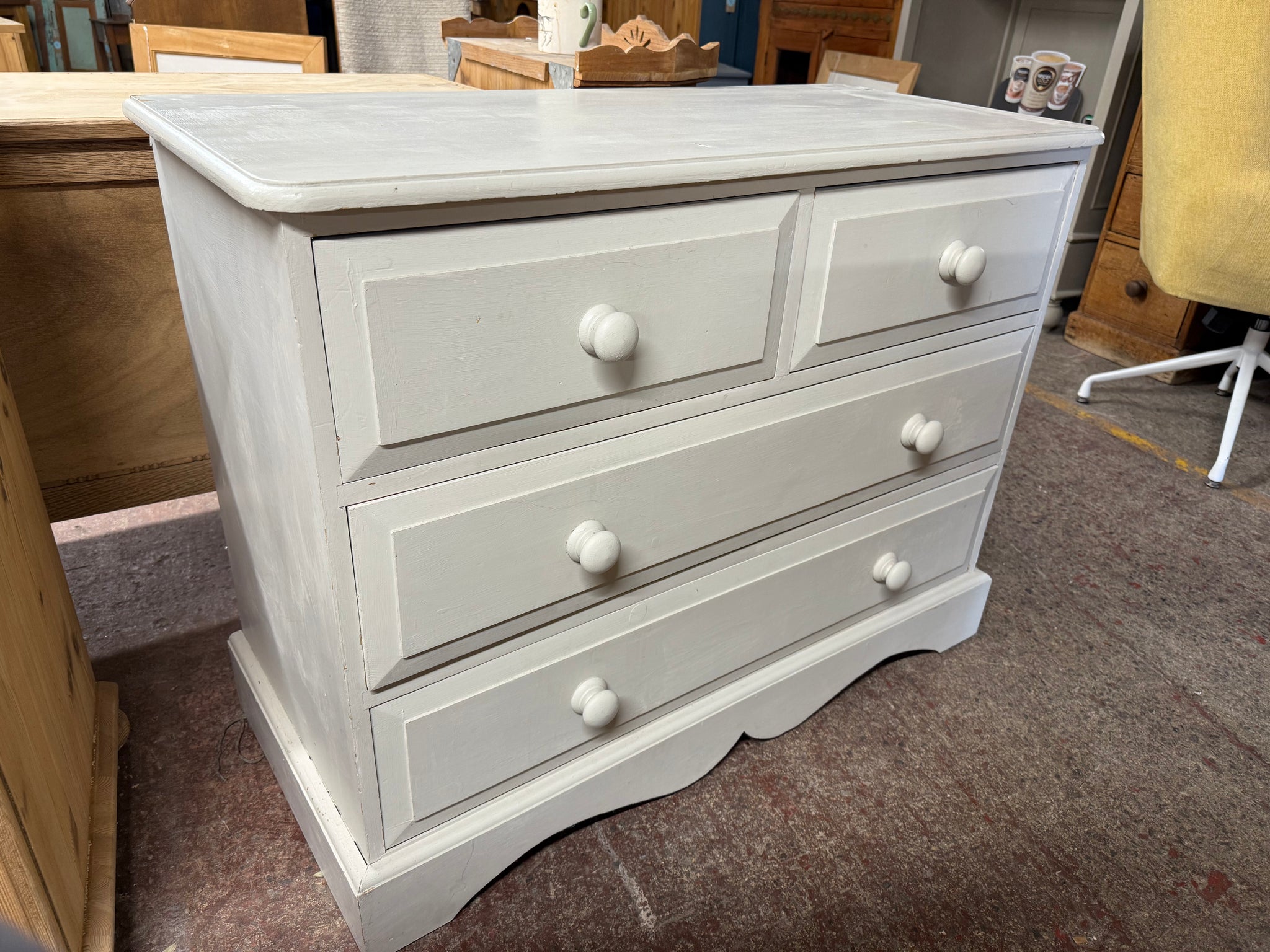 This beautiful solid pine chest of drawers has been painted white by its previous owners and might benefit from a little touch-up here and there. It includes two small dovetail jointed drawers above two larger ones, providing ample storage.