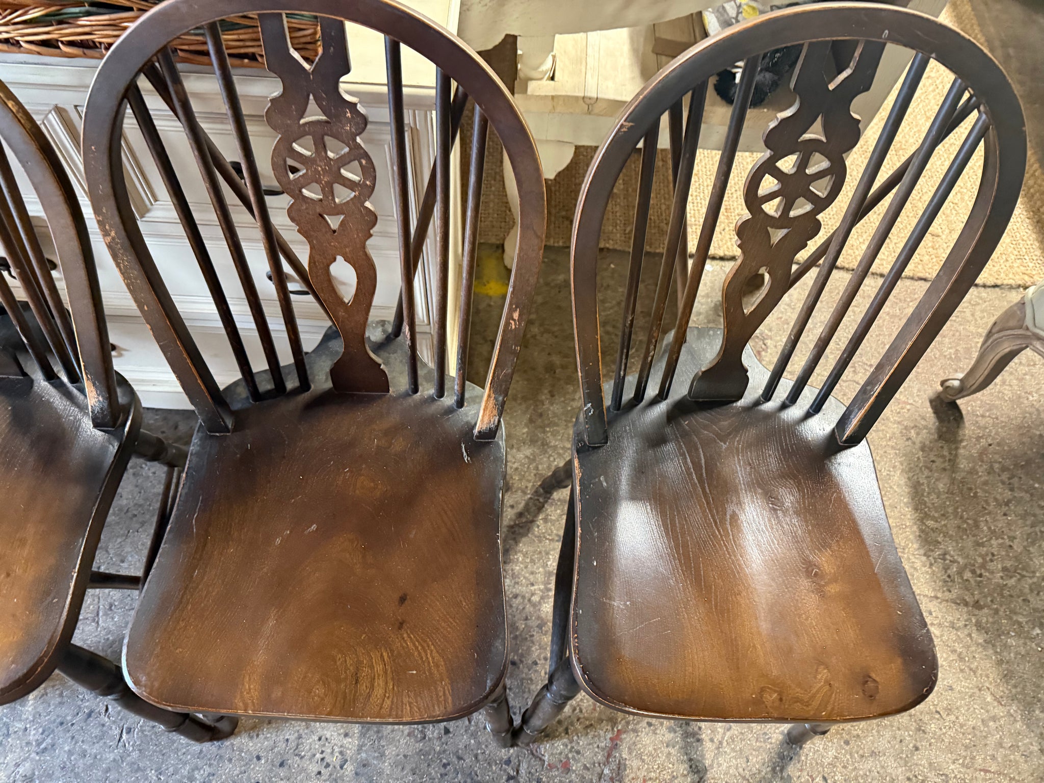 • Load image into Gallery viewer, A beautiful quartet of oak wheelback dining chairs ready to enhance your dining space. Each piece boasts solid construction and maintains good overall condition, with only minor cosmetic marks that add character rather than detract from their appeal. Perfect for those seeking authentic, timeless seating with genuine charm and durability.