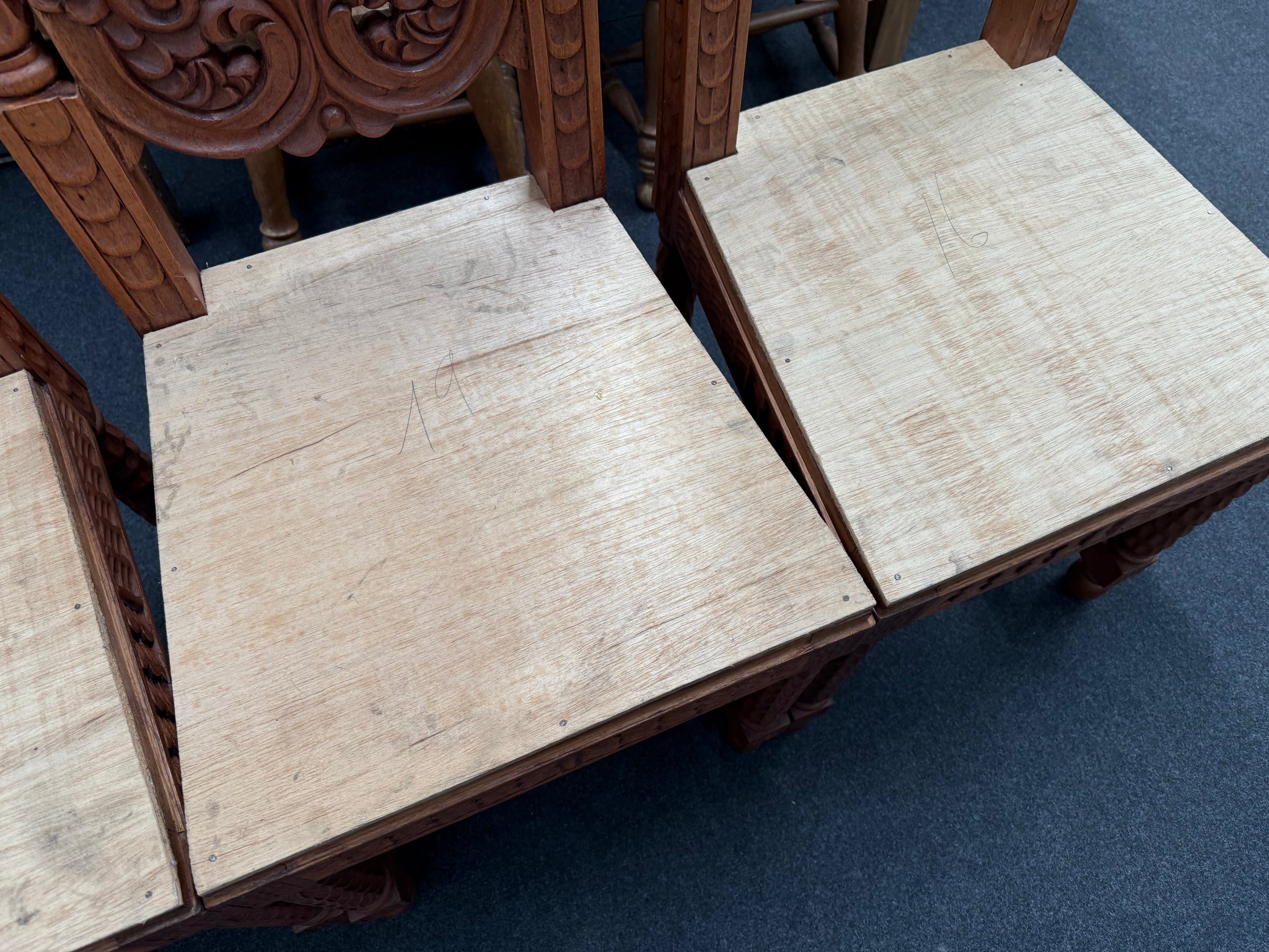 This stunning set of six Indian hardwood dining chairs features beautifully intricate carvings on each piece, adding a unique touch of craftsmanship to your dining area. All chairs are in overall good condition. While the seats are made from plywood, this design detail offers a great opportunity to customise with your preferred seat pads, enhancing both comfort and style to suit your décor.