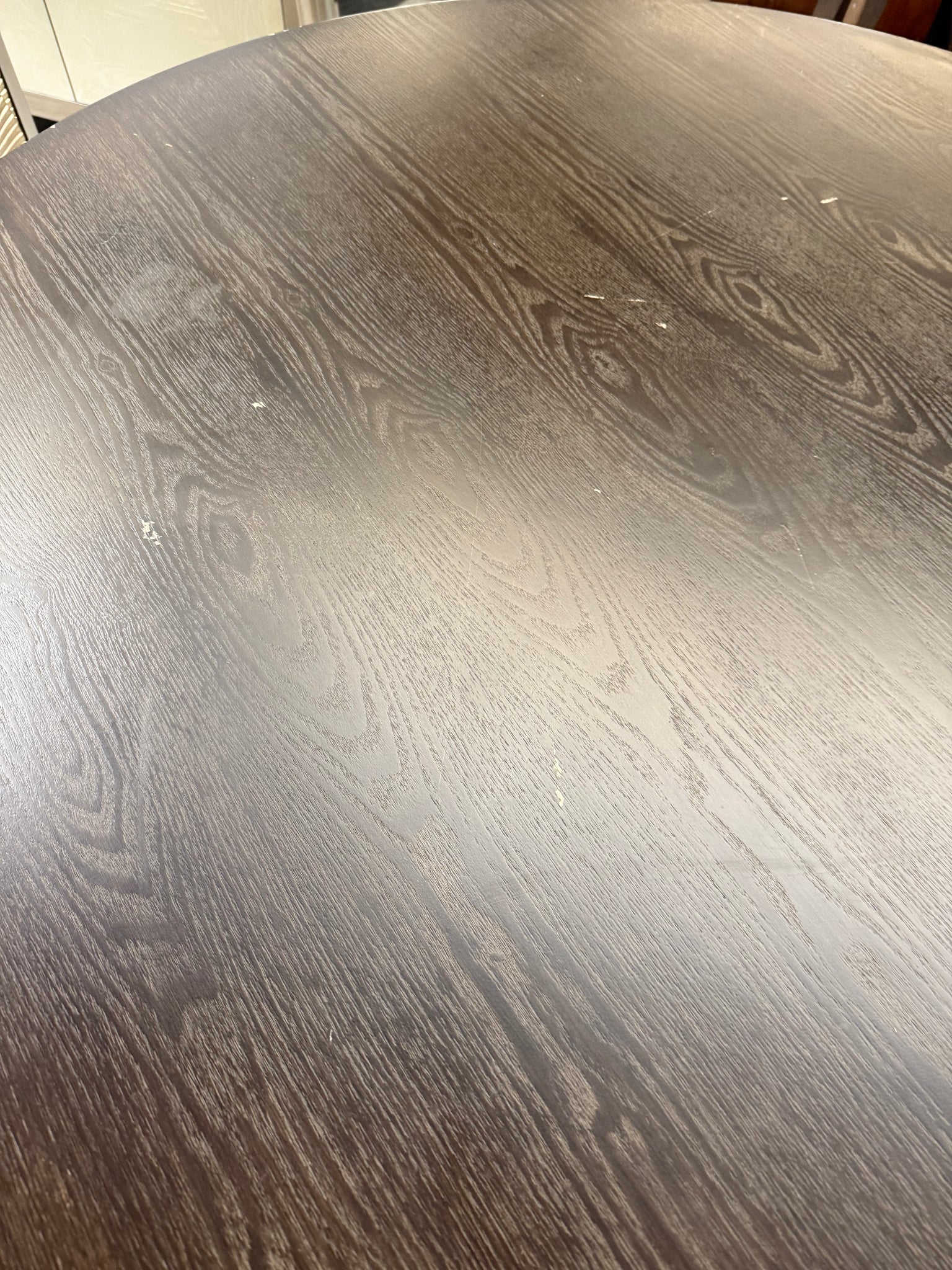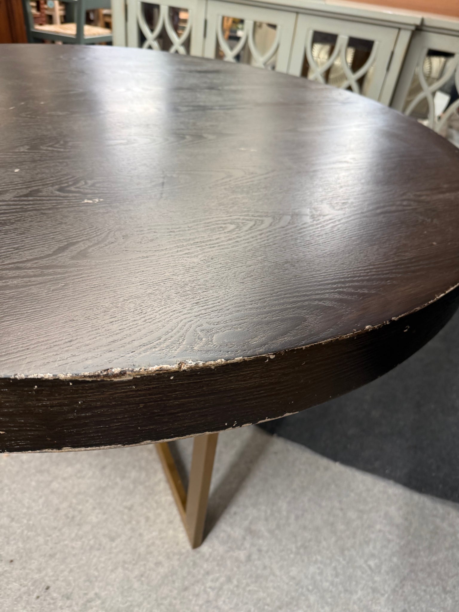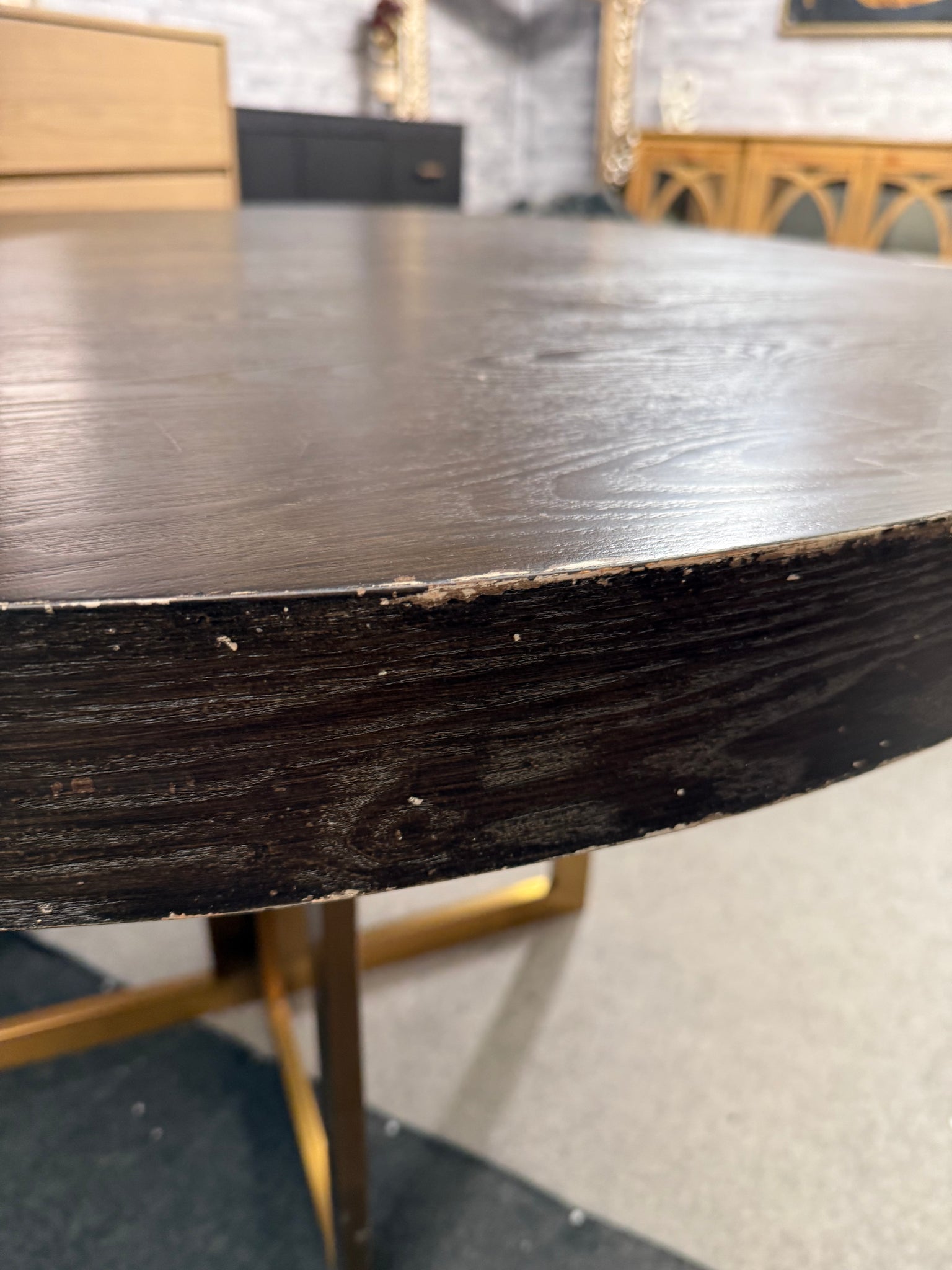 Bring glamour to your dining space with this charming Art Deco round table. Featuring distinctive gold metal legs that detach for convenient transport. While the surface shows character marks, a fresh coat of paint will restore it to showroom condition. Comfortably seats six guests, making it perfect for dinner parties and family gatherings.