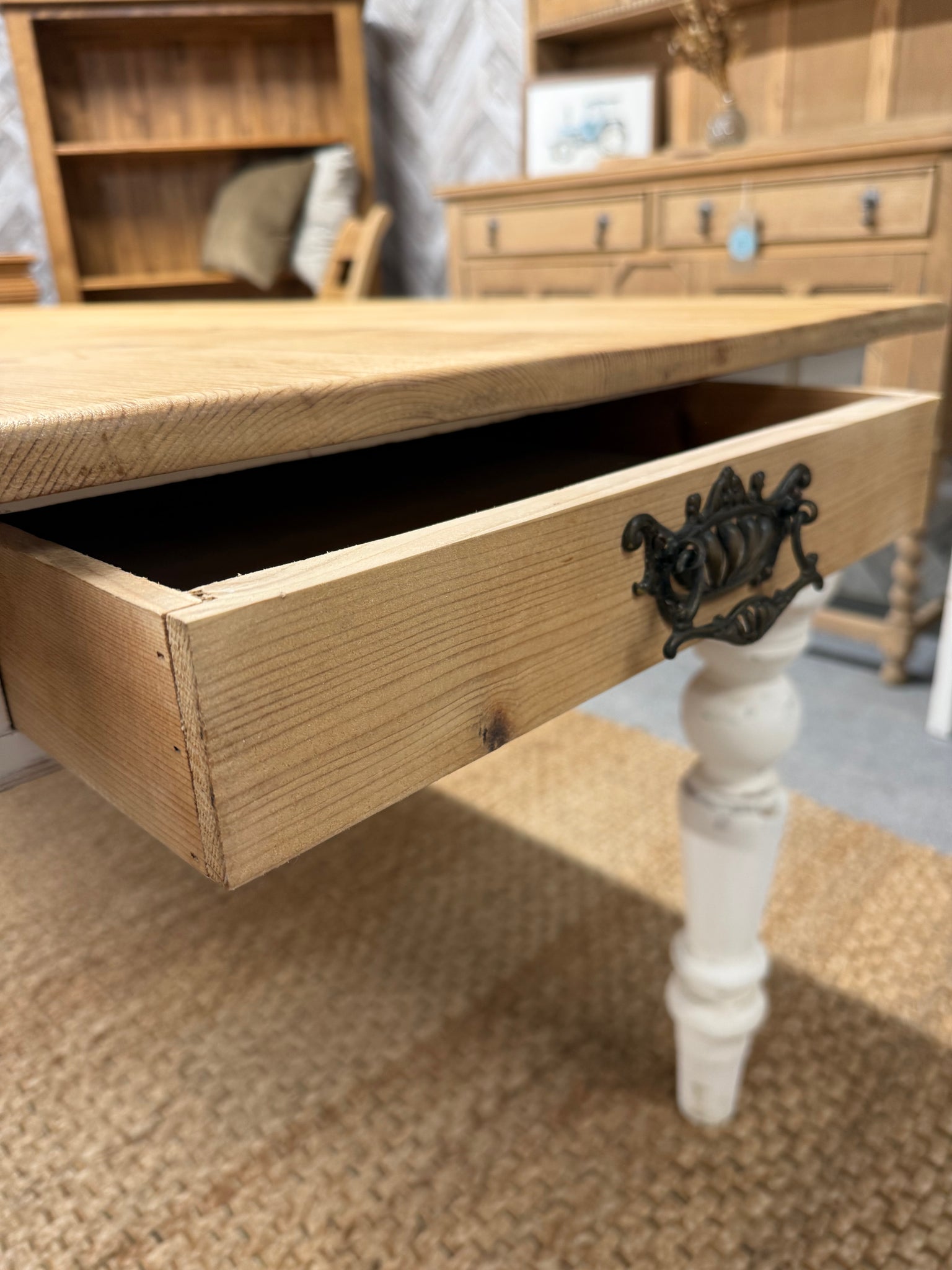 Bring warmth and character to your dining space with this charming solid pine table, featuring beautifully weathered legs that showcase authentic rustic appeal. The natural pine surface pairs perfectly with its practical front-facing drawer, while sturdy fixed legs ensure lasting stability. Comfortably accommodating six to eight guests, it's an ideal centrepiece for family gatherings and memorable meals.
