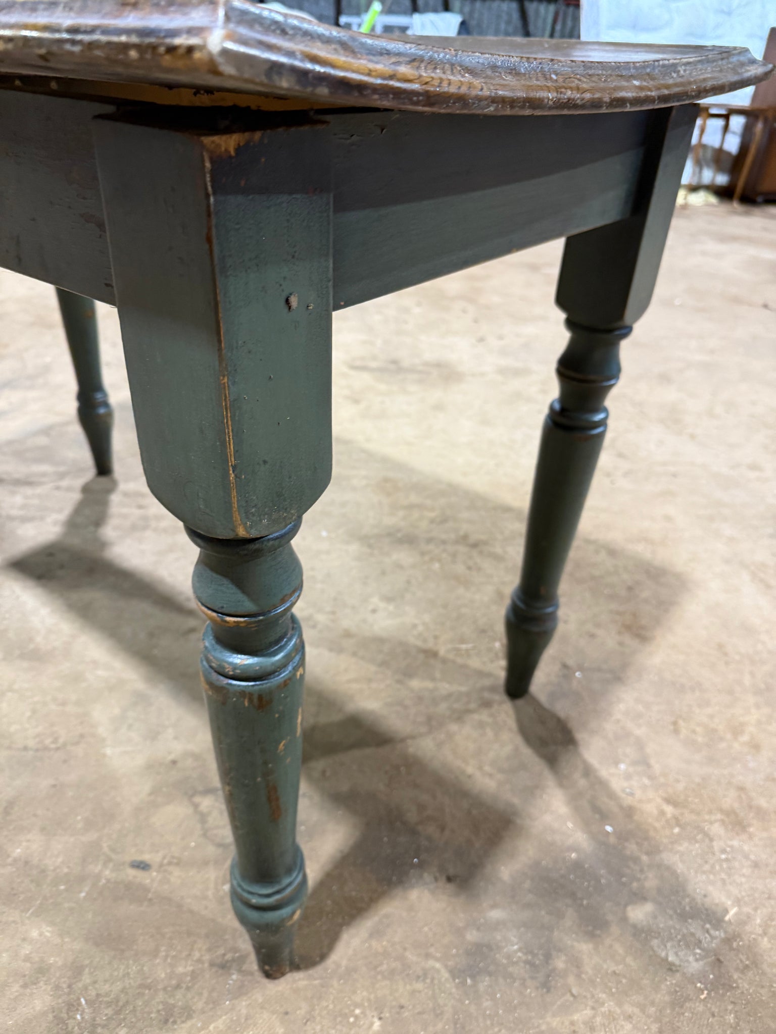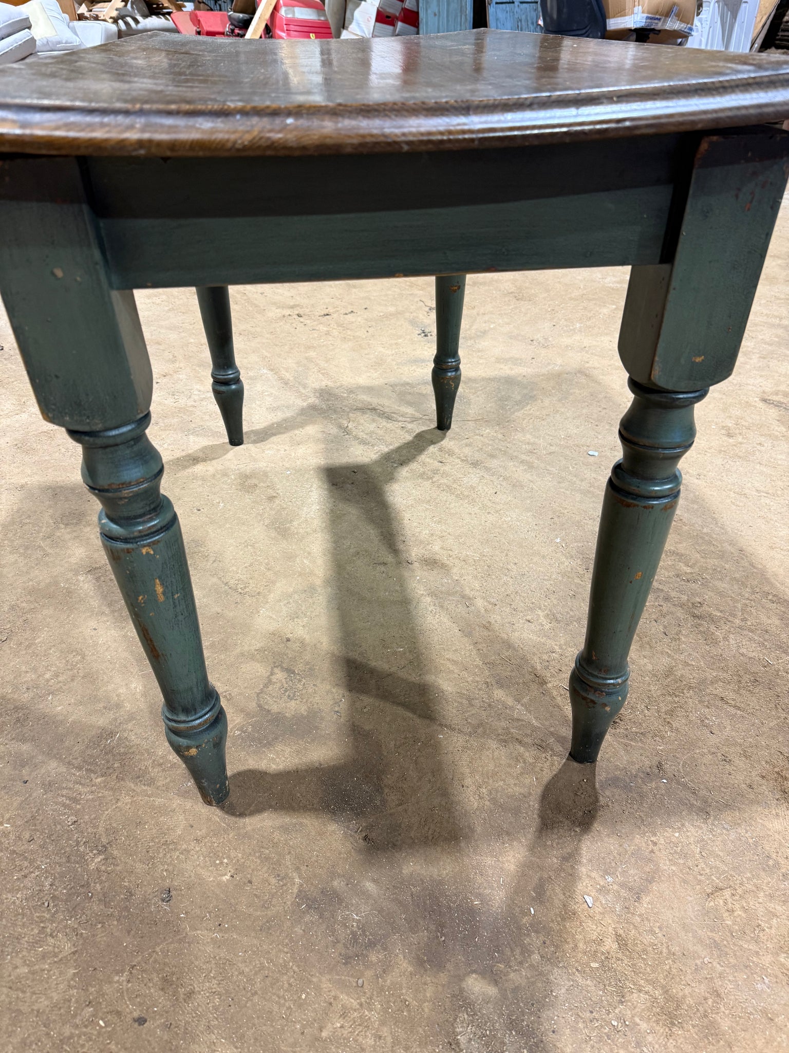 A charming wooden dining table with character and vintage appeal. Featuring distinctive green distressed legs and a solid structural foundation, this piece brings rustic warmth to any dining space. The tabletop shows warping , though when secured to the base, you may not notice too much.