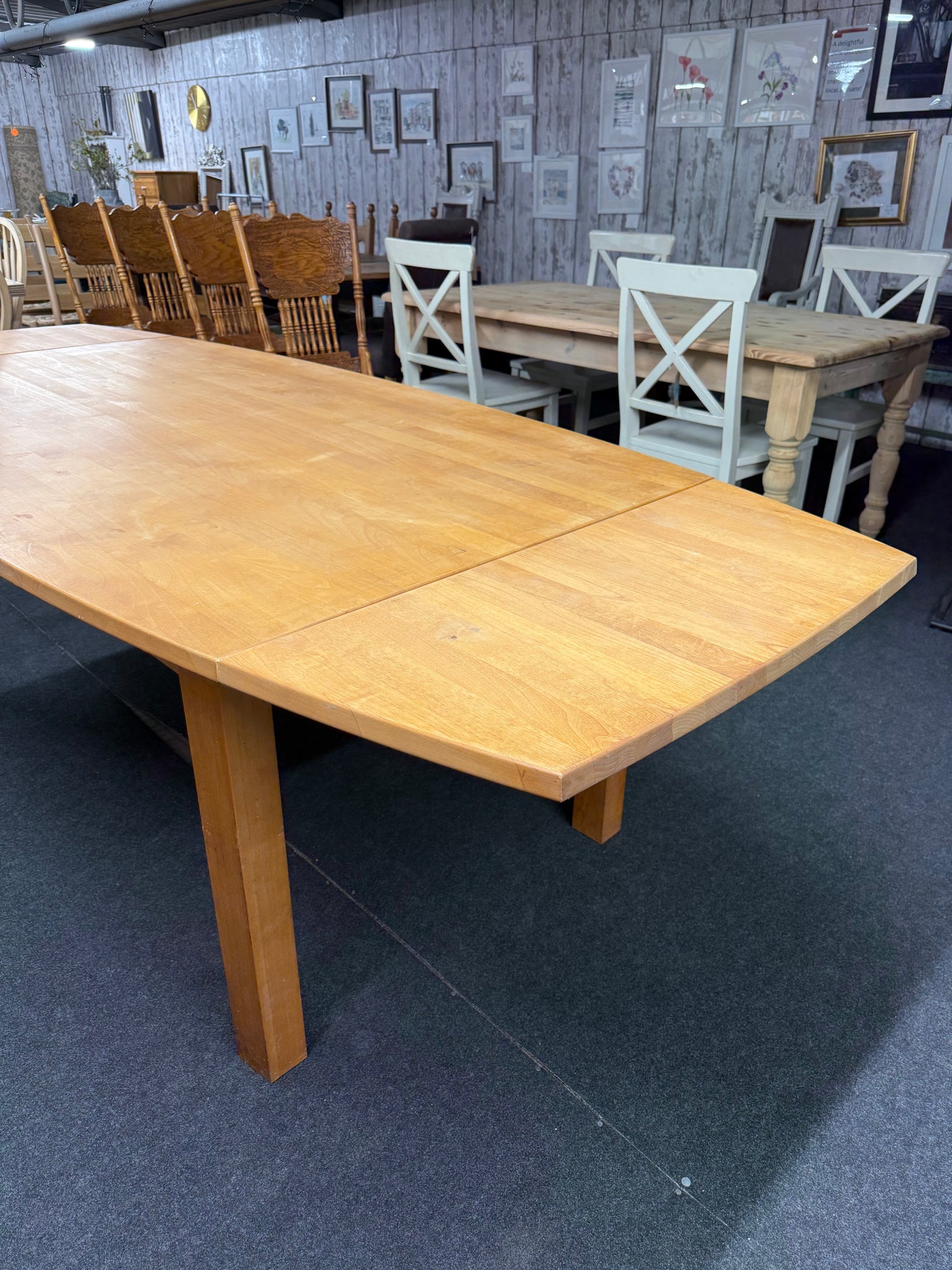 This charming extendable oak dining table is sturdy and well-maintained. Though gently used with a few minor marks, it remains in great shape. Featuring two extendable leaves that conveniently store beneath the table, it easily expands to seat up to 8 people. Plus, the detachable legs make moving it a breeze!