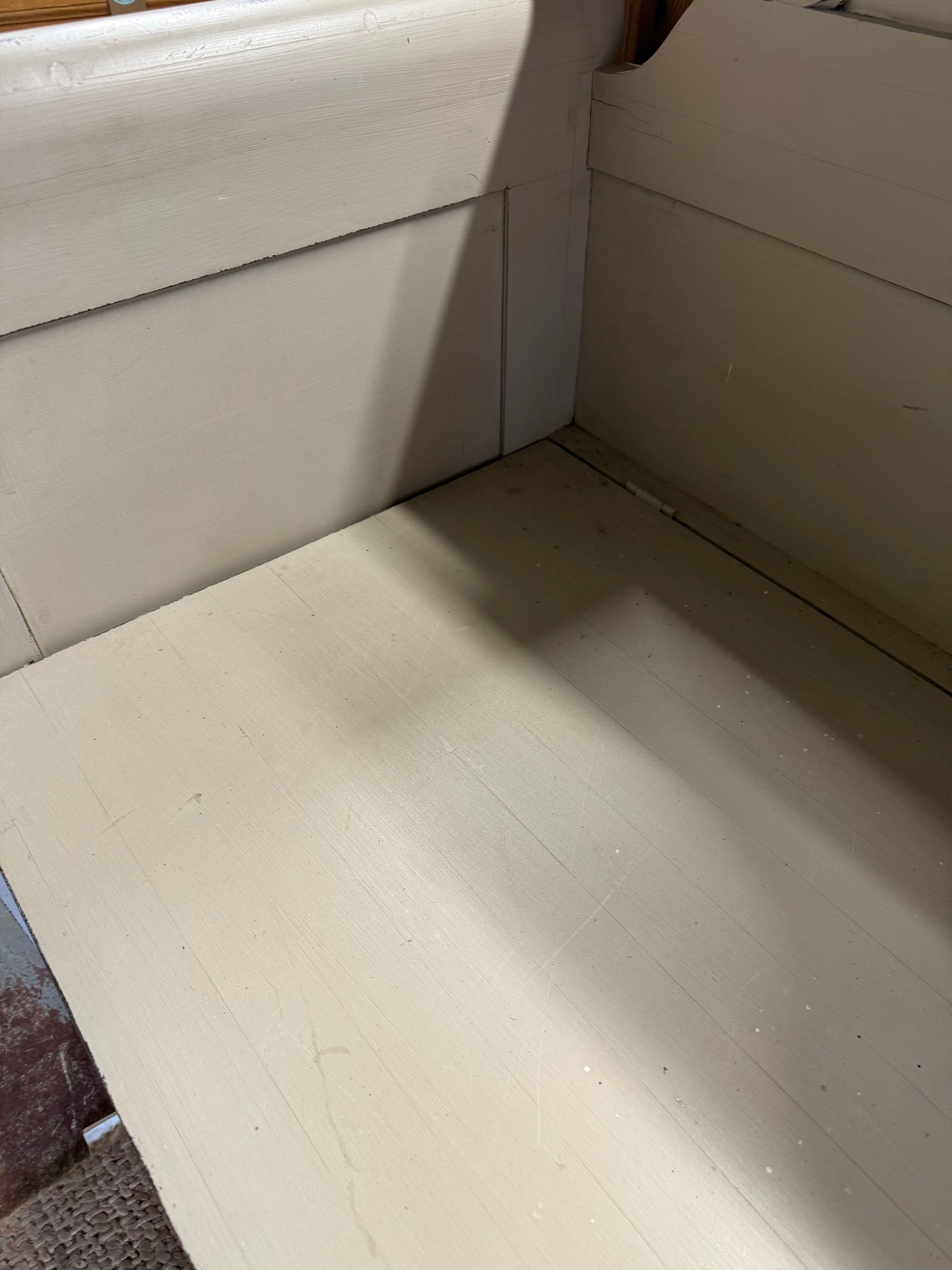 This beautiful Gustavia style bench is sturdy and well-maintained. It features a light grey distressed finish with a few small chips, adding character without affecting its charm. The seat lifts to reveal generous storage, making it an ideal addition to your hallway or dining area.