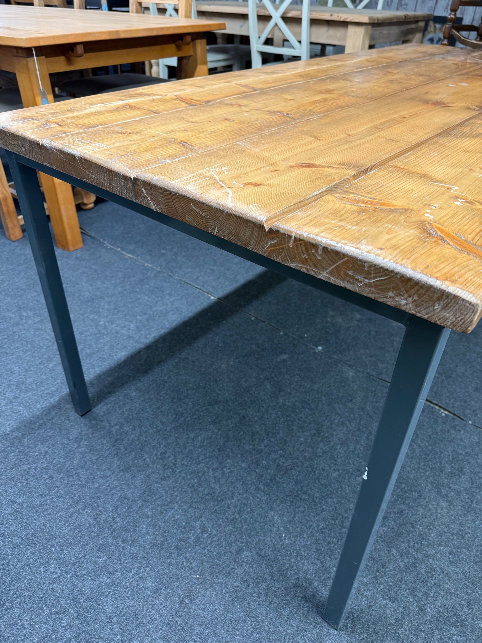 A striking industrial dining table that combines authentic character with practical functionality. Featuring a robust planked top, this piece is ready to become the centrepiece of your dining space. With minor surface marks that can be easily restored through light sanding, it retains genuine vintage appeal. Comfortably accommodates six diners, making it ideal for family gatherings and entertaining guests.