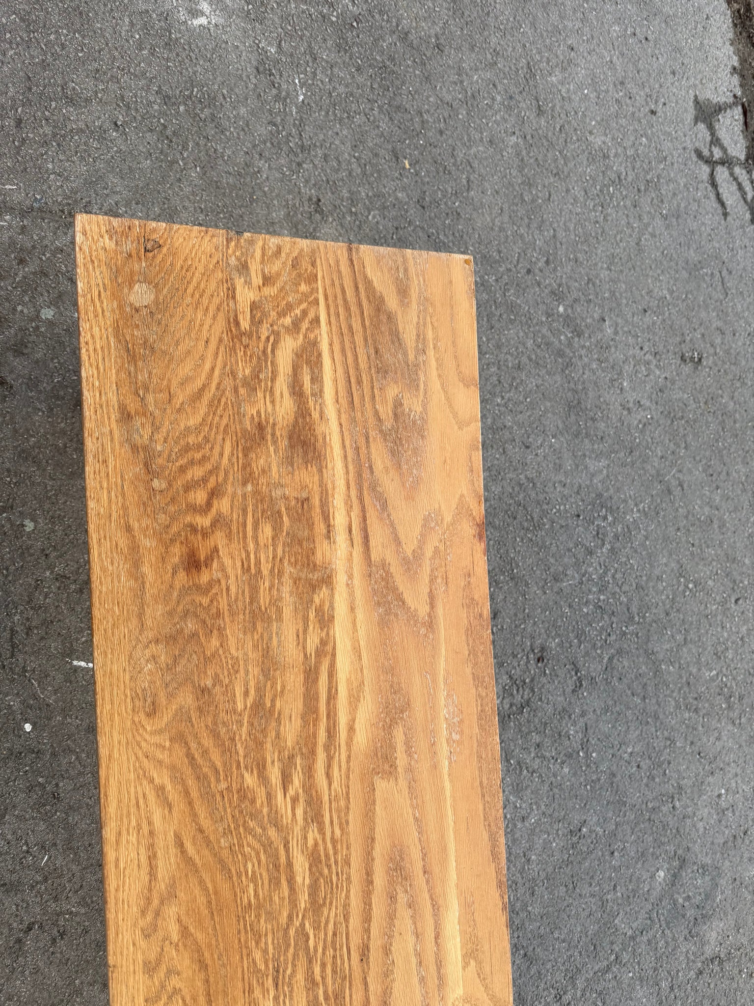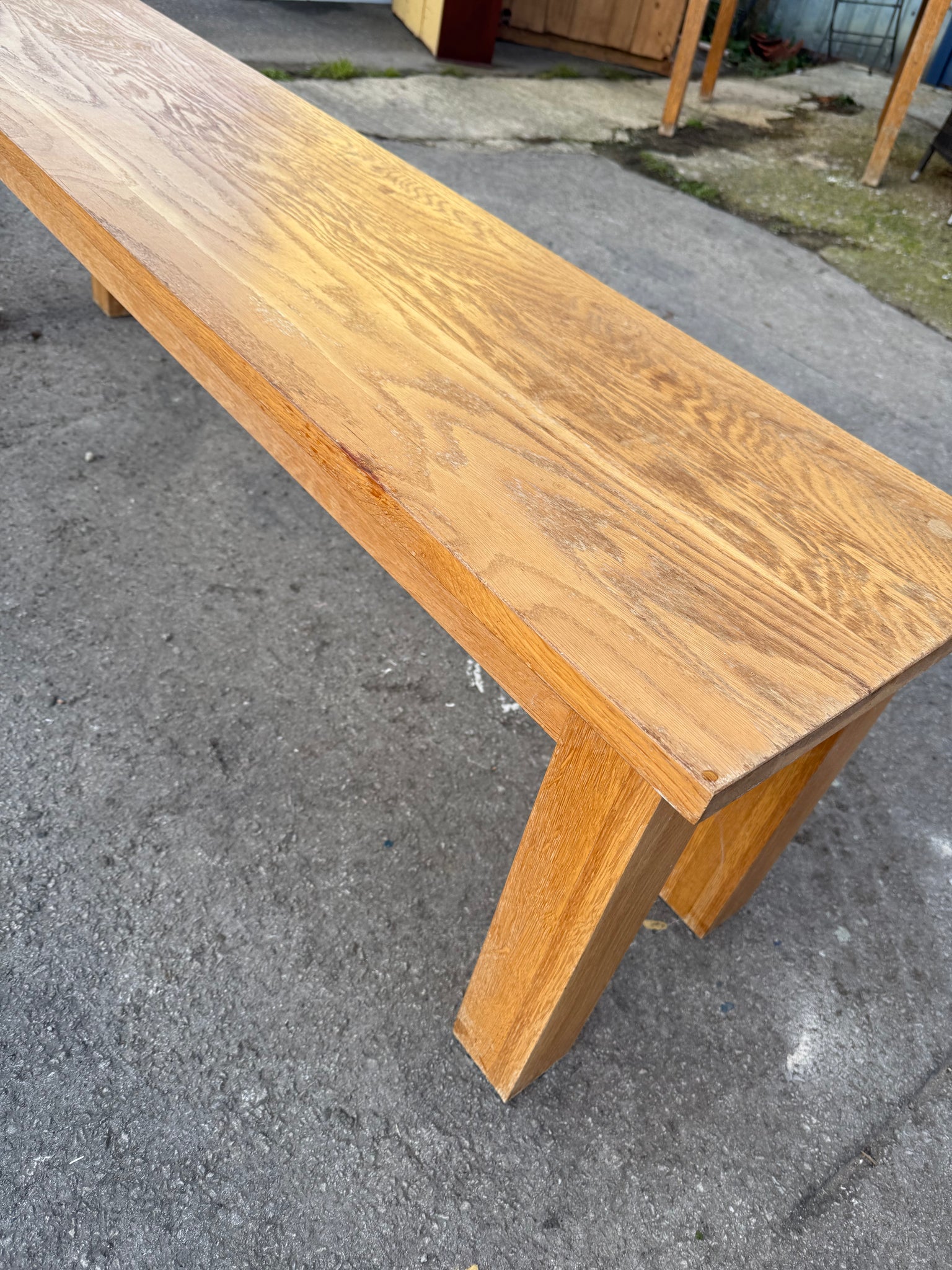 A charming oak dining bench that brings warmth and character to your dining space. Built to last with solid construction, this pre-loved piece showcases the natural beauty of oak wood. While it bears the gentle patina of age with minor surface marks, it remains in excellent working condition. The removable legs make transport and rearrangement effortless, adding practical convenience to its timeless appeal.