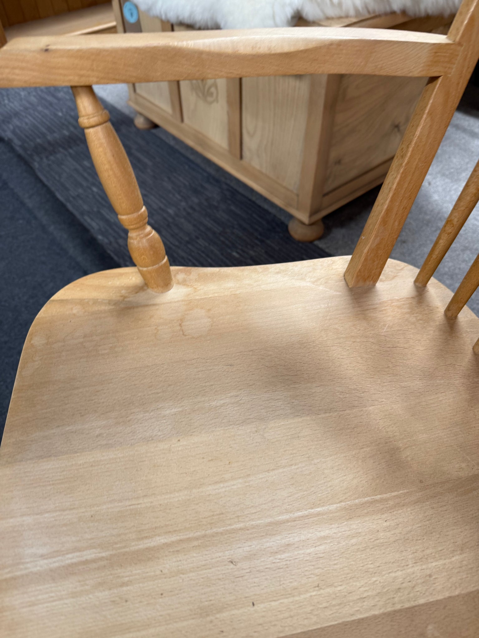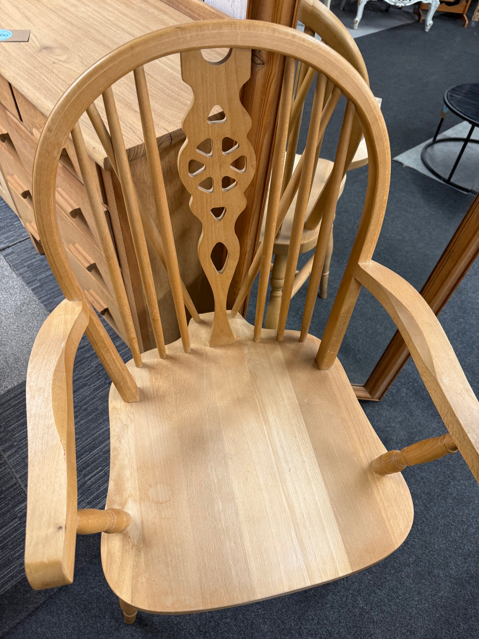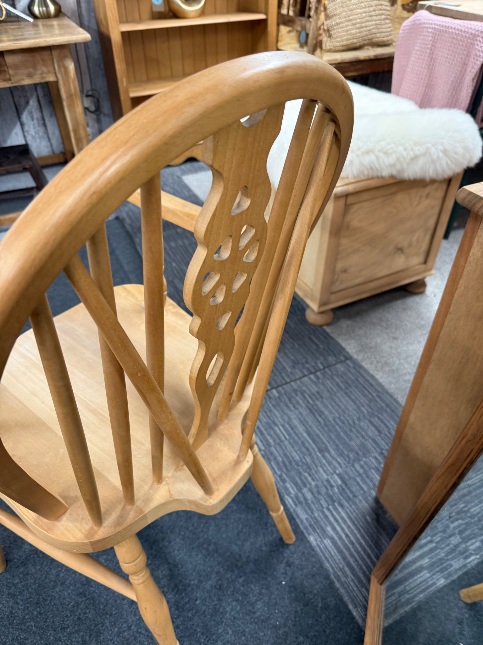 This beautiful solid pine wheel-back carver is sturdy and well-maintained. It shows some signs of use, but only minor marks that don’t detract from its charm. Ideal for a cozy bedroom chair or to complete your dining table setup.