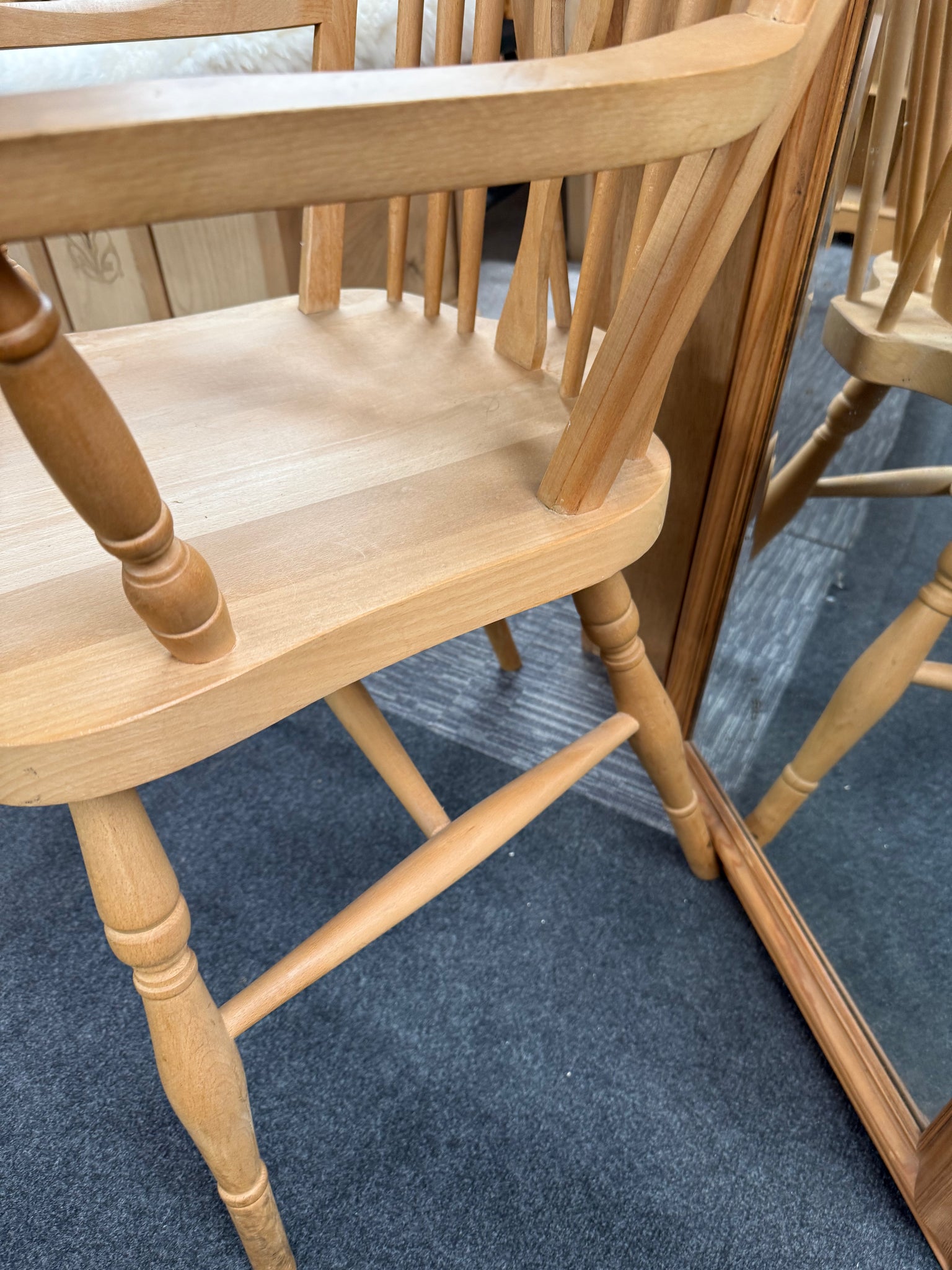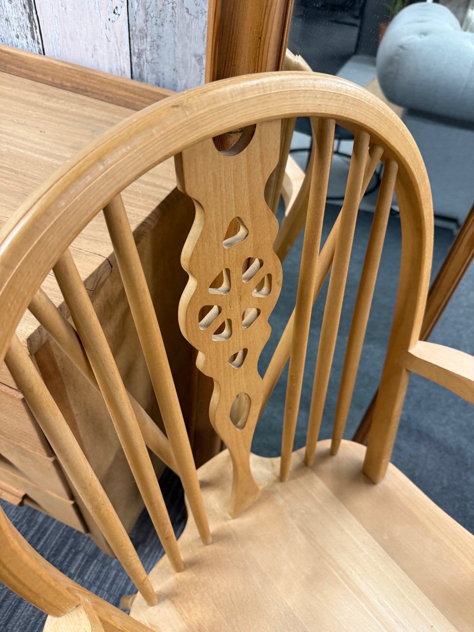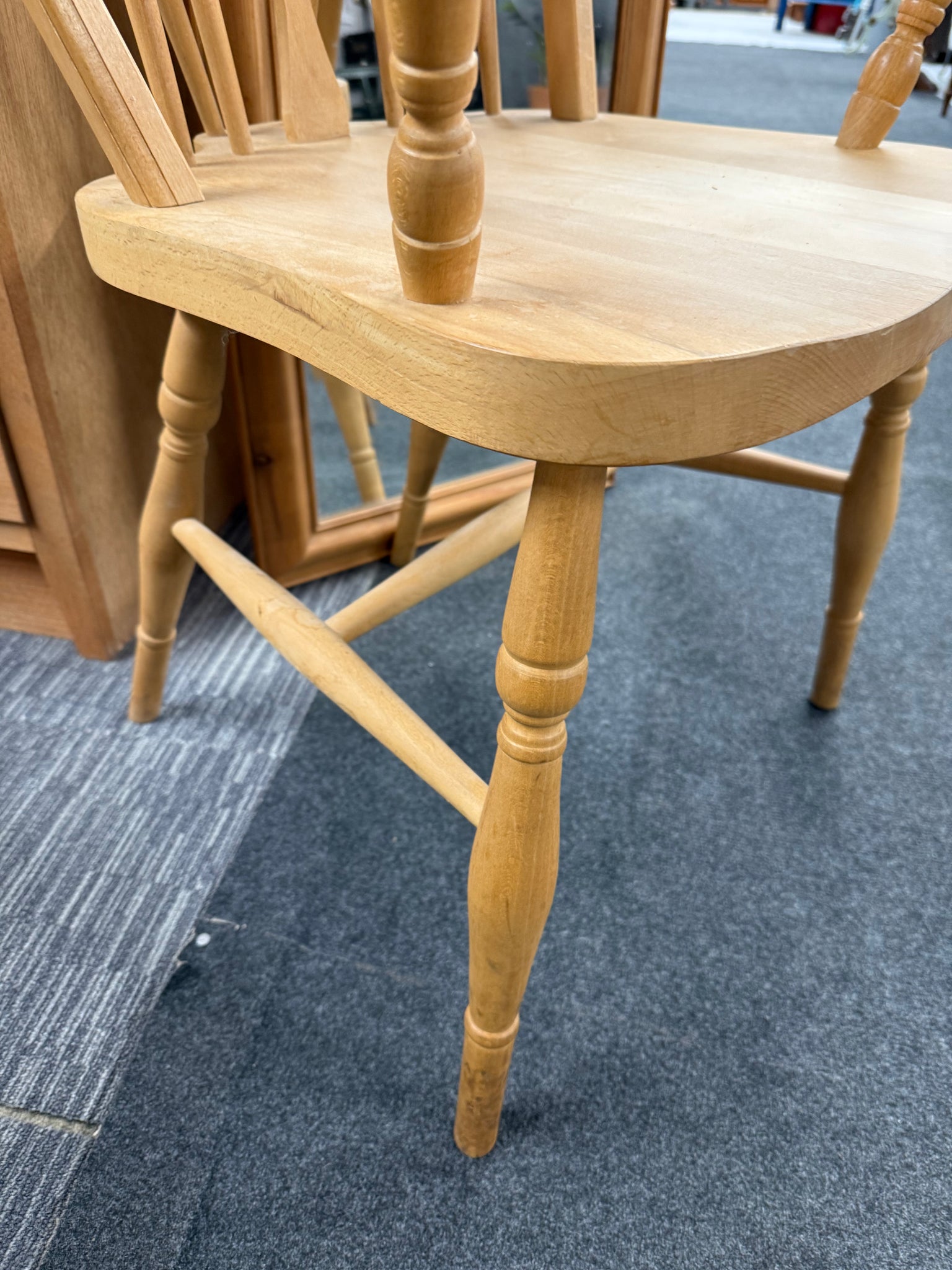 This beautiful solid pine wheel-back carver is sturdy and well-maintained. It shows some signs of use, but only minor marks that don’t detract from its charm. Ideal for a cozy bedroom chair or to complete your dining table setup.