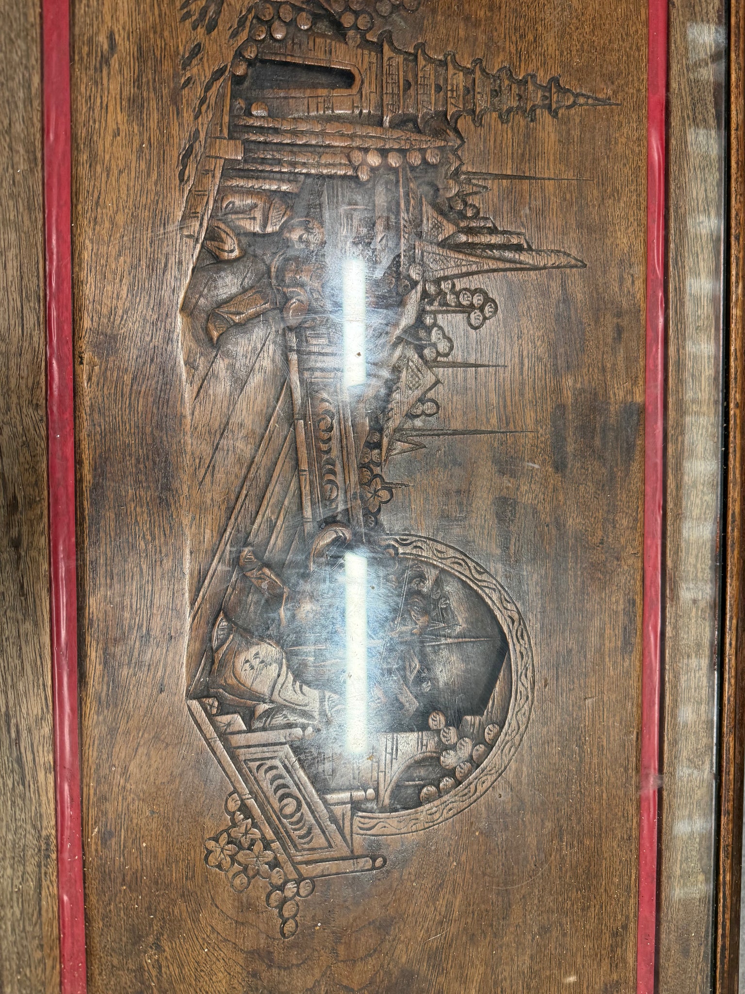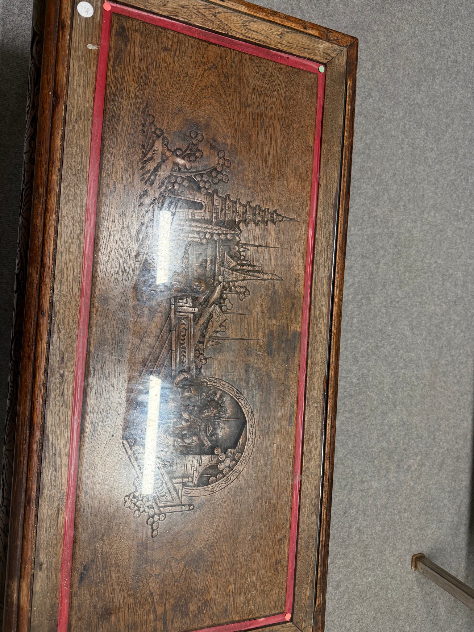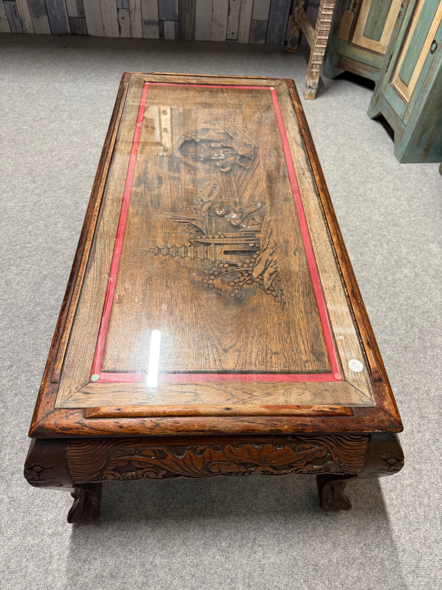 A characterful solid wood coffee table with hand-carved detailing, showcasing authentic patina from years of use. The removable glass top protects the intricate woodwork whilst maintaining its visual impact. Minor surface marks add to its vintage charm rather than detract from it. Structurally robust and ready for another chapter in a home where it'll serve as a genuine conversation starter.