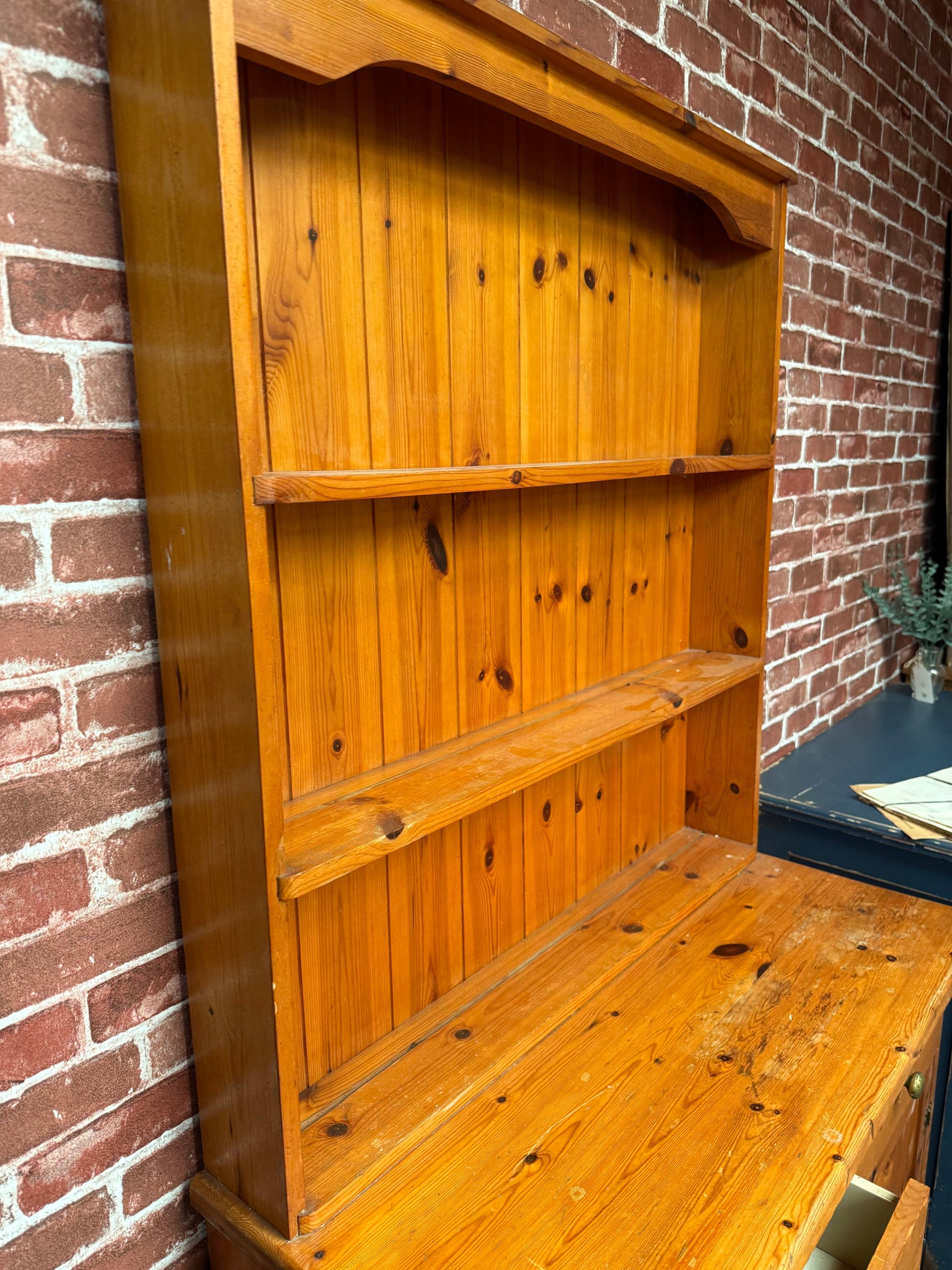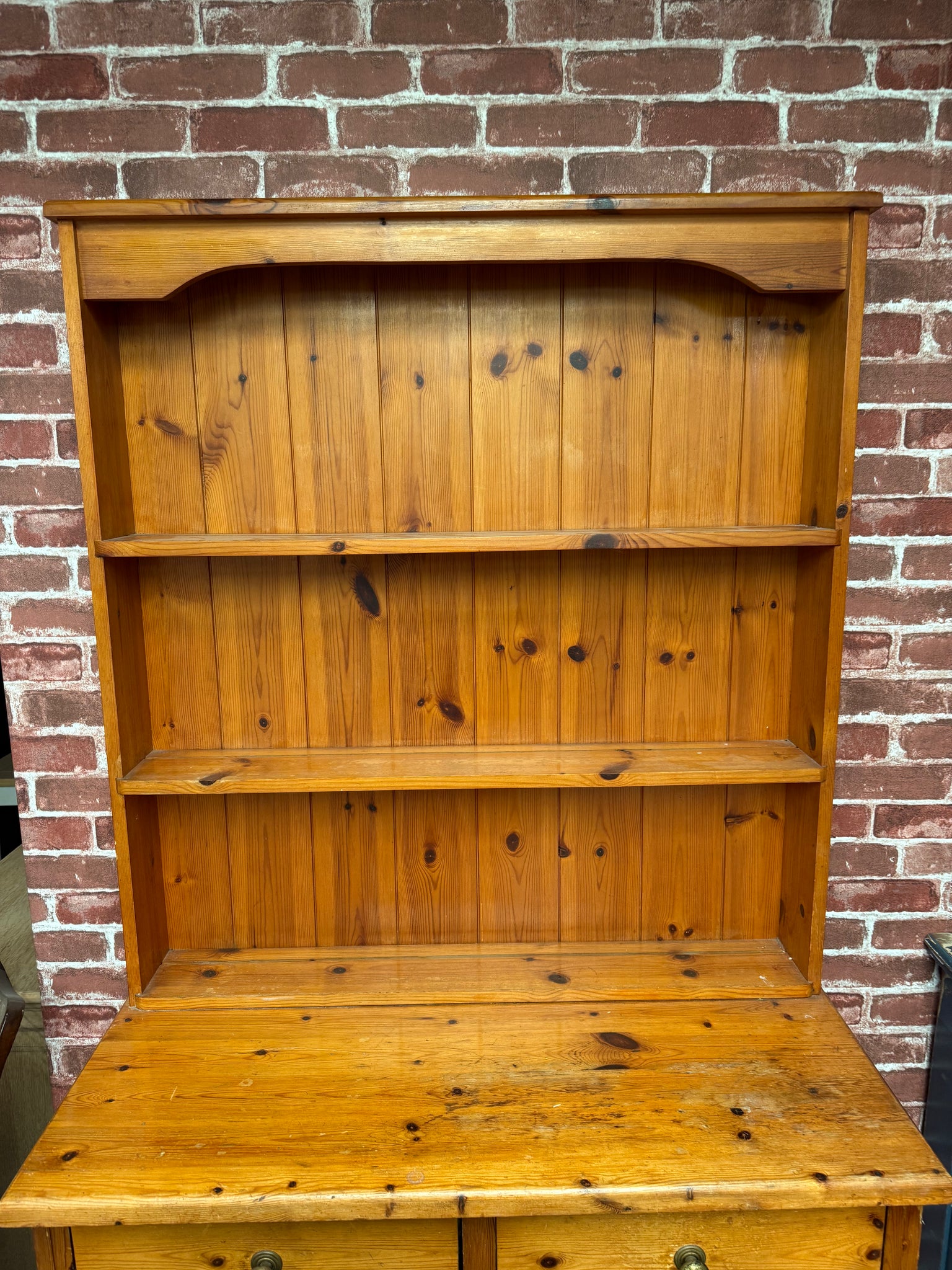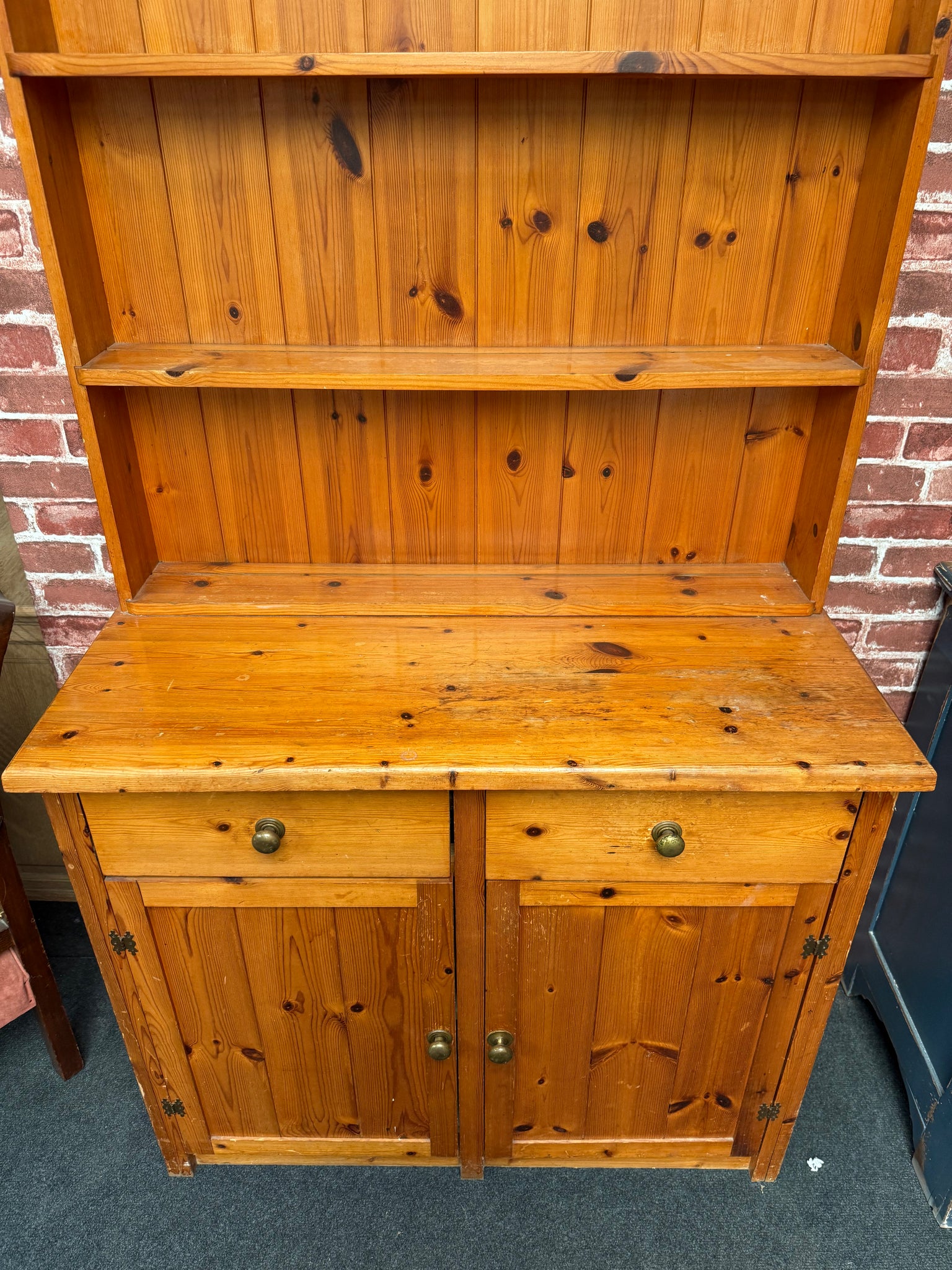 This sturdy solid pine dresser is in good condition overall. It shows some signs of use with marks, but nothing that impacts its use. The top section features 2 shelves above 2 drawers, and the base includes a spacious double cupboard.