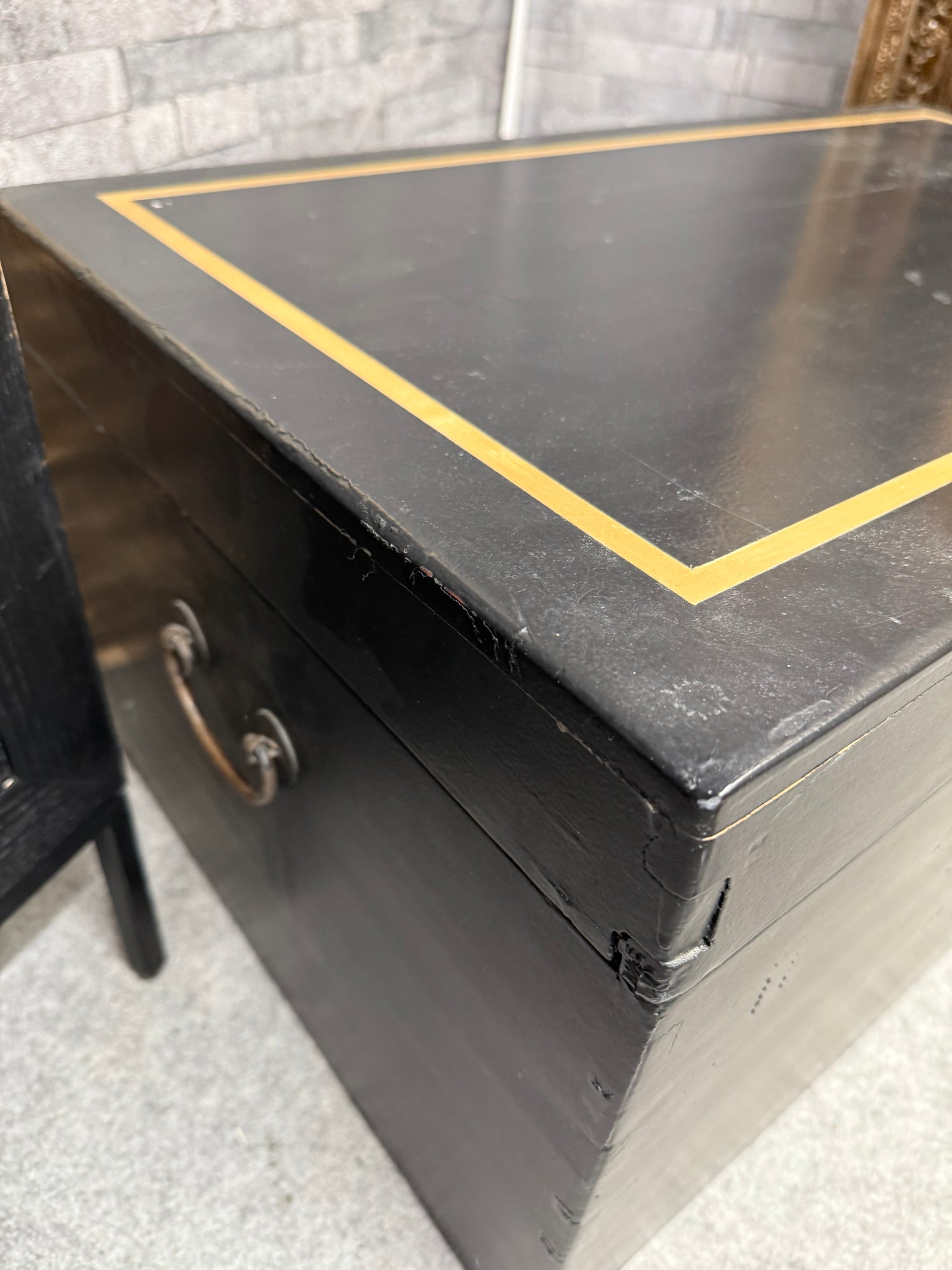 • Load image into Gallery viewer, Elevate your home storage with this striking blanket box, featuring a sleek black finish complemented by elegant gold detailing along the top. Perfect for keeping toys, blankets, and seasonal items neatly organised, this contemporary piece brings both style and functionality to any room.