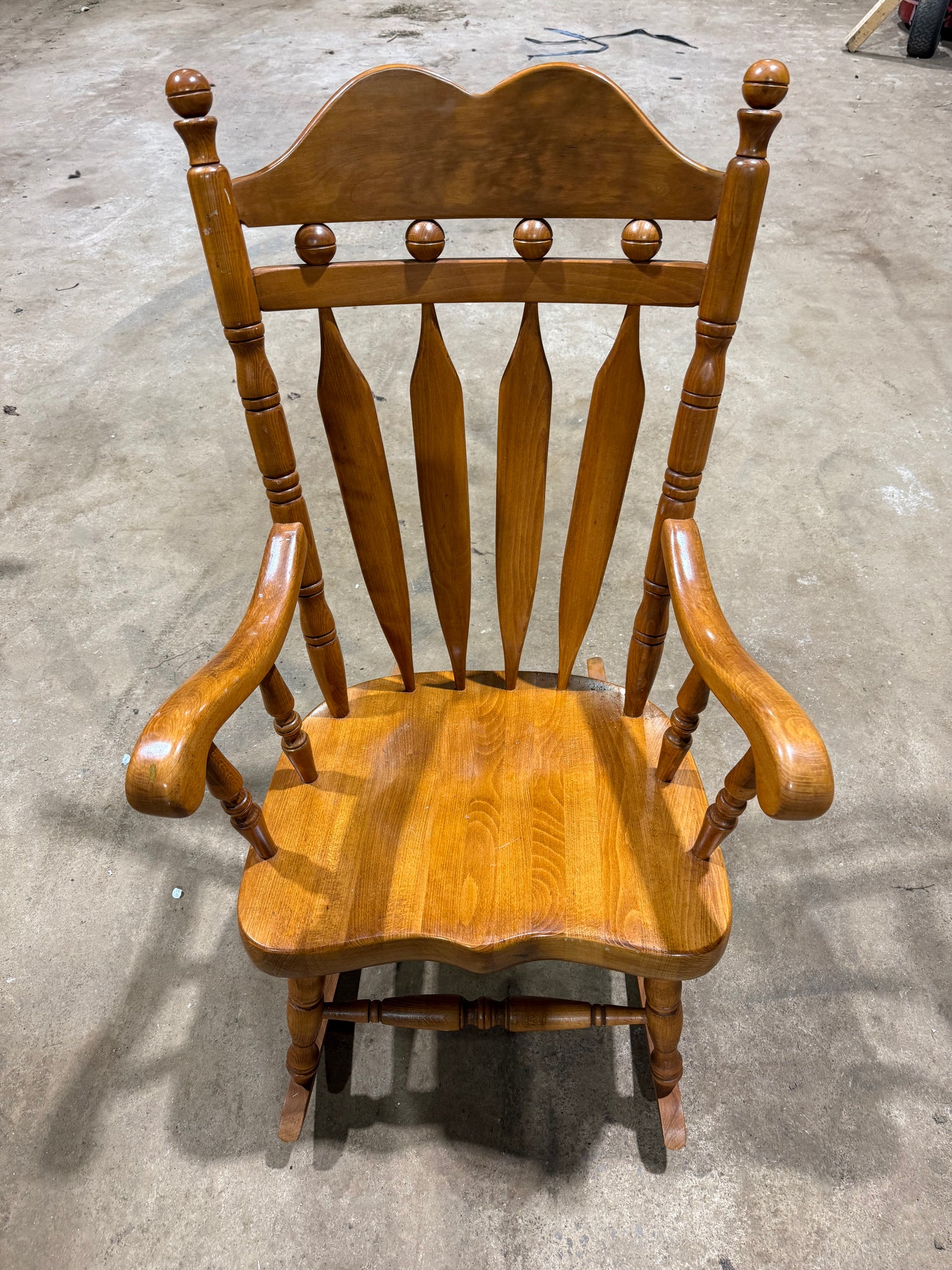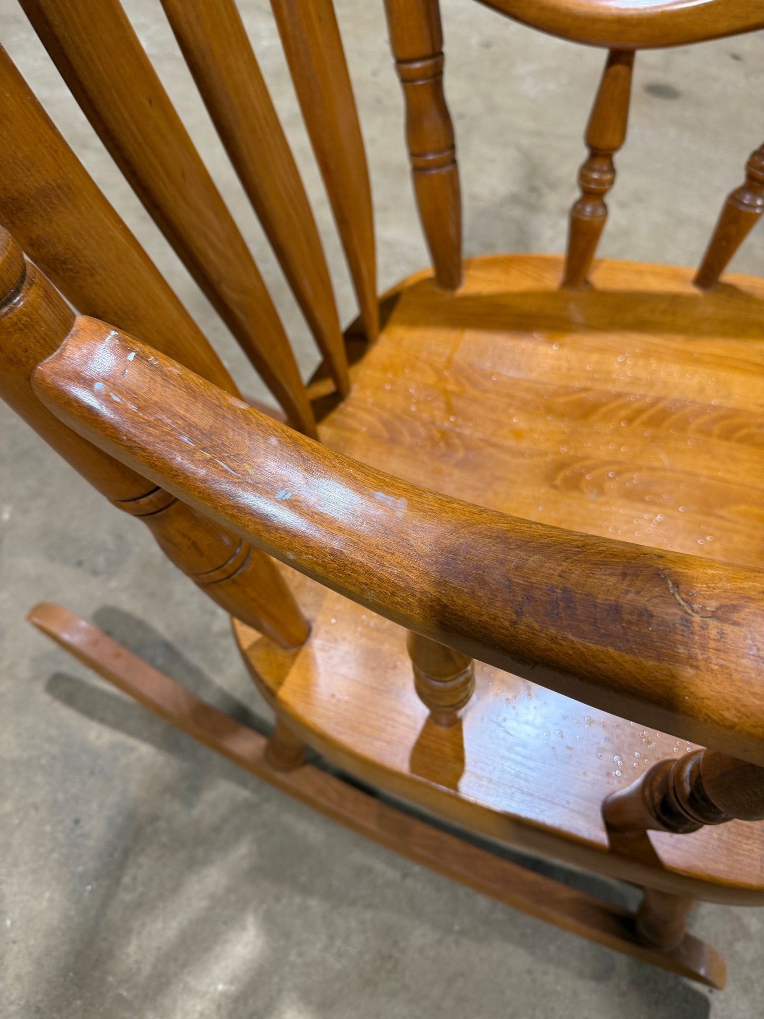 A charming solid pine rocking chair with authentic farmhouse character. This well-loved piece shows its age with minor surface marks, yet remains structurally solid and ready for years of use. Ideal for creating a cosy fireside retreat or adding rustic appeal to any room.