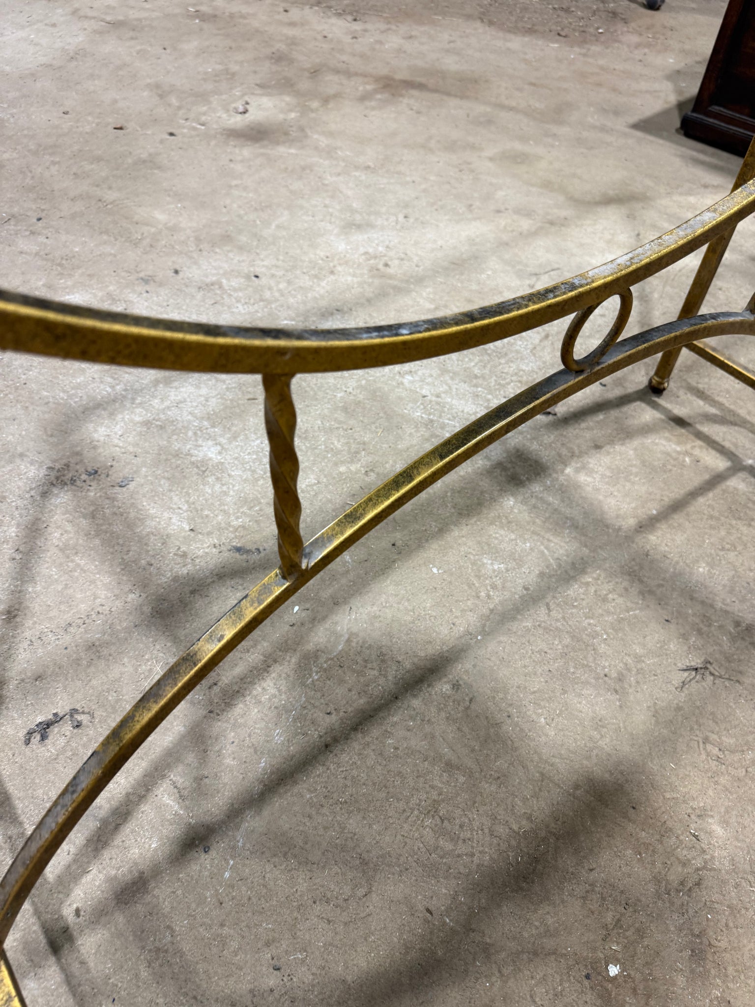 This elegant console table combines a lustrous gold-finished metal base with a removable glass surface, making maintenance effortless. The piece bears subtle signs of use that add authentic charm while maintaining structural integrity. Ideal for entryways or living rooms, it delivers both visual sophistication and practical everyday performance.