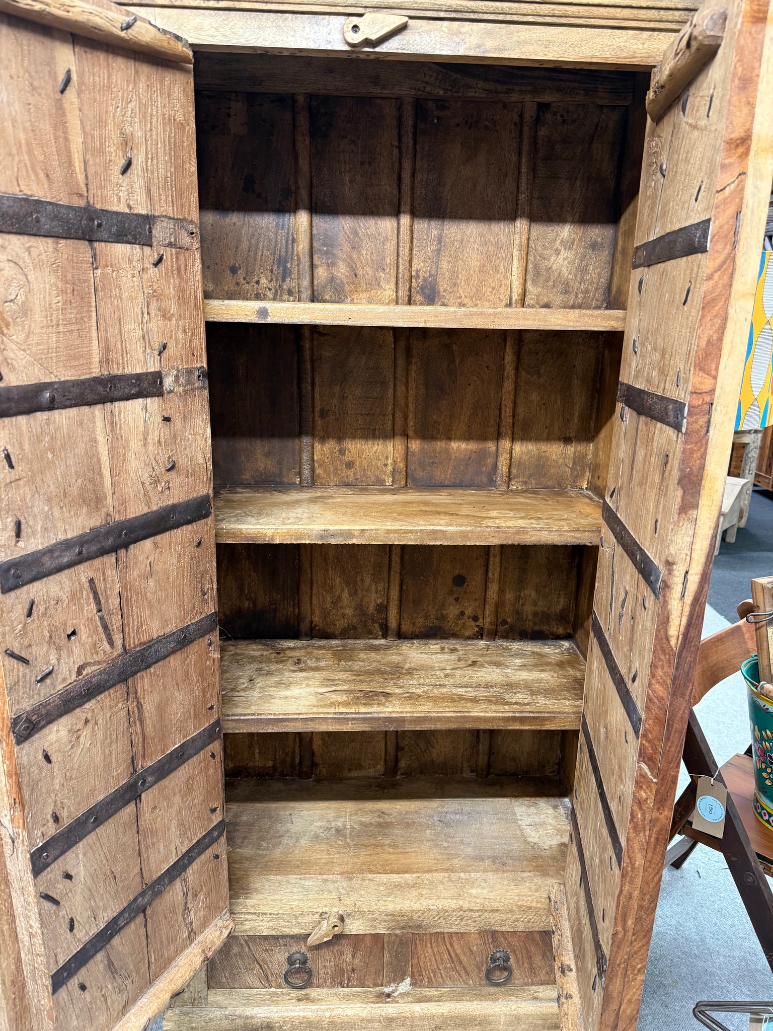 This beautiful hardwood Indian cupboard is sturdy and generally in great shape. It shows some minor marks, but nothing significant. Featuring three hardwood shelves inside, it's ideal as a linen cupboard or larder. Please note, it’s quite heavy and cannot be taken apart.