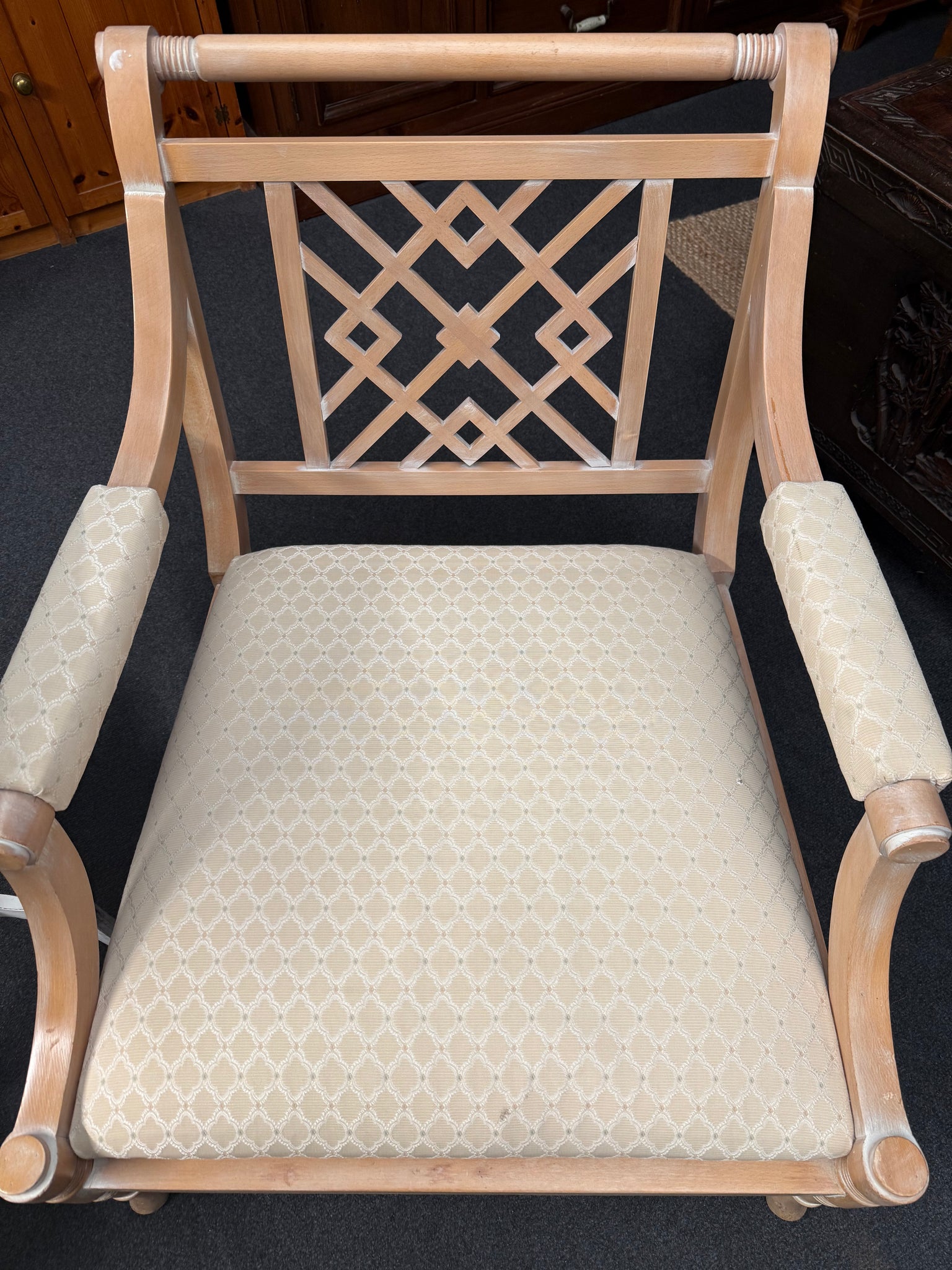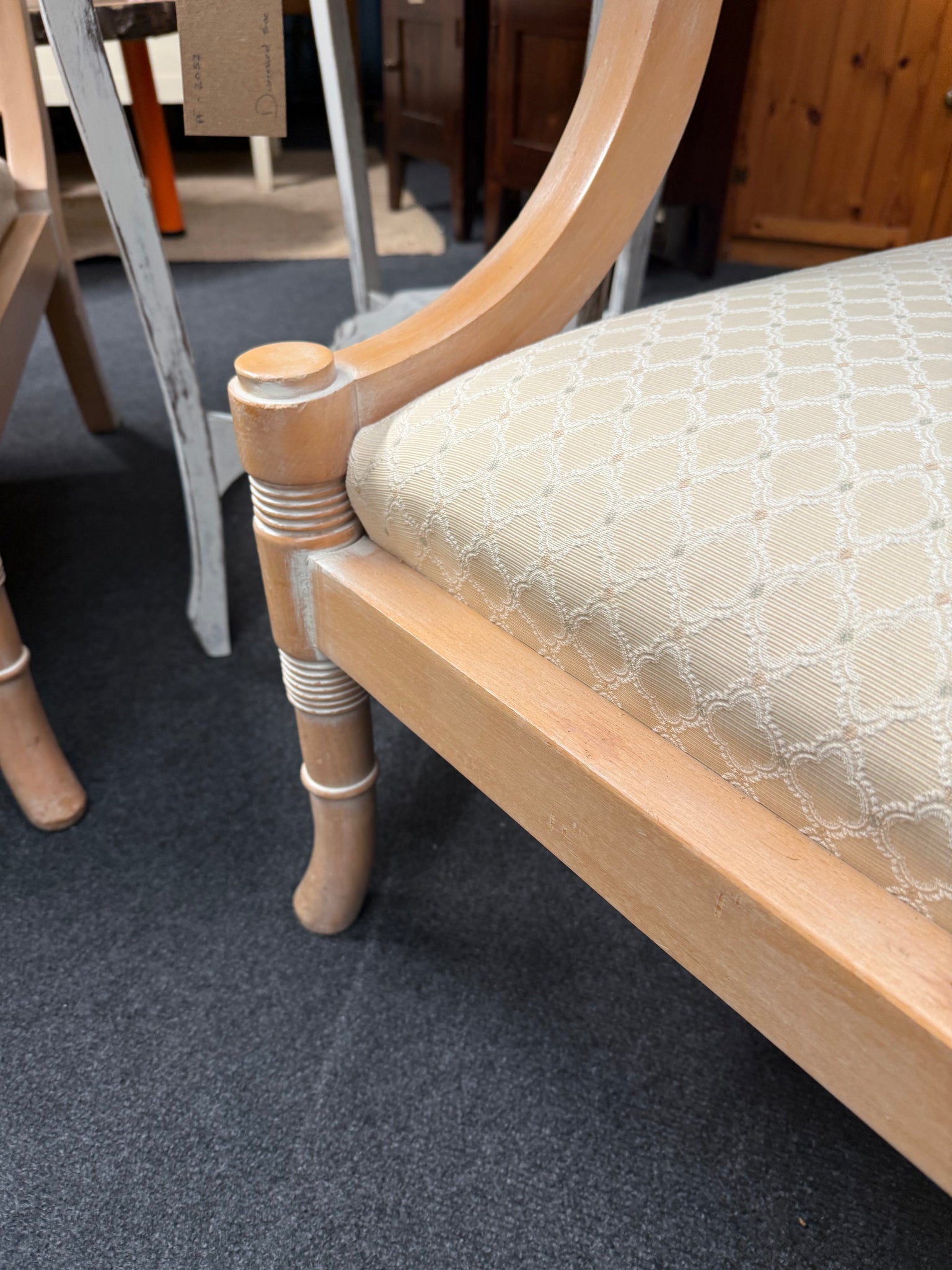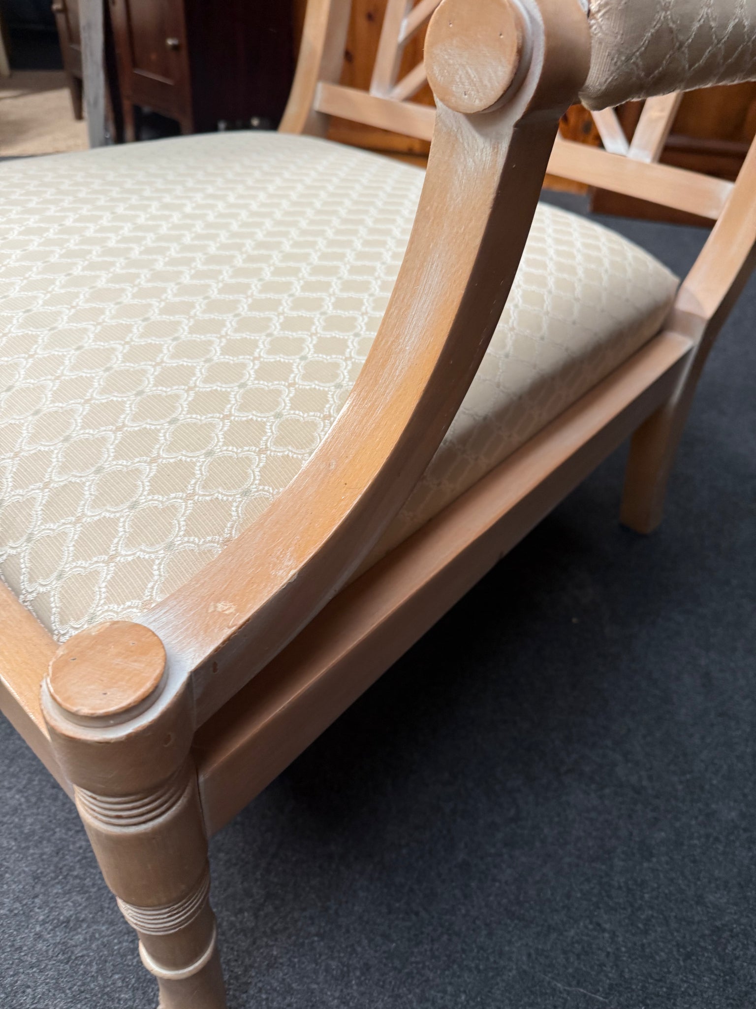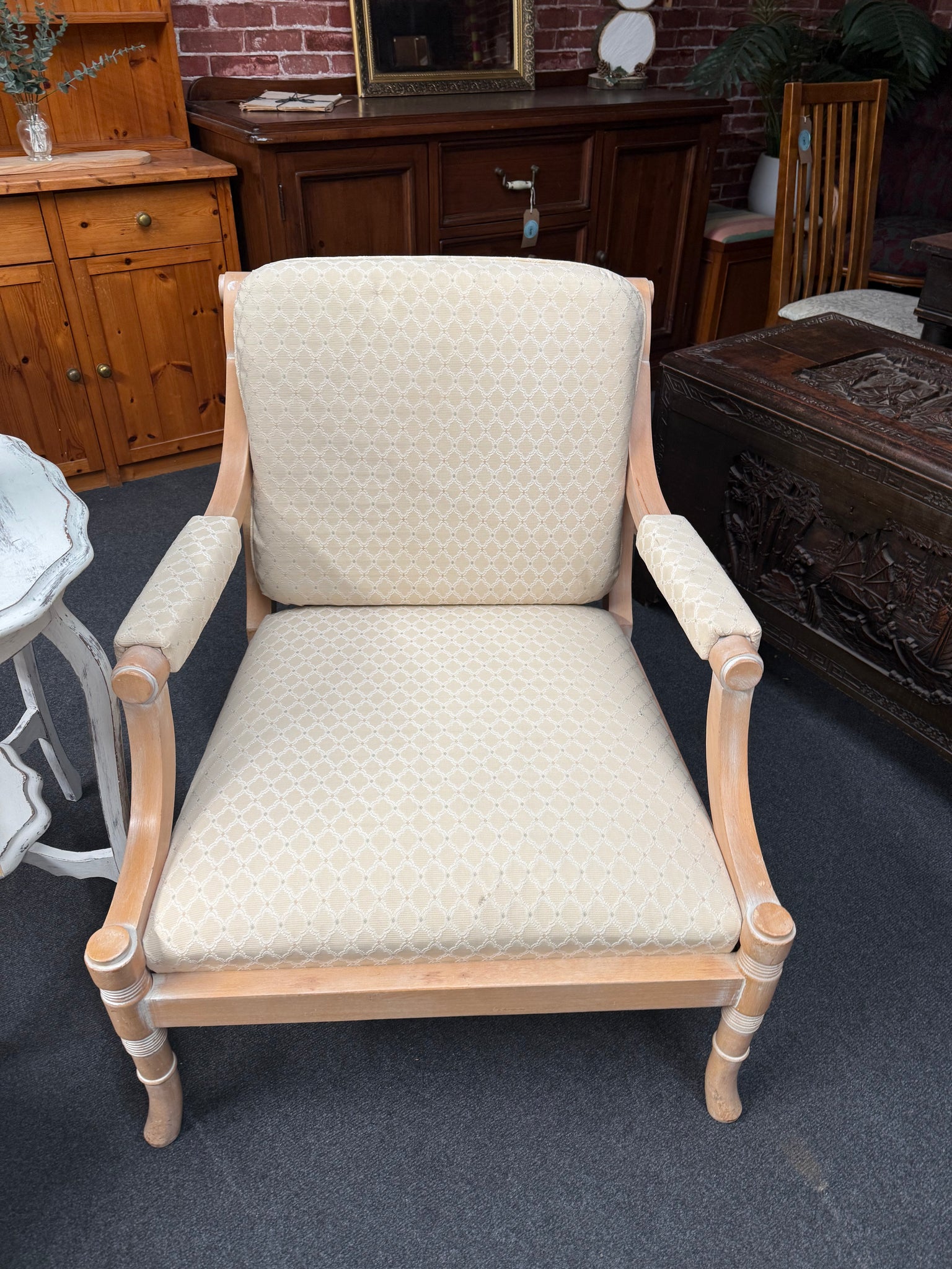 A charming limed armchair with solid construction and dependable condition. While it bears the gentle patina of age with minor surface marks, these only add to its character. Ideal for creating a cosy reading corner or adding vintage appeal to any room.