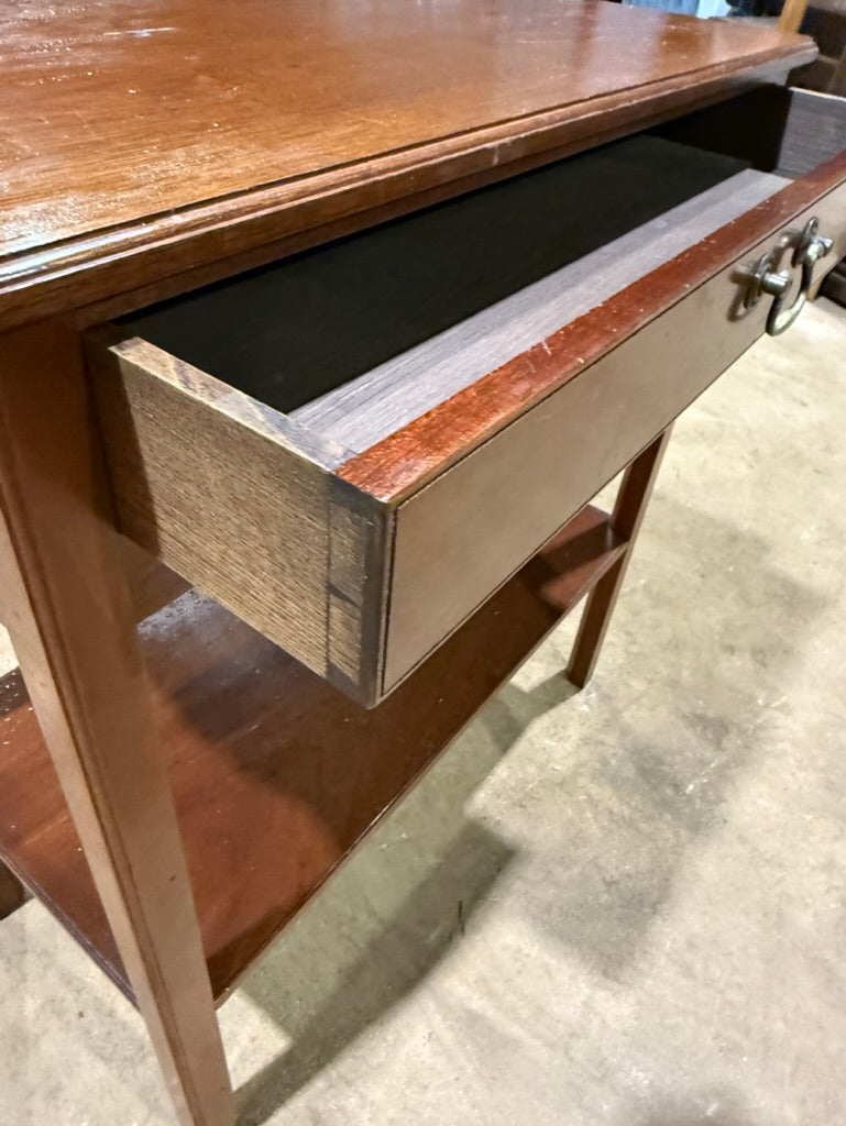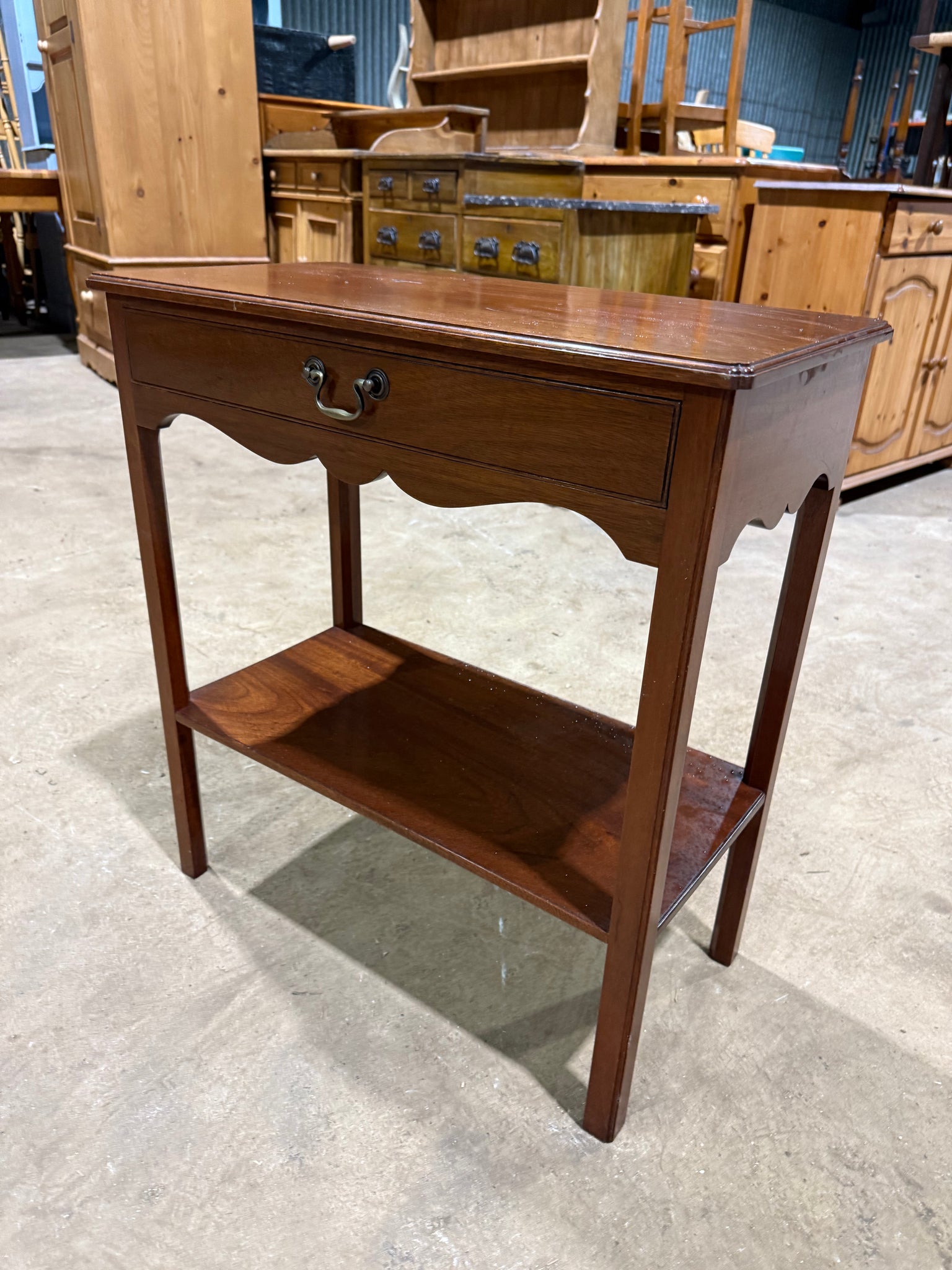 A classic mahogany hall table from Redman & Hales, offering practical storage with a single dovetail-jointed drawer and lower shelf. The piece shows its age with minor surface marks consistent with use, but remains structurally solid and fully functional.