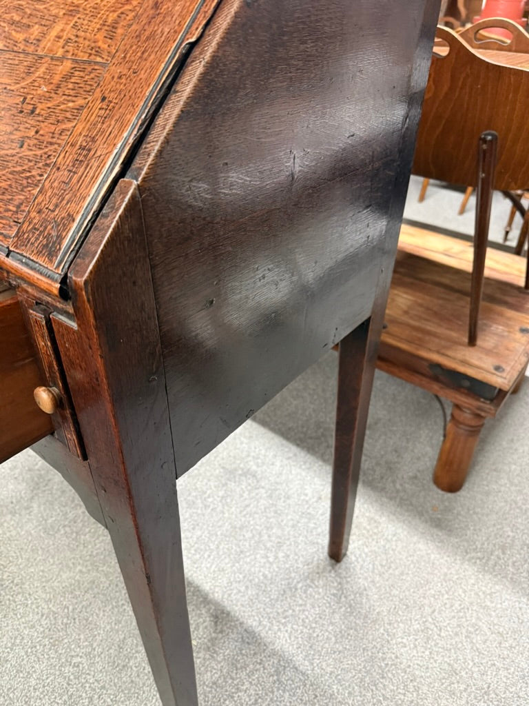 A characterful oak bureau combining timeless design with practical functionality. This well-preserved piece features a pull-down writing desk with multiple drawers and a substantial dovetail-jointed drawer, offering generous storage for documents, stationery, and personal items. Showing authentic signs of age and use, it retains its structural integrity and solid craftsmanship. An ideal addition to period homes, studies, or anyone seeking quality vintage furniture with genuine character and storage solution