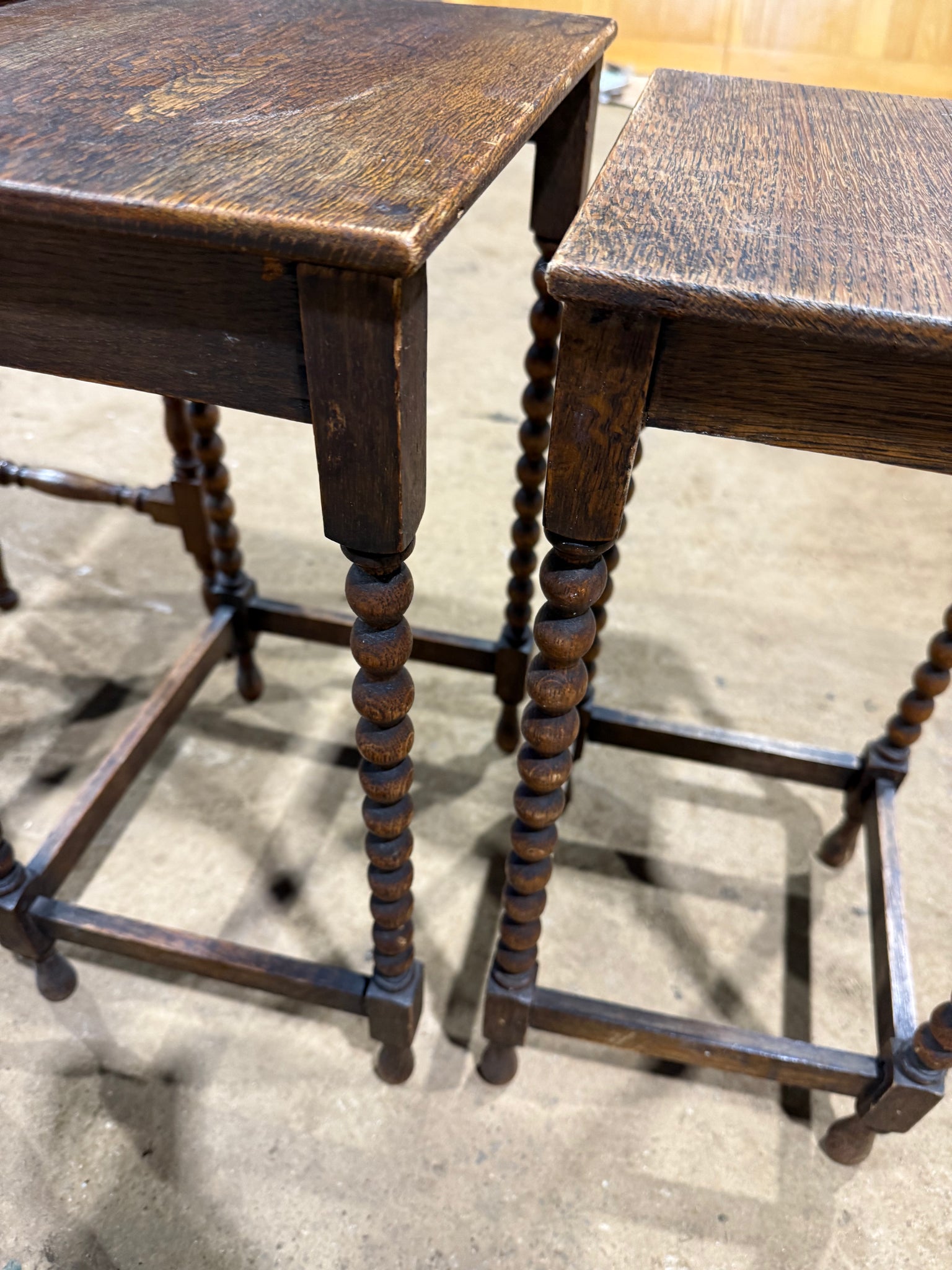 A charming three-piece oak nesting set with one large table and two smaller companions in different finishes. Perfect for an eclectic style, these sturdy pieces are in overall good condition with only minor marks that add character. Stack them together or display separately for flexible, versatile living.