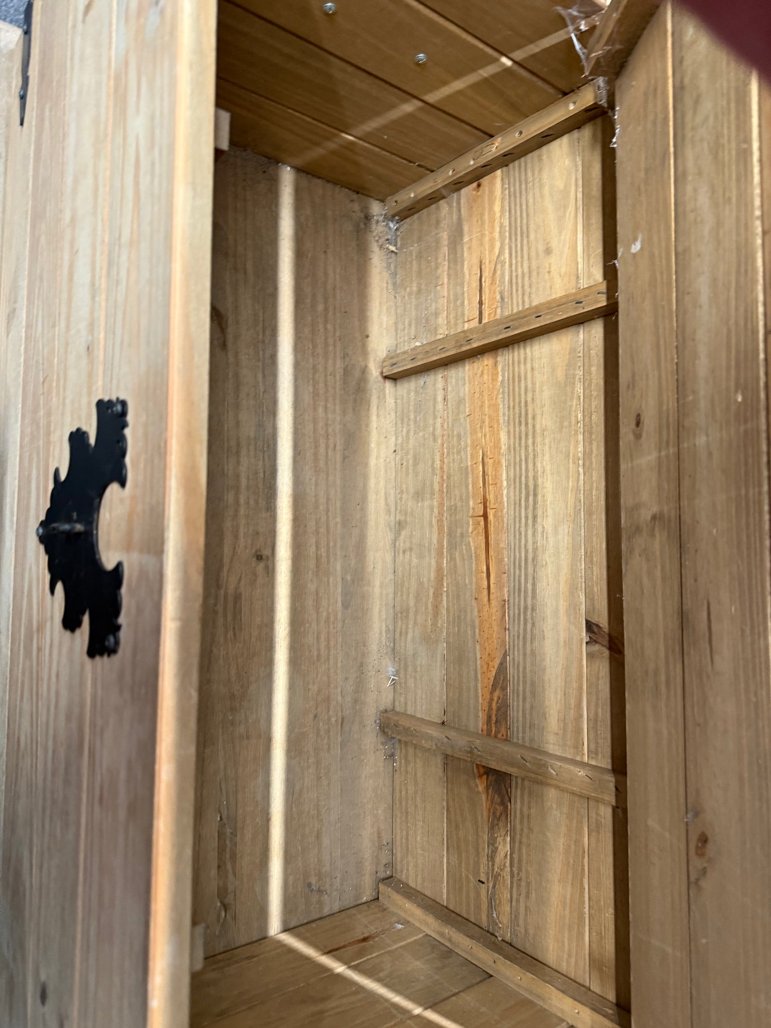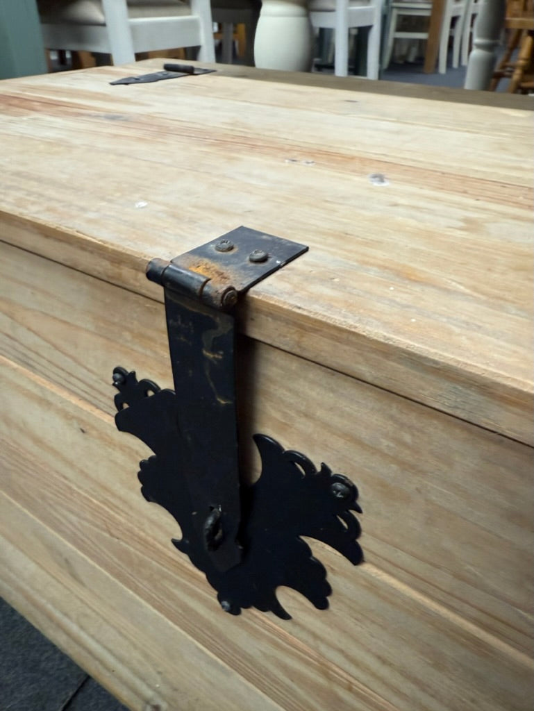 A charming blanket box crafted from solid pine with authentic rustic character. While it bears the natural patina of age with minor surface marks, the piece remains structurally robust and fully functional. The hinged lid opens to provide generous storage space.