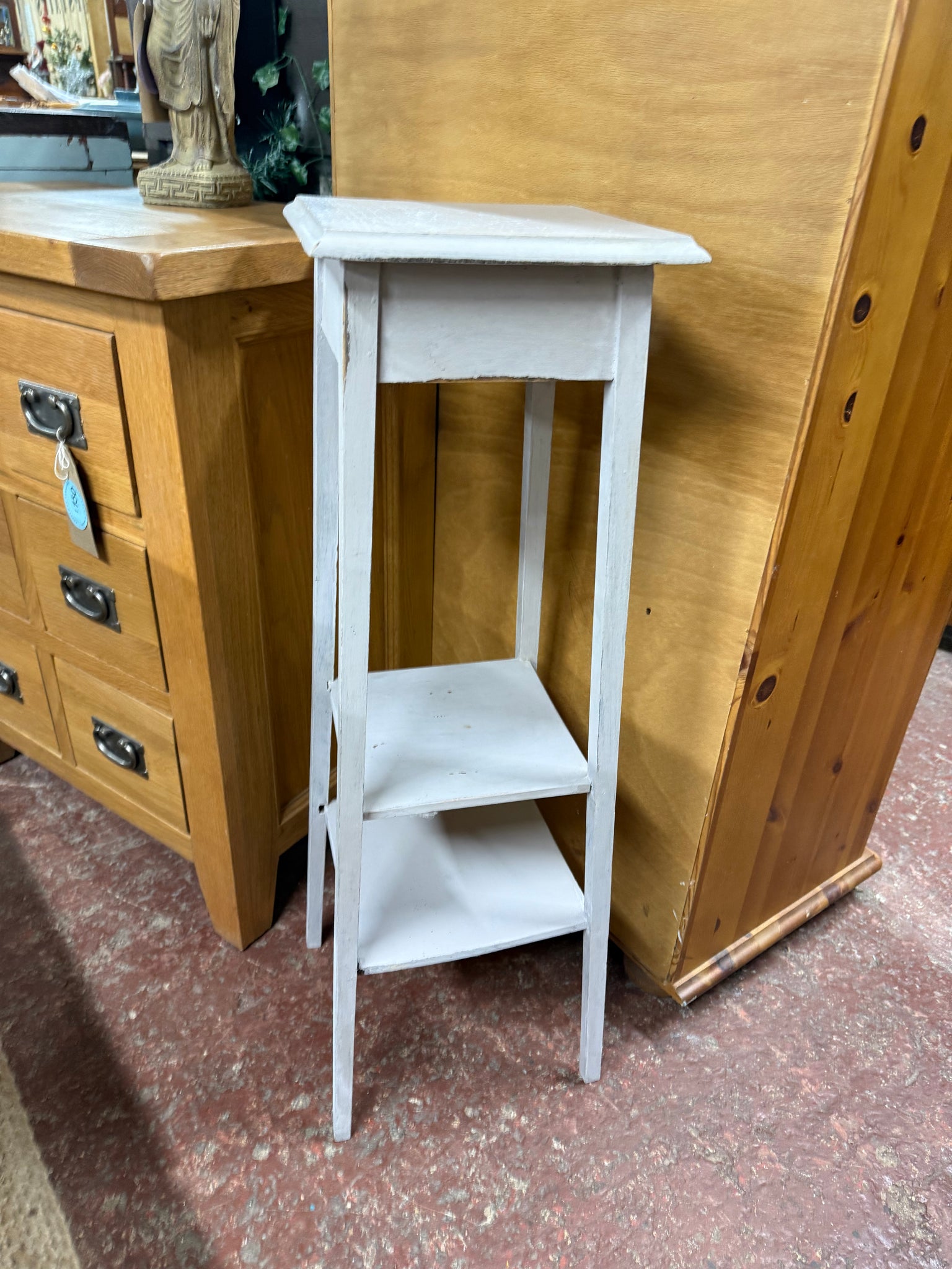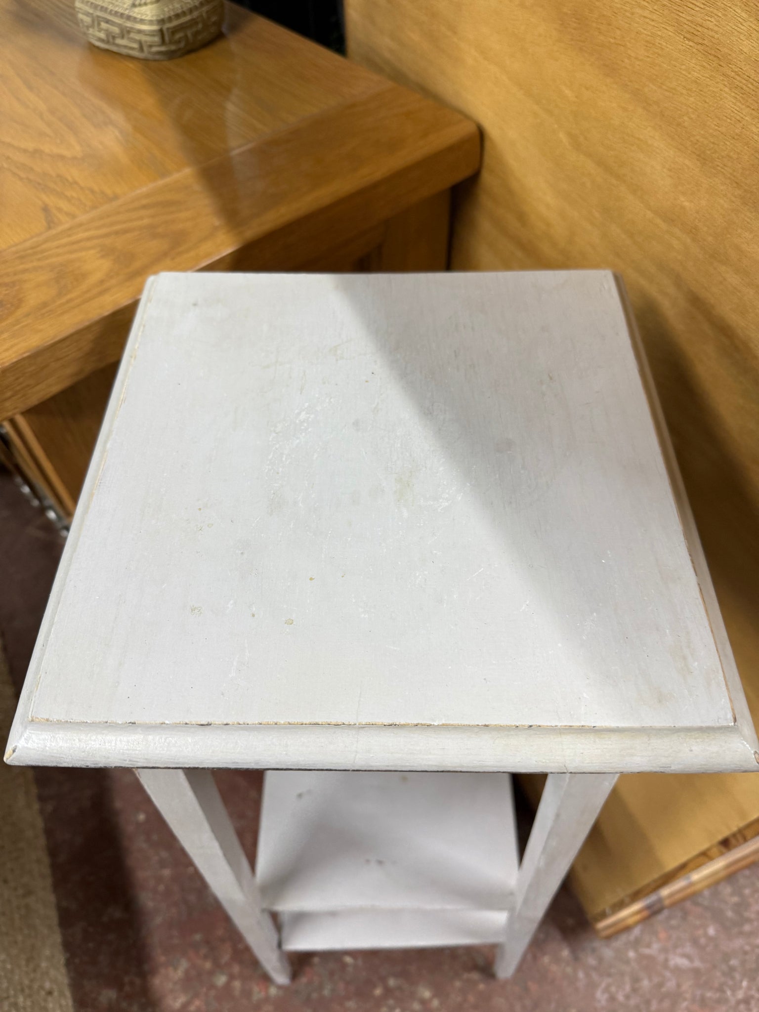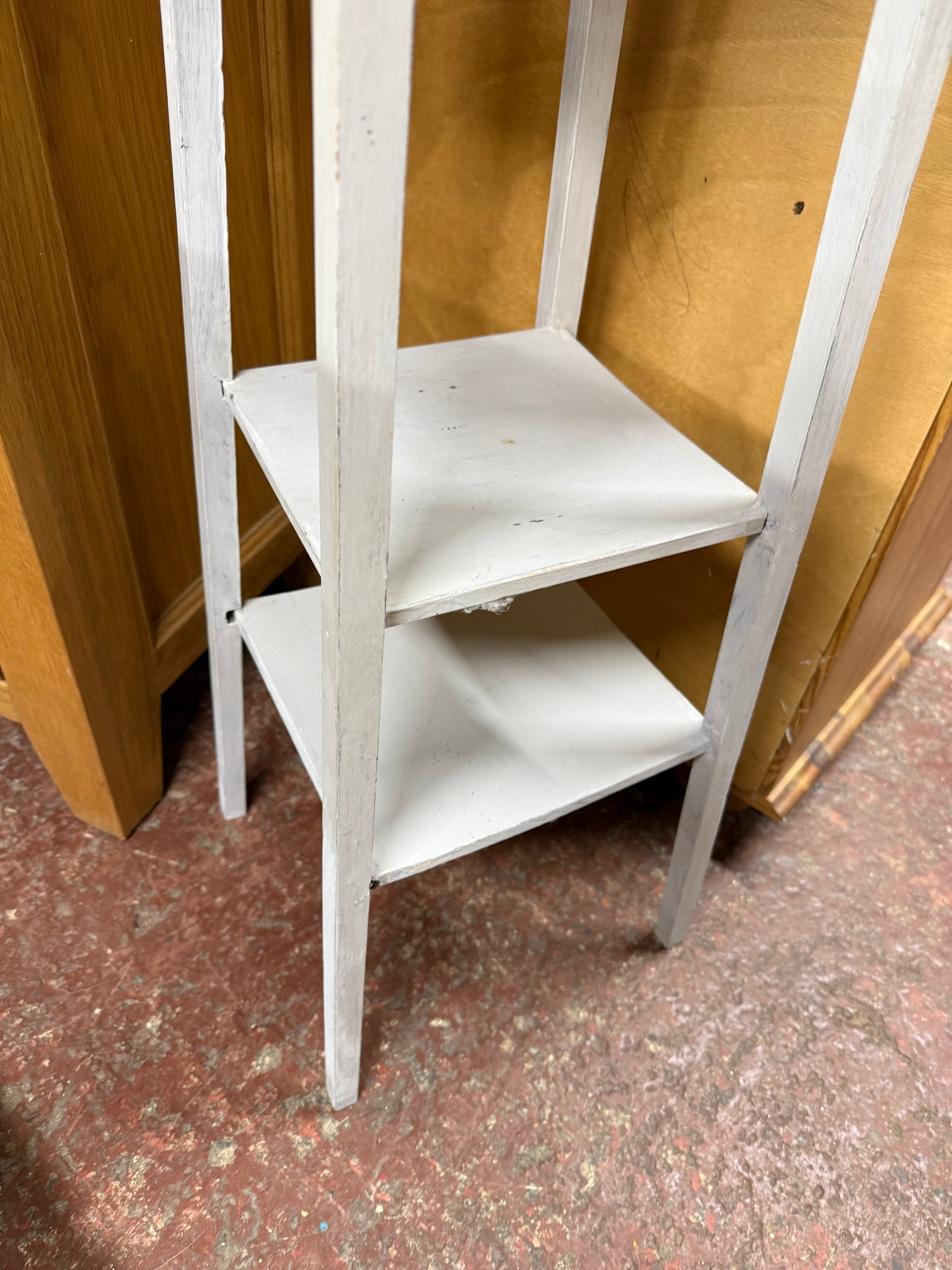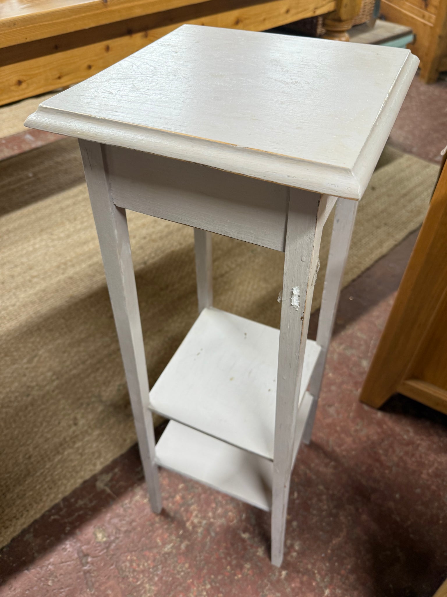 A charming wooden plant stand featuring a soft baby blue finish that shows character from previous use. The piece includes a practical lower shelf, ideal for storing plant accessories or displaying smaller items. While the paint could benefit from some refreshing in places, the stand remains structurally solid and in good working order.