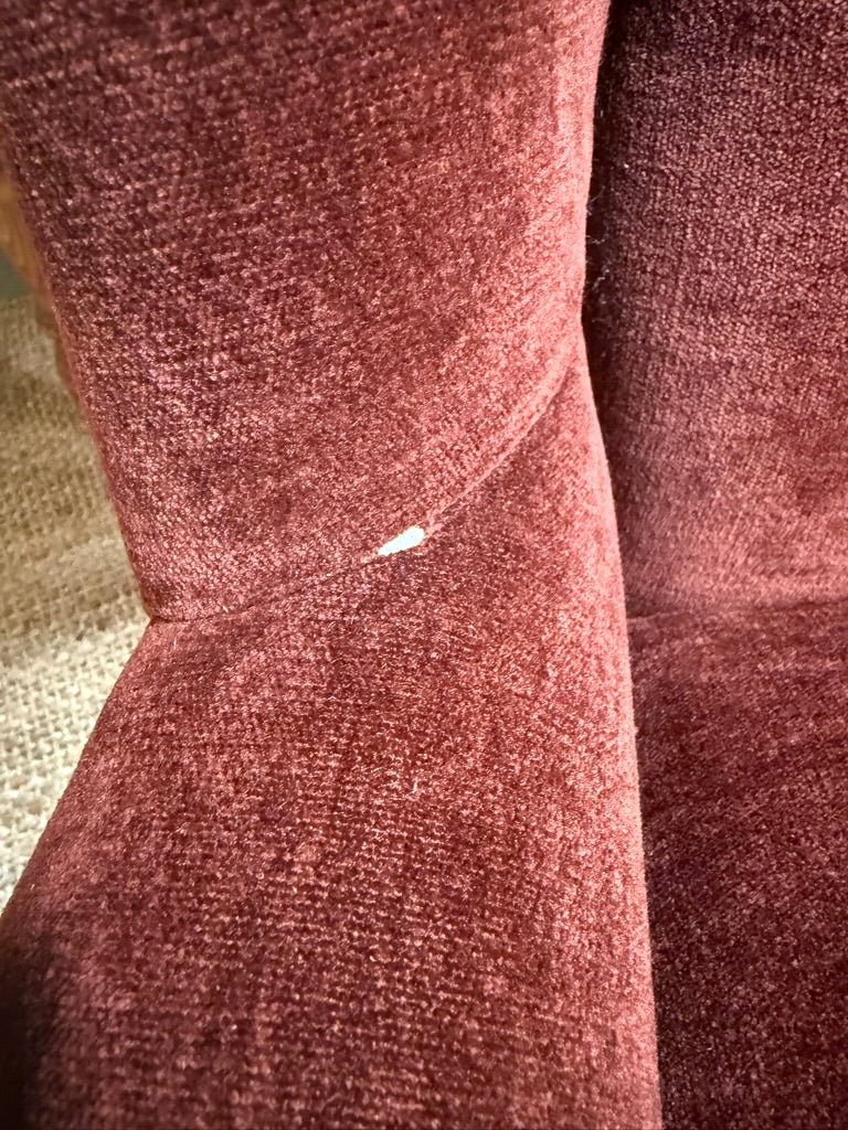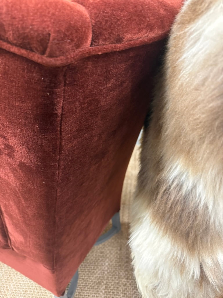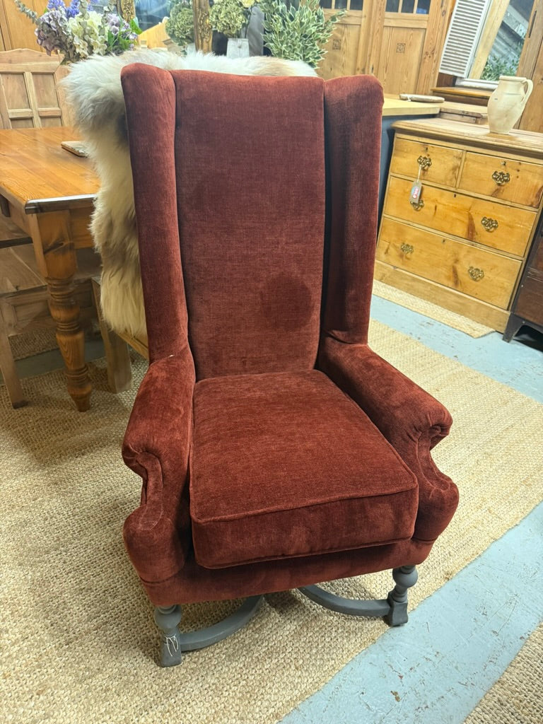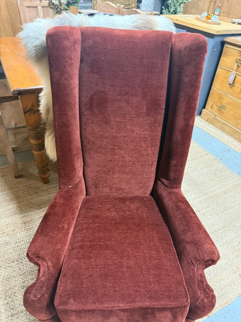A charming rust-toned armchair with solid construction and excellent overall condition. Features distinctive black cross-banded legs that add visual interest to any room. There's a minor tear that's easily repairable. Ideal for creating a cosy reading nook or positioning by the fireplace for a welcoming focal point.