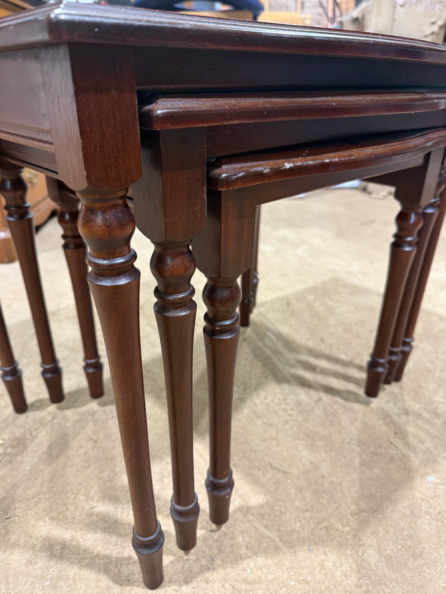 • Load image into Gallery viewer, A charming vintage nest of tables by Stag, offering practical storage and display space in a compact footprint. Structurally sound with authentic patina from years of use—minor marks add to its character rather than detract from it. Ideal for positioning beside a sofa, these tables stack neatly when not needed and separate easily for flexible room arrangements.