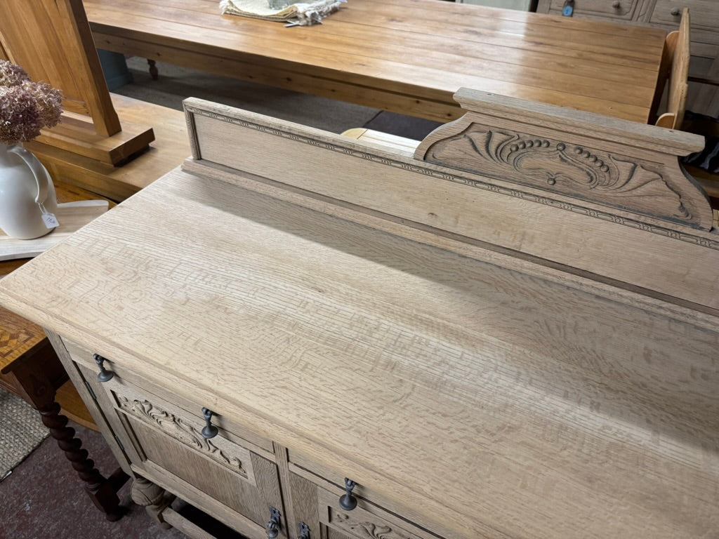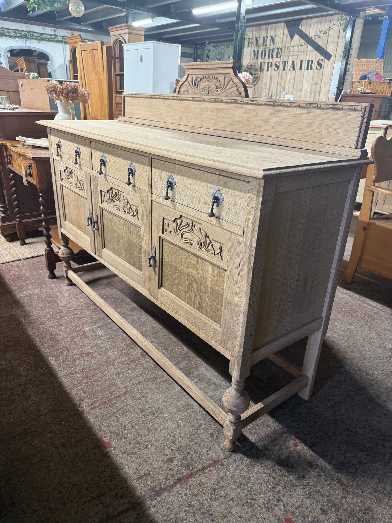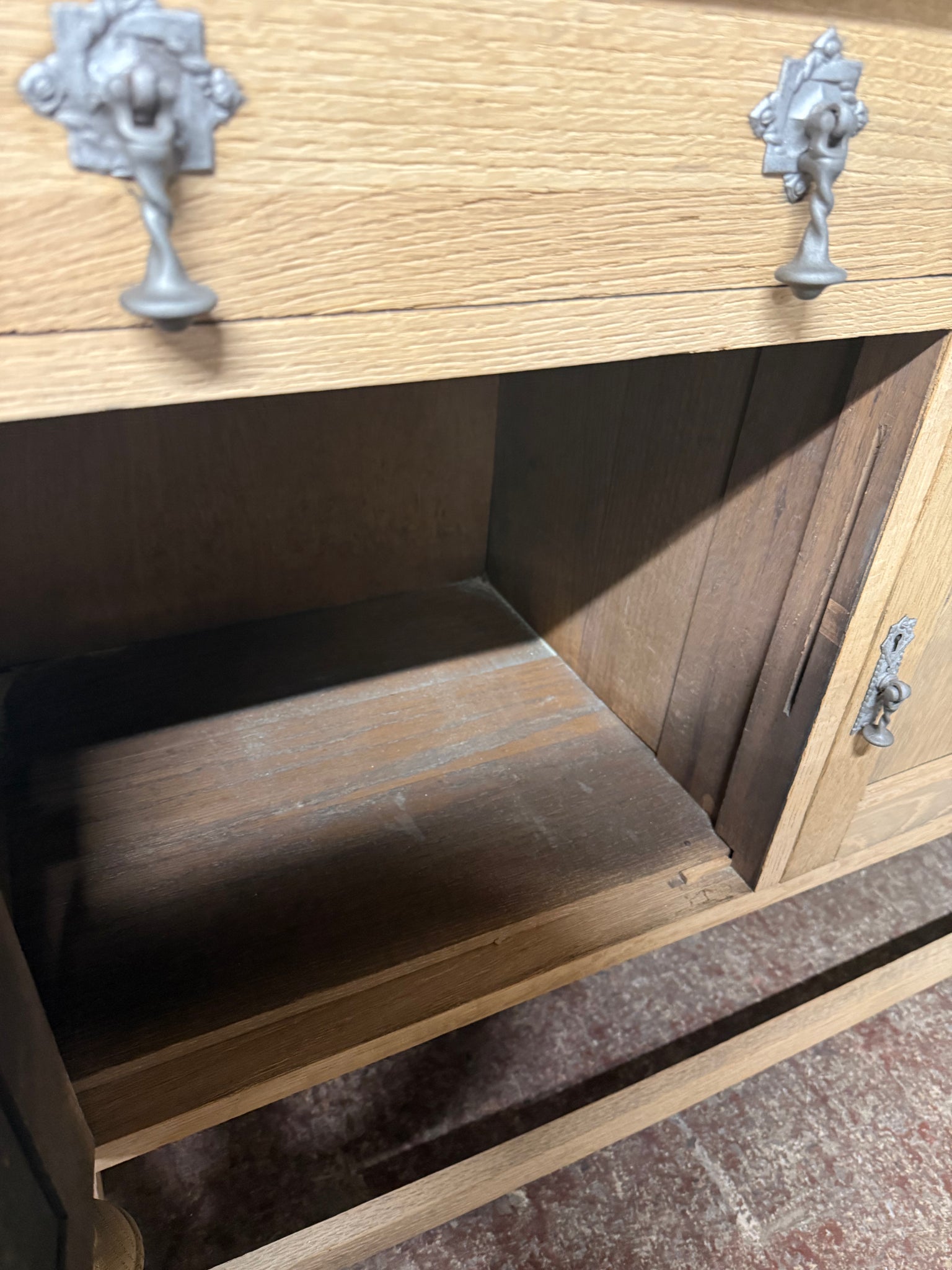 This charming 20th-century oak sideboard has been fully stripped to its natural finish and could benefit from a wax coating to help protect it. It provides plenty of storage with three dovetail jointed drawers above three cupboards, including one with an internal shelf. One handle might need a little TLC.