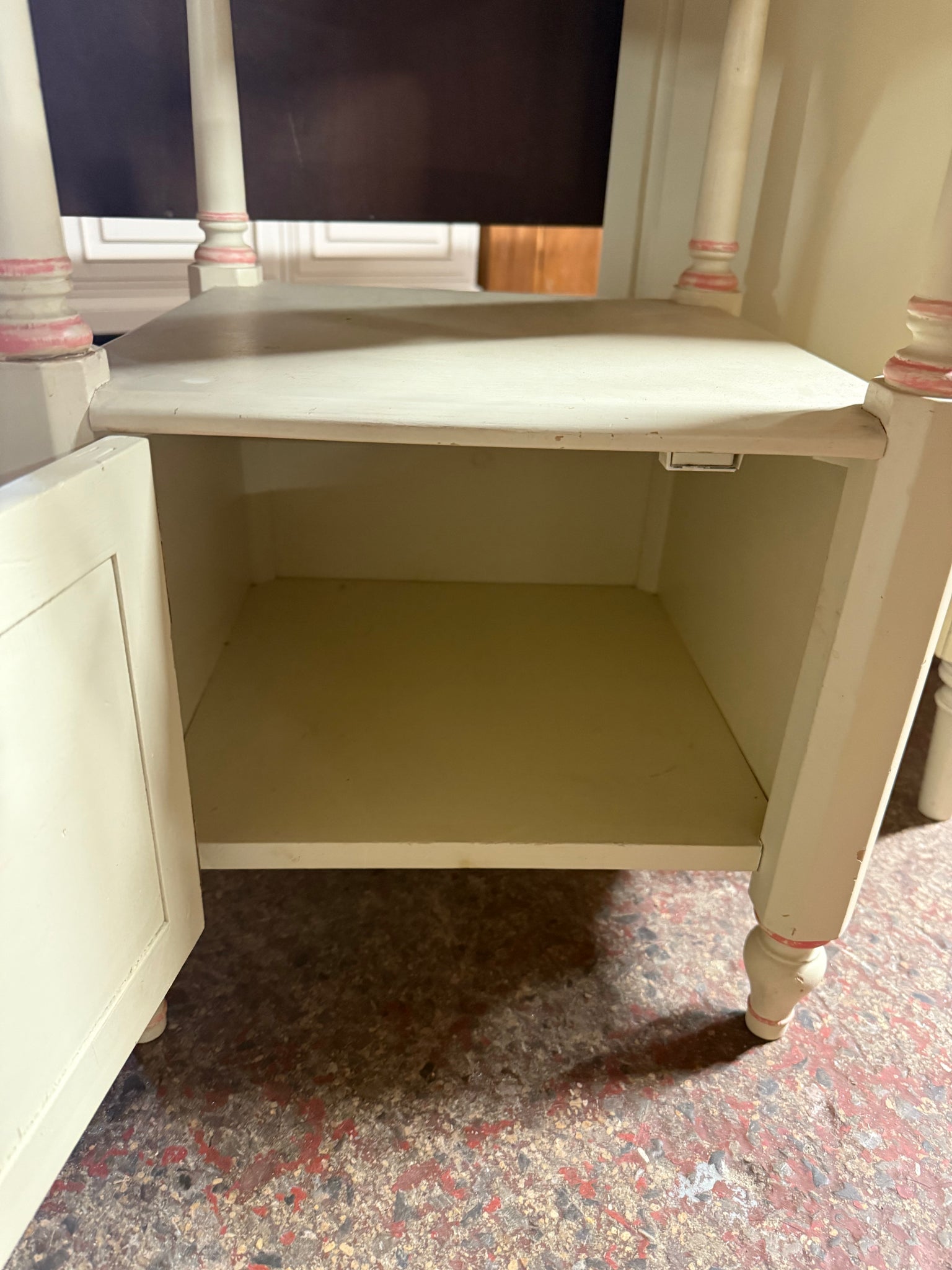 This delightful cream and pink tall side table has been hand-painted by its previous owners and might need a little touch-up. It includes one small drawer, a shelf, and a cupboard, providing useful storage options.