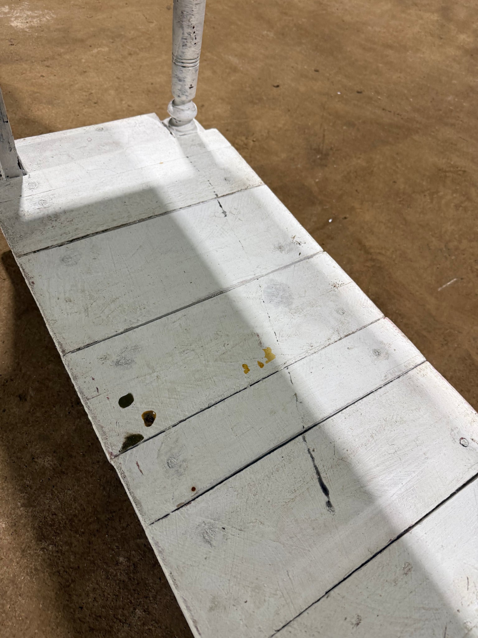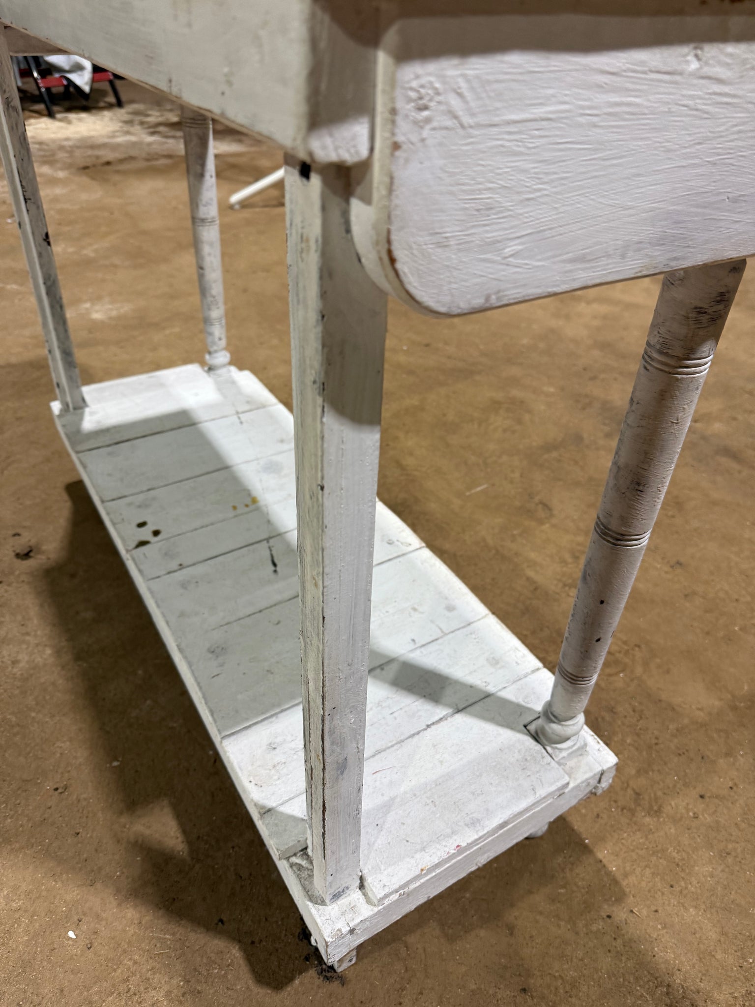 A charming solid wood hall table with authentic vintage character. The piece is structurally robust and well-maintained overall, featuring a practical lower shelf ideal for storing shoes, baskets, or decorative items. The white-painted base could benefit from a fresh coat of paint if you prefer a more polished look. An excellent addition to any hallway seeking warmth and functionality.
