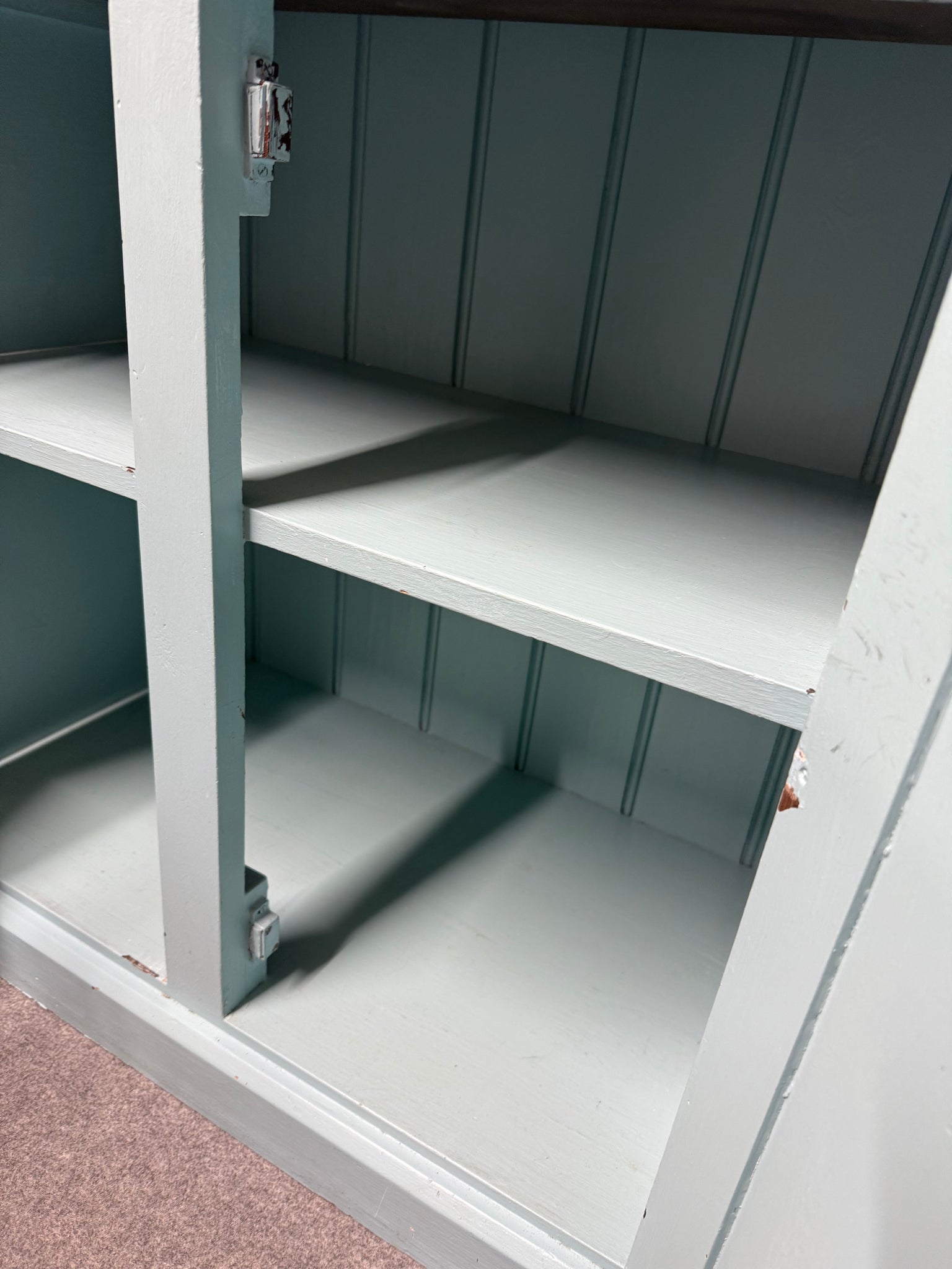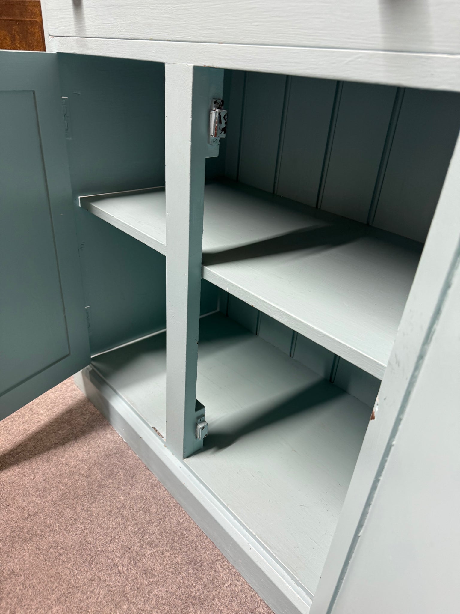 Discover the perfect blend of vintage charm and practical storage with this delightful pine dresser in soft baby blue. Boasting thoughtful design across three storage zones—open shelving, a quality dovetail-jointed drawer, and dual cupboard space—it's ideal for keeping your essentials beautifully organised. The gentle wear marks only add to its authentic character and appeal. Best of all, it separates into two pieces for convenient moving and positioning. A wonderful addition to any home seeking both style
