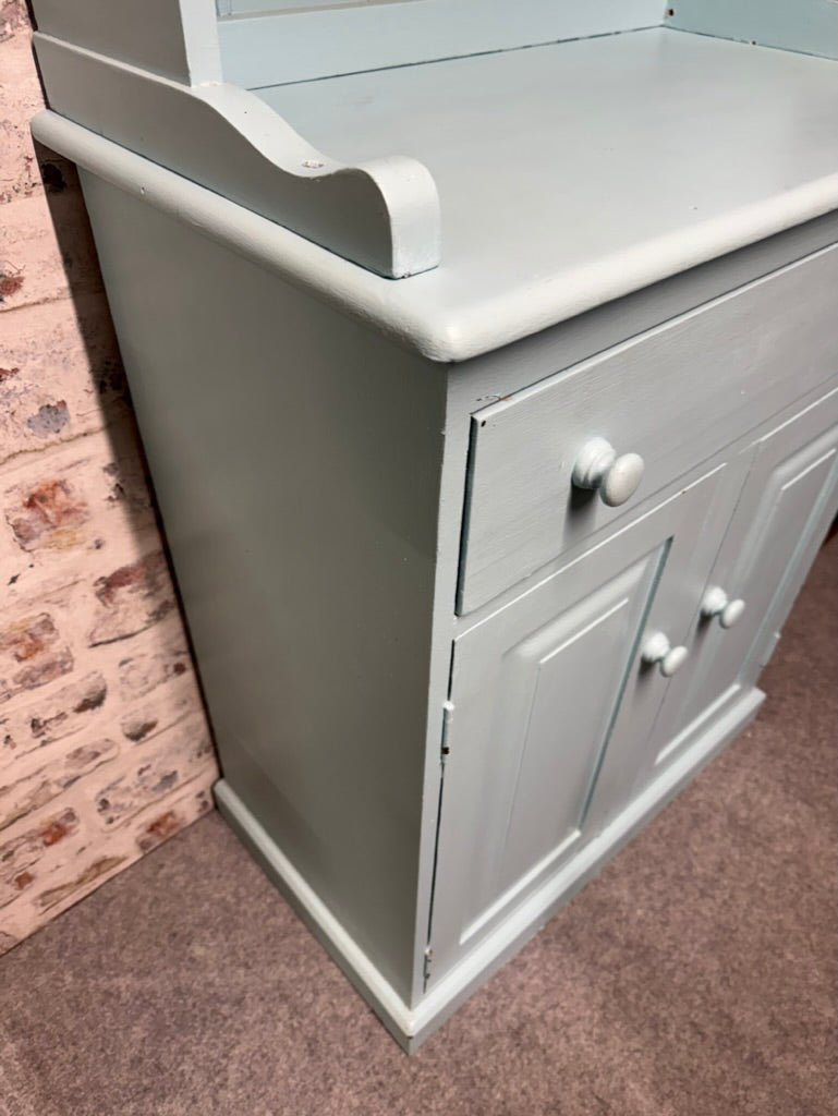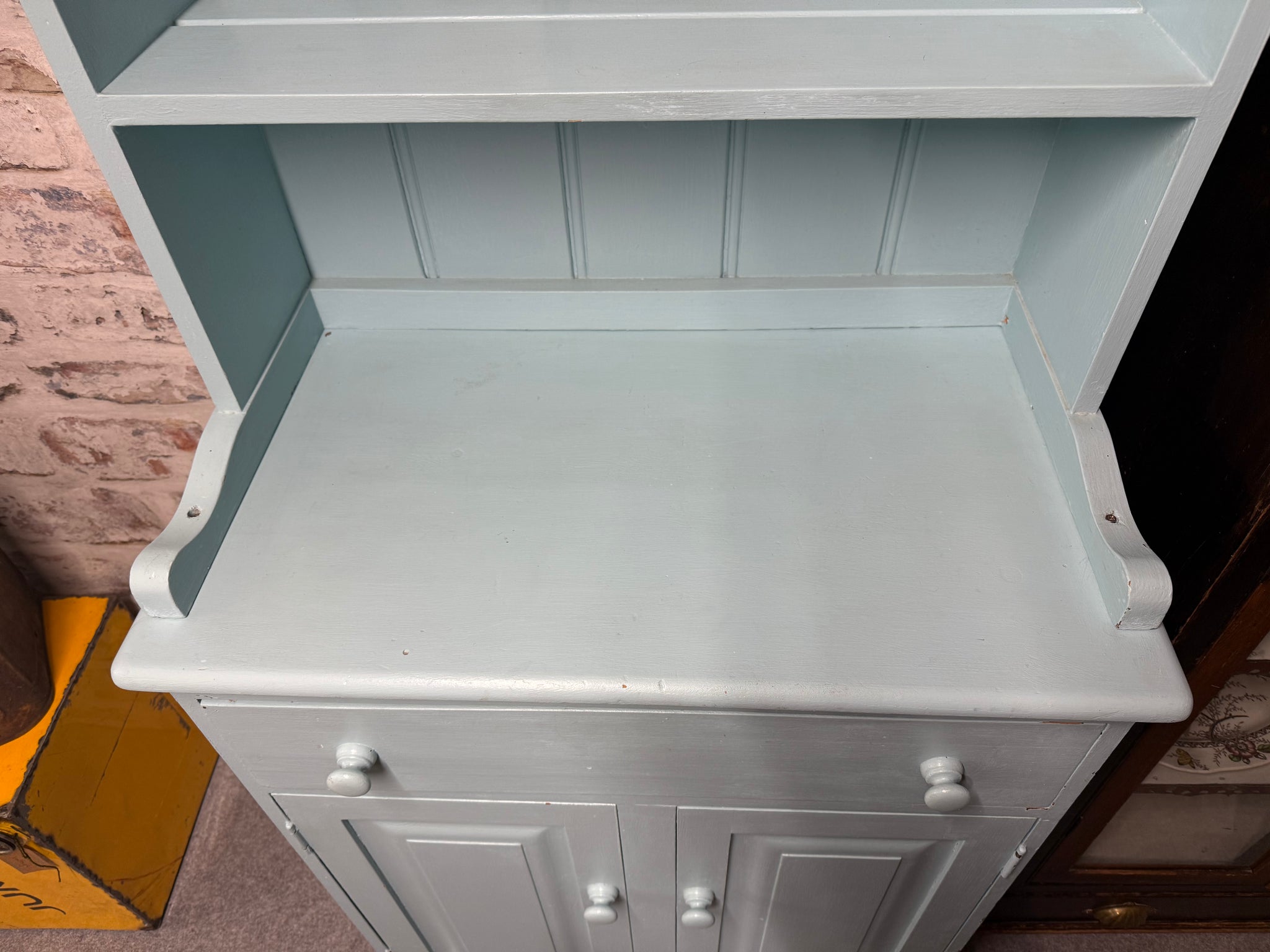 • Load image into Gallery viewer, Discover the perfect blend of vintage charm and practical storage with this delightful pine dresser in soft baby blue. Boasting thoughtful design across three storage zones—open shelving, a quality dovetail-jointed drawer, and dual cupboard space—it's ideal for keeping your essentials beautifully organised. The gentle wear marks only add to its authentic character and appeal. Best of all, it separates into two pieces for convenient moving and positioning. A wonderful addition to any home seeking both style