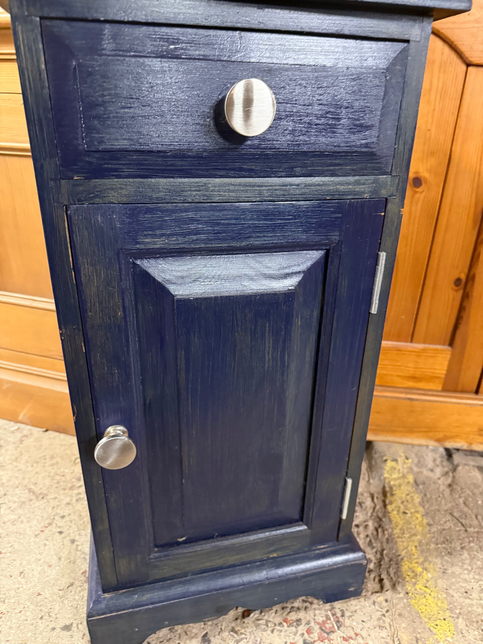 Built from solid pine with genuine dovetail joinery, this cupboard arrives in navy paint applied by previous owners. The design combines a shallow drawer with a lower storage cupboard, offering flexible placement in a bedroom, kitchen, or hallway.