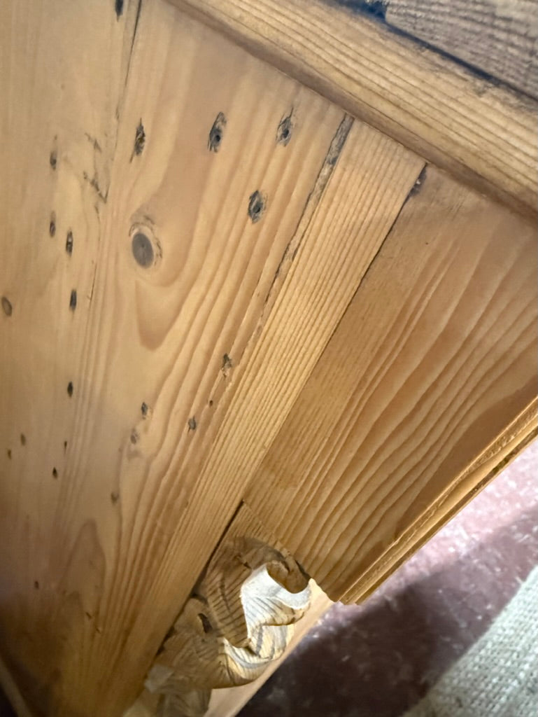 This charming solid pine wine rack holds 18 bottles and features a sturdy gallery back design. It includes a spacious drawer for extra storage. While it's previously used and shows some minor marks, it remains in great overall condition.